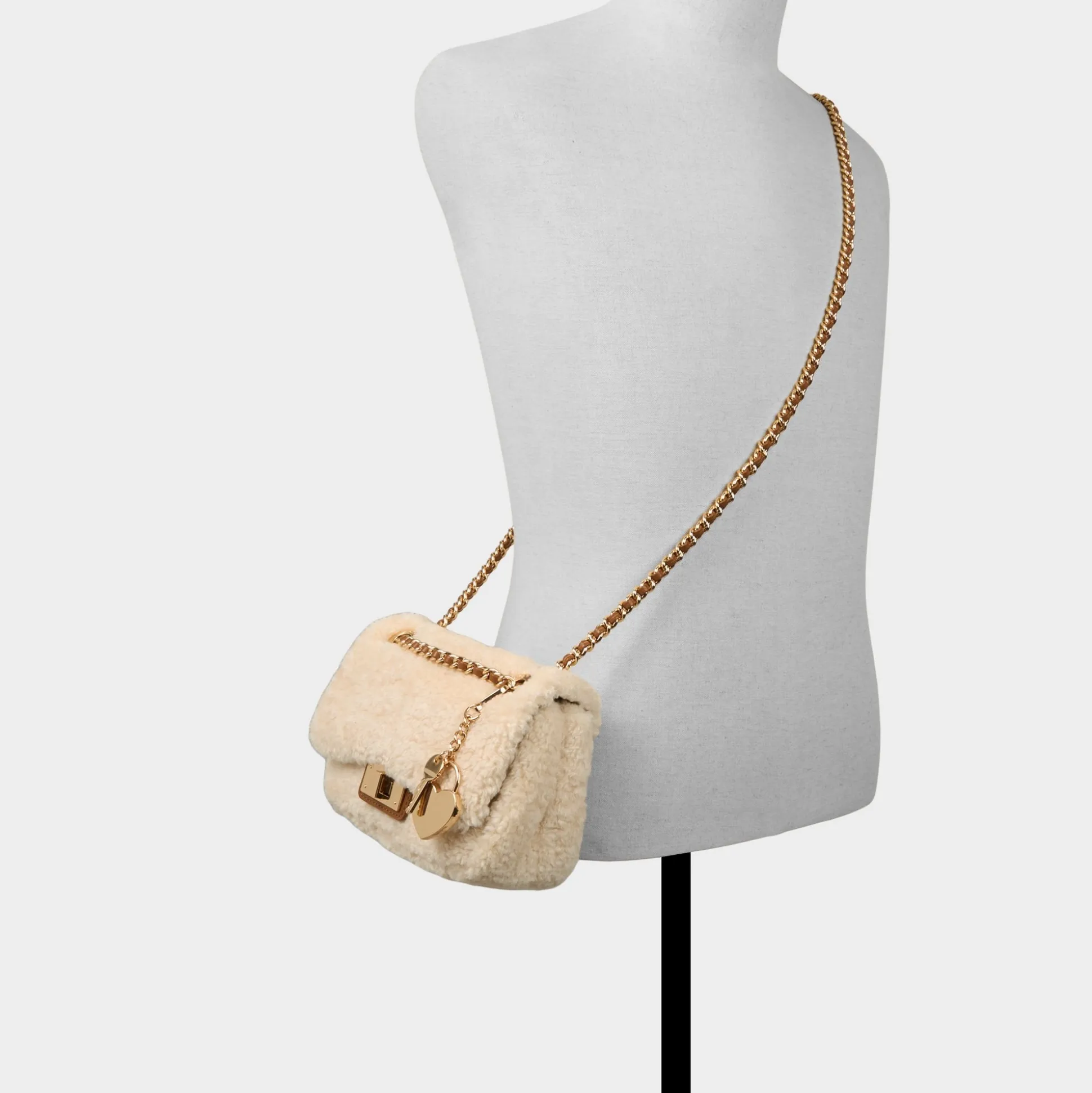 Soft teddy-shearling wraps a mini bag in cozy charm, offset by a gleaming gold-tone chain heart and a tidy turn-lock that flips from day to night with a single click. Carry it cross-body on coffee runs or tuck it under your arm for holiday dinners, finishing looks with a playful edge.
