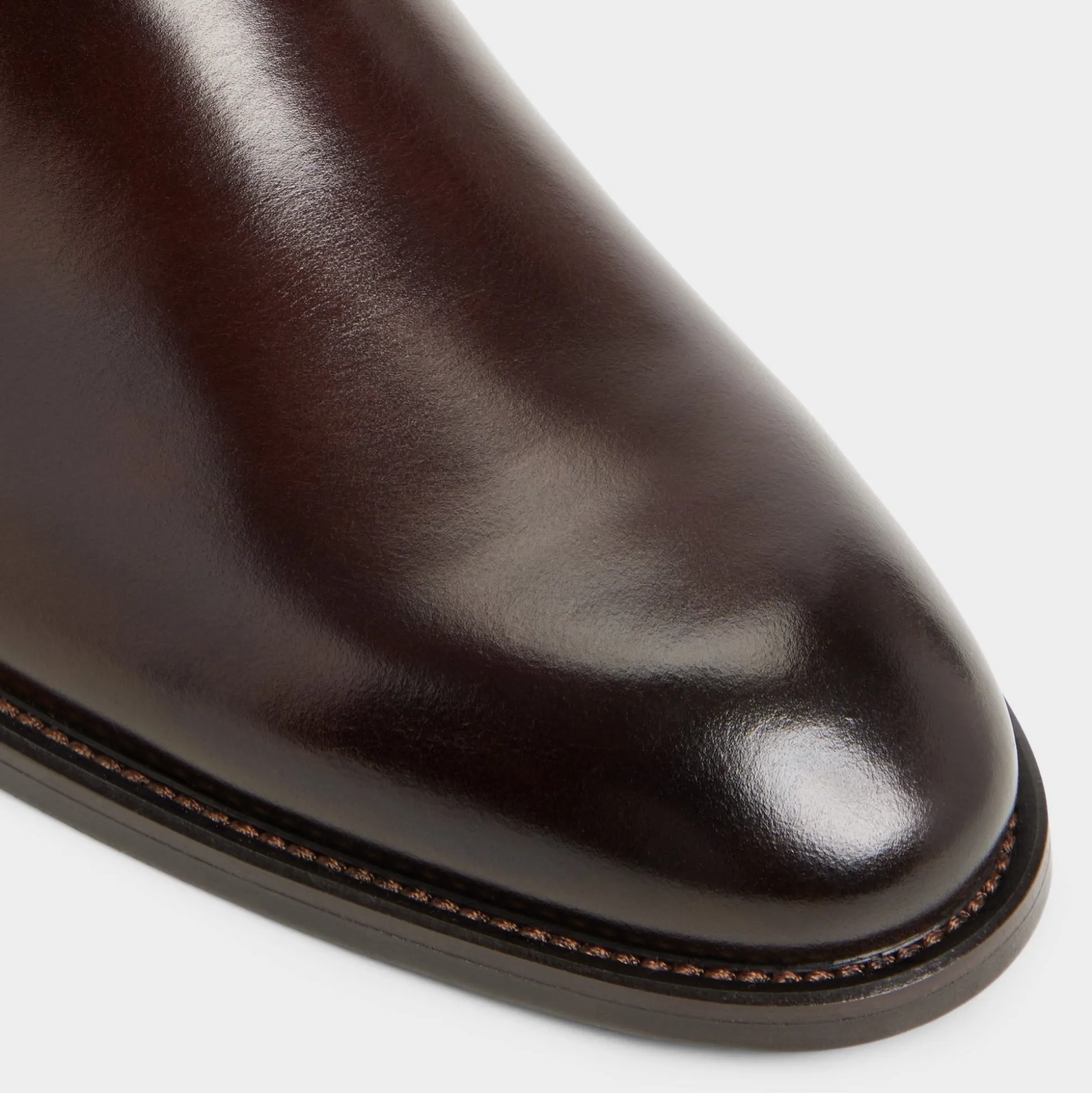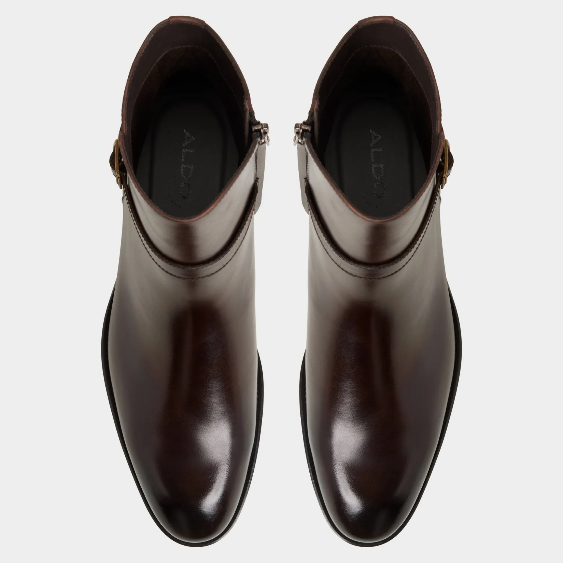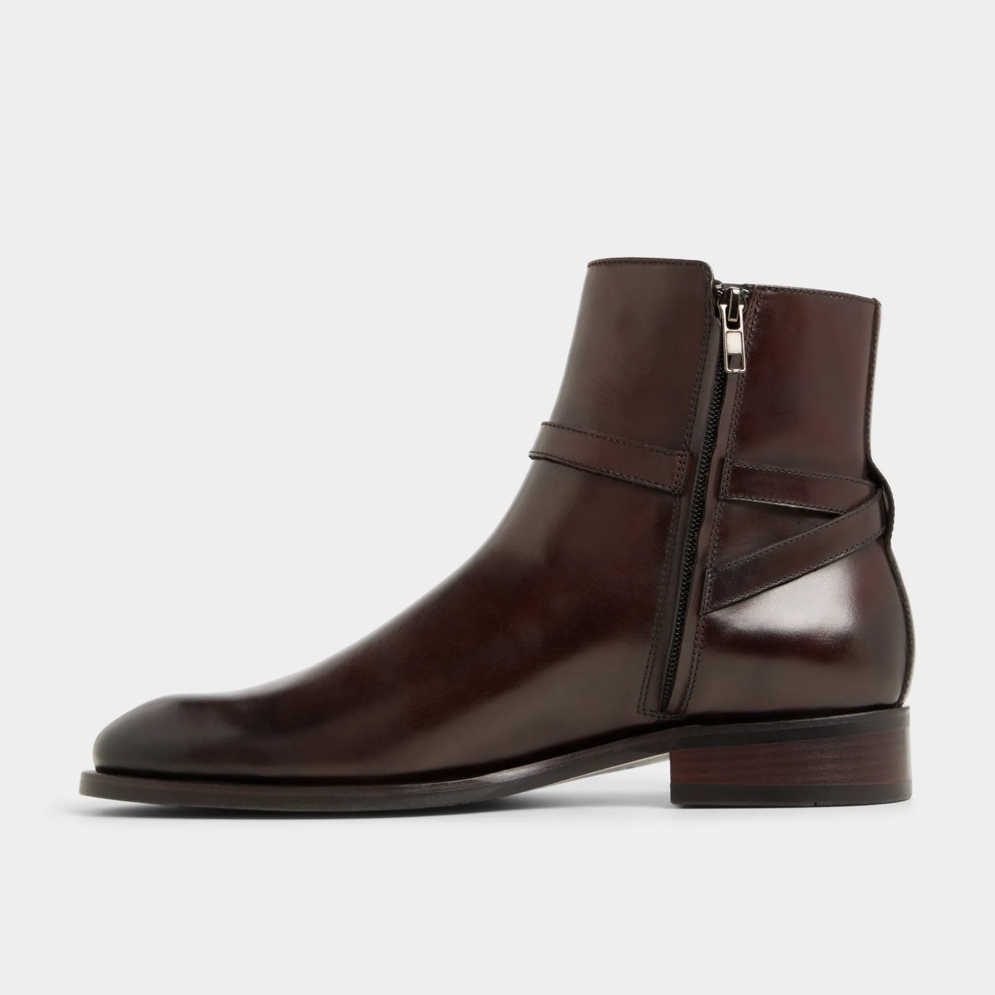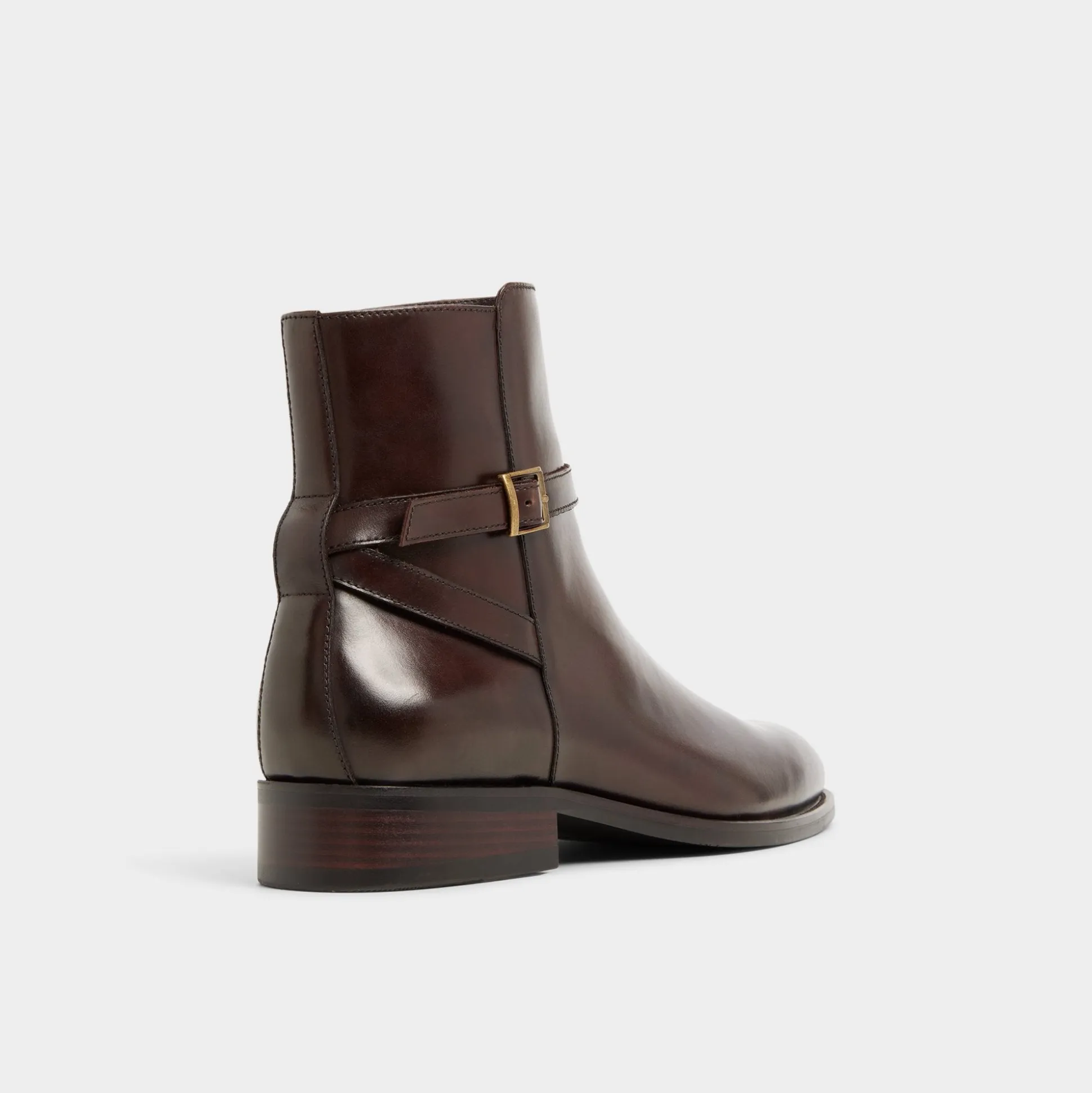 Rich espresso leather wraps a boot-ready silhouette, cinched by an ankle strap that adds rebel energy while a low stacked heel keeps the city-profile grounded and comfortable for day-to-night versatility. Anchor grey wool trousers for client lunches or roll dark denim for gigs, proving the rebel energy travels from boardroom to after-hours.