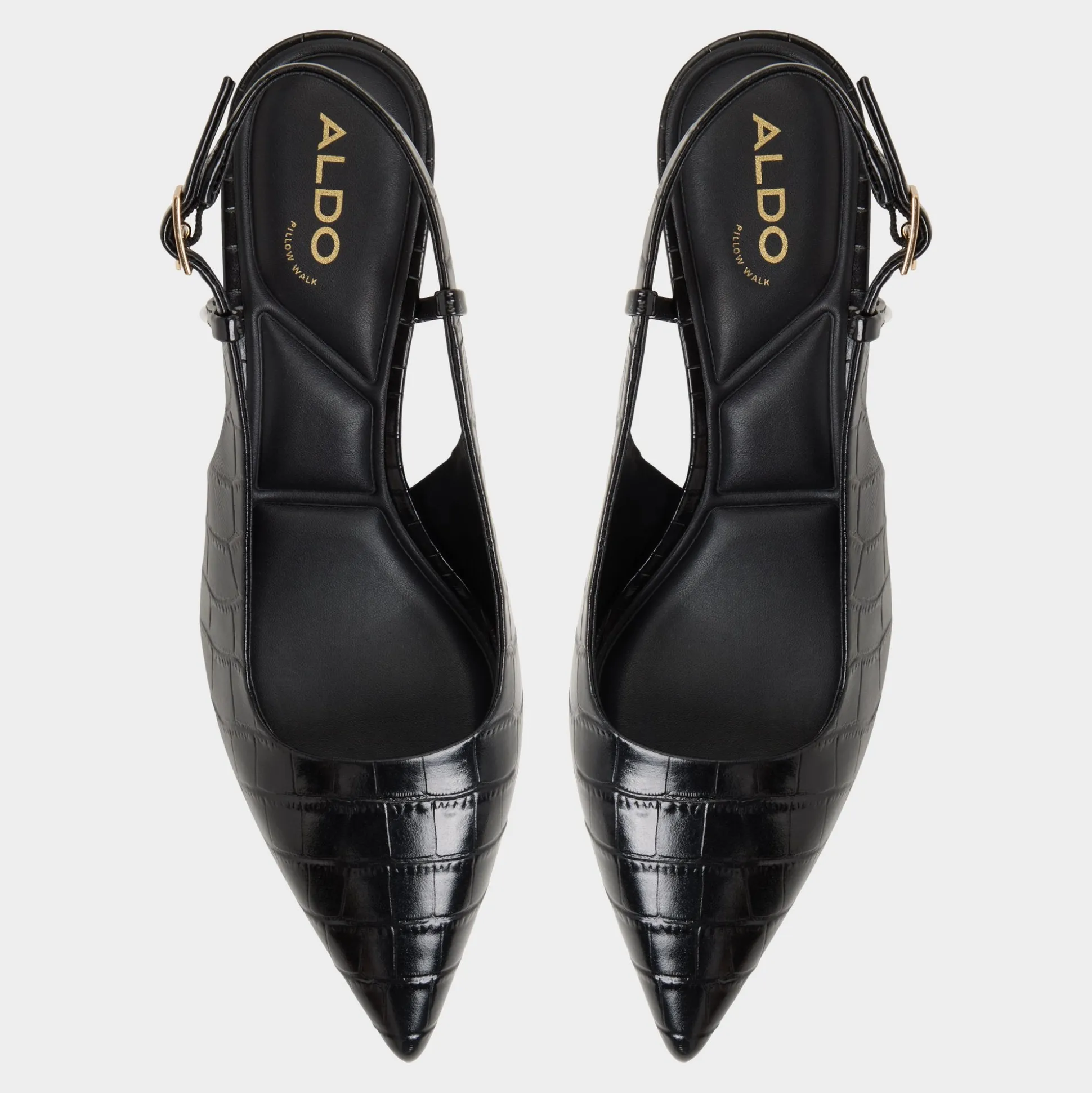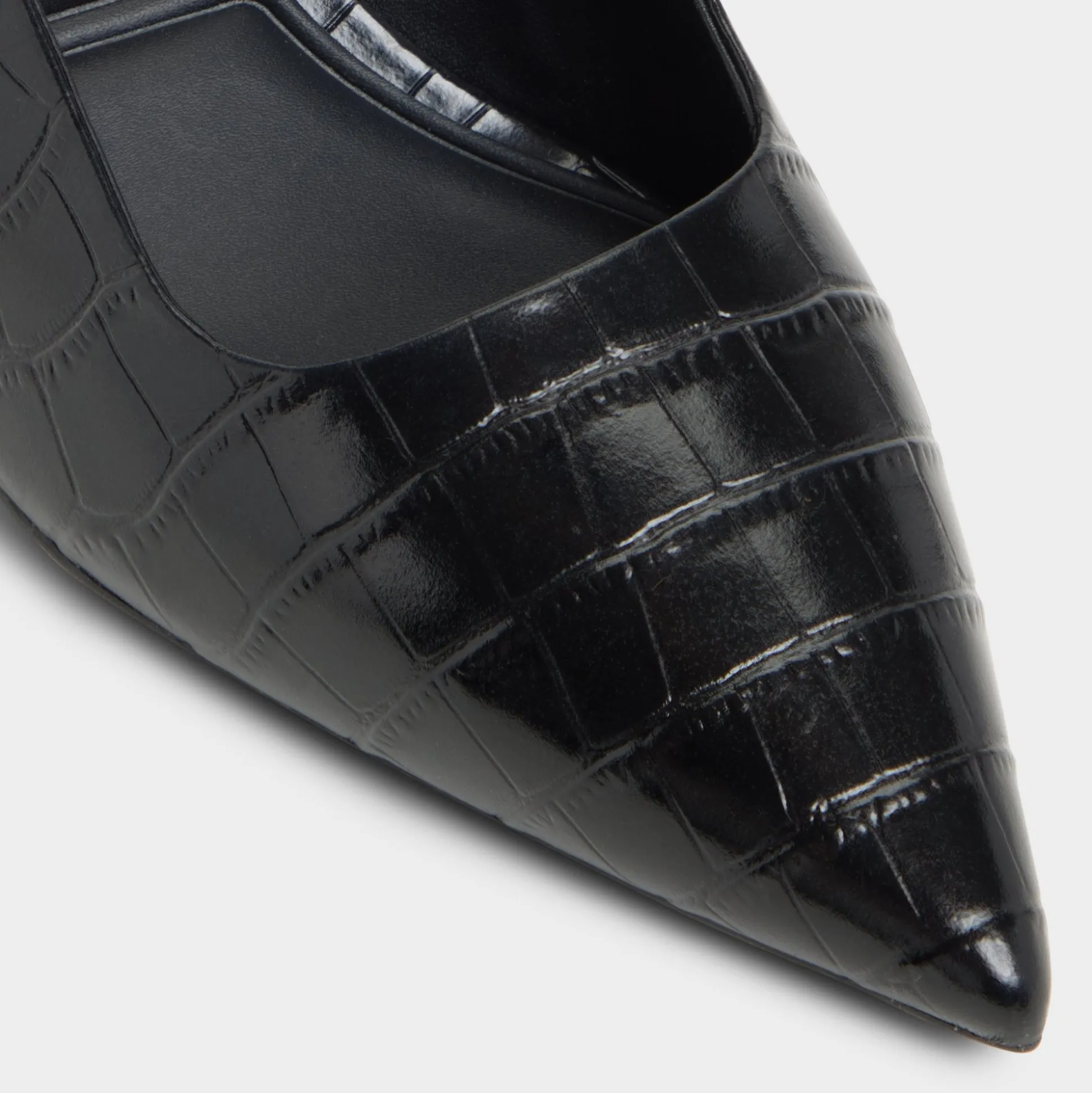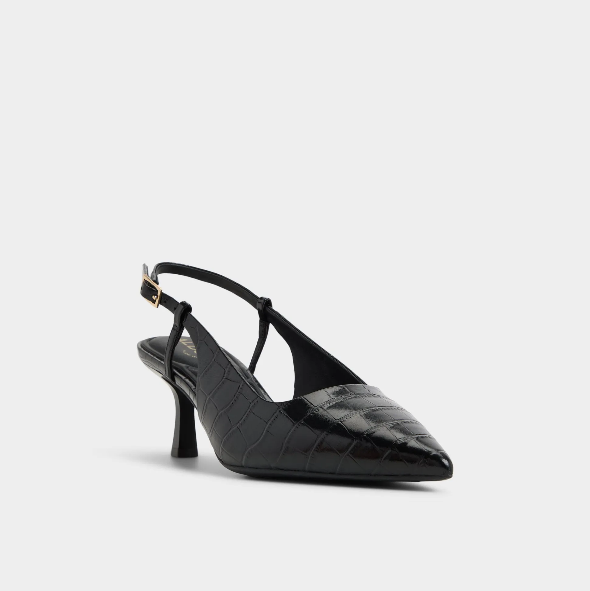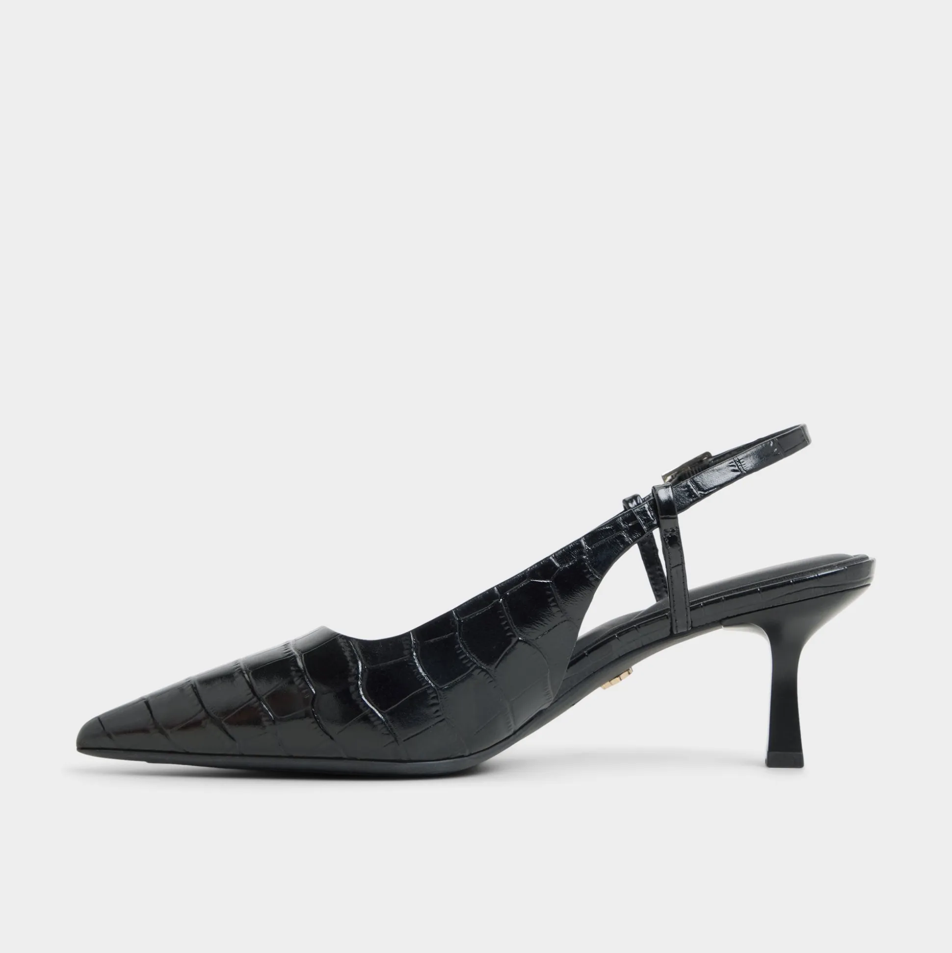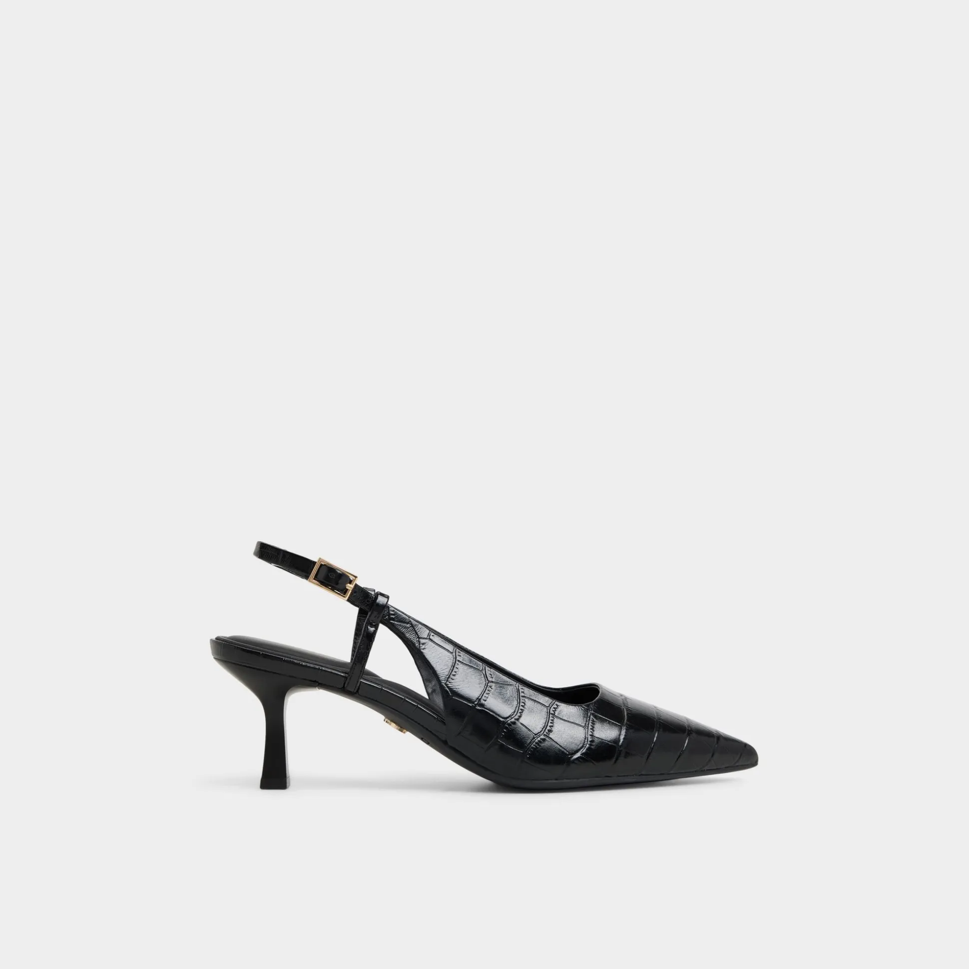 Glossy croc emboss catches streetlights, draping sleek slingbacks over a poised kitten-heel silhouette so every step feels quietly elevated yet effortless, captivating the eye as evening plans unfold and the city becomes a stage. Pair with cropped trousers for pitch mornings, or swap in satin slip skirts when late-night jazz sets shift into moonlit detours.