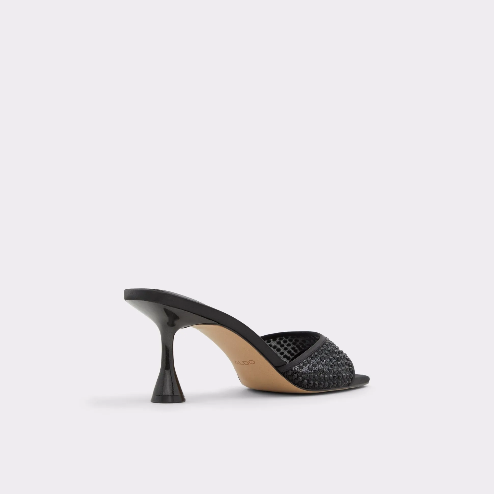 Sculpted spool heel lifts this slip-on mule just enough, while a leather strap glitters with dark micro-studs and a crisp square toe keeps the pedicure breathing through every RSVP-packed evening. Pair with satin mini for rooftop toasts, or swap in tailored trousers when nine-to-five morphs into gallery openings.