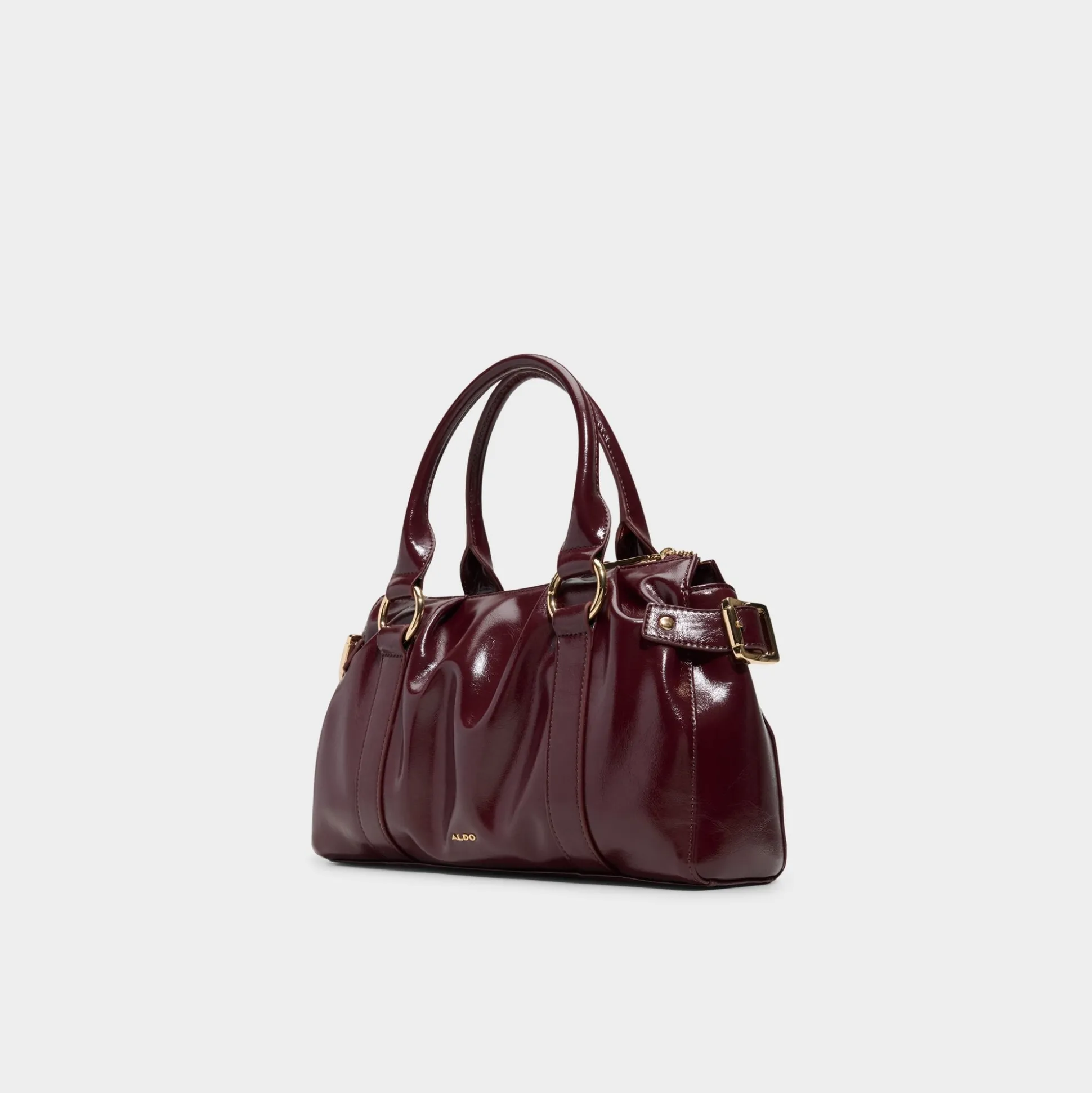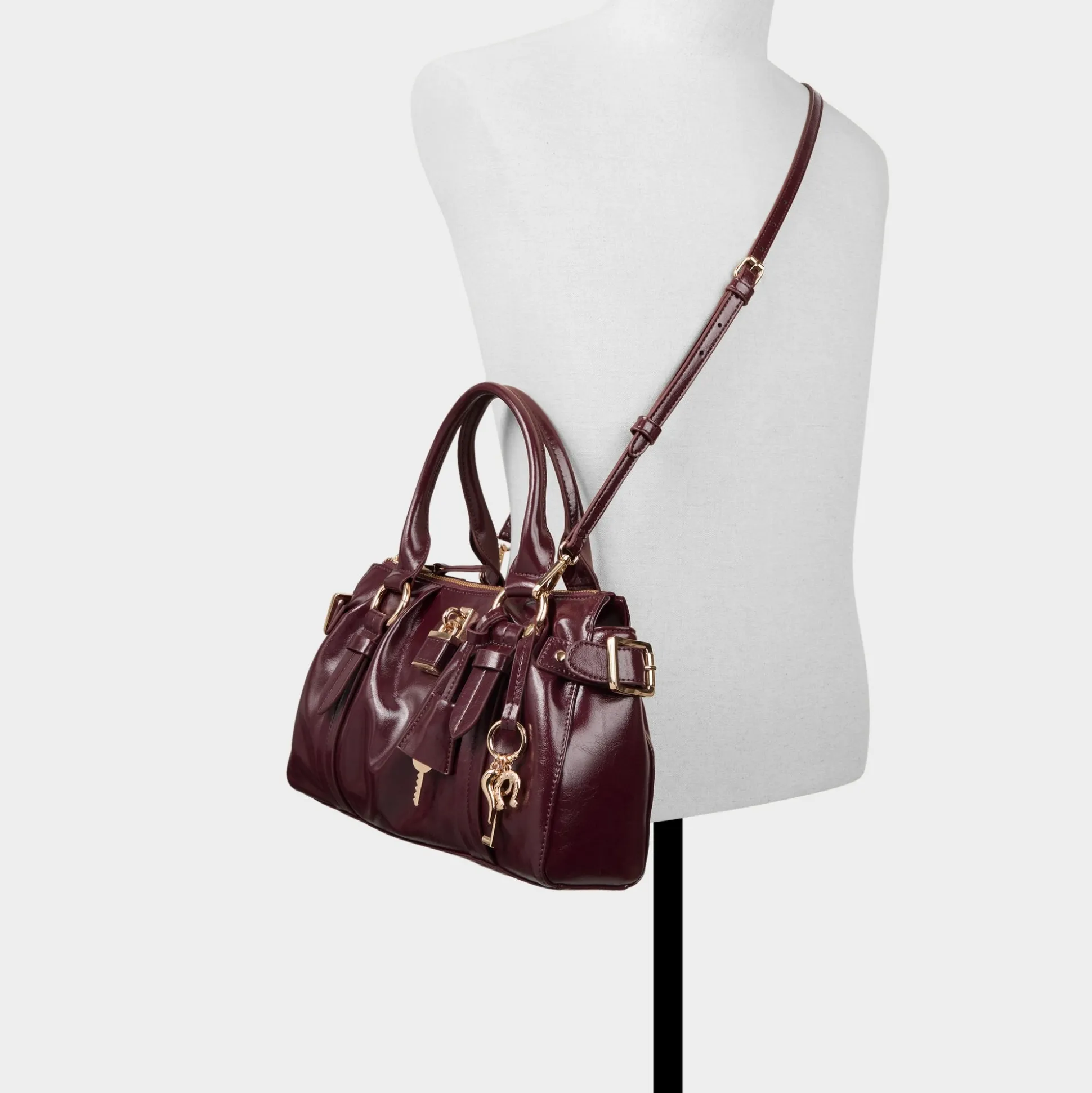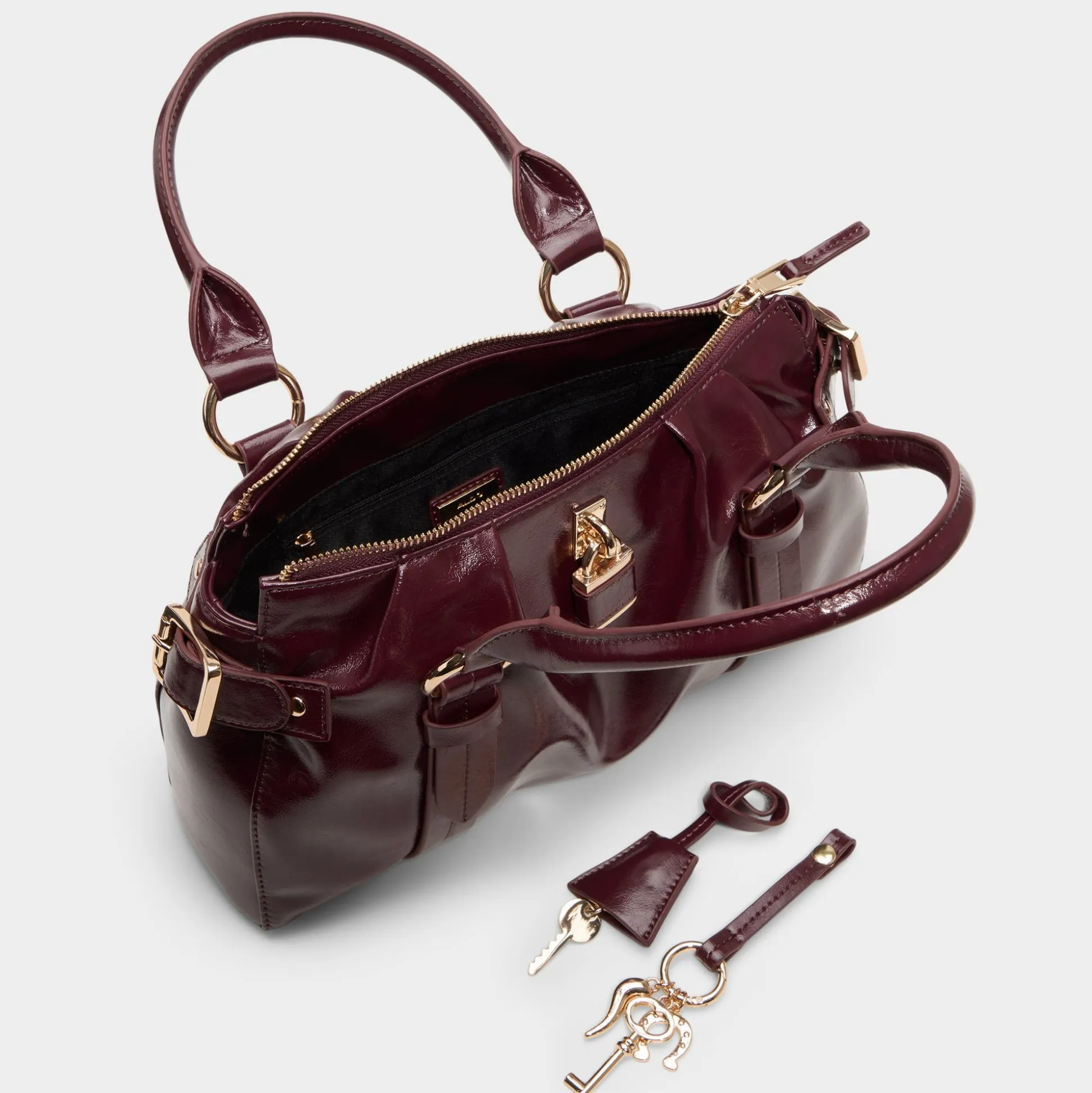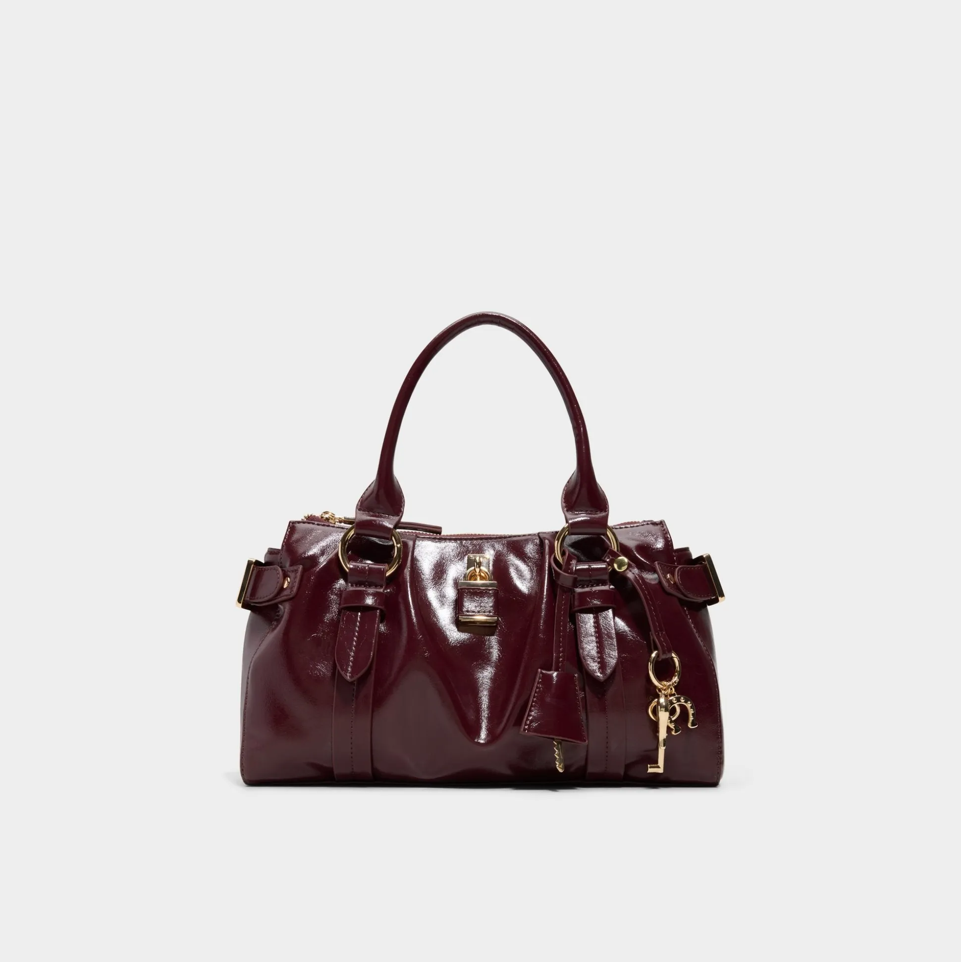 Liquid-shine patent catches city lights on this structured satchel in deep cabernet, framed by gold buckles and a dangling padlock charm that signals secure, upscale flair for days that demand polish. Carry it to client pitches with tailored trousers or sling it over a satin slip for after-hours socials.