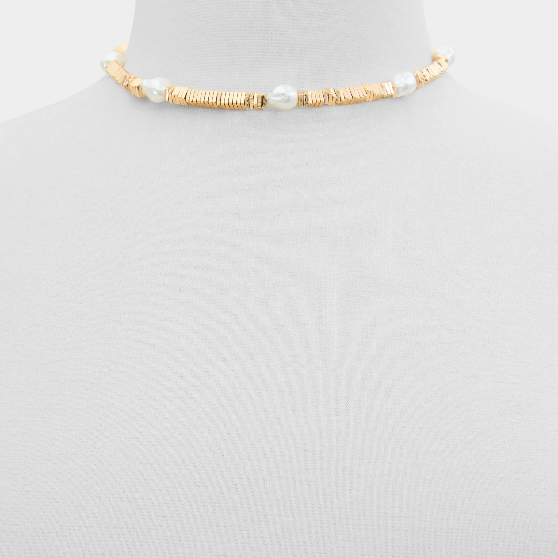 Molten-look faux pearls punctuate rows of tightly stacked gold heishi beads, creating a sleek, collar-grazing necklace that hugs the neckline with subtle shimmer and easy lobster-clasp adjustability. Layer it with a longer pendant over a satin cami for date nights, or frame a crisp button-up and blazer at office presentations for polish.