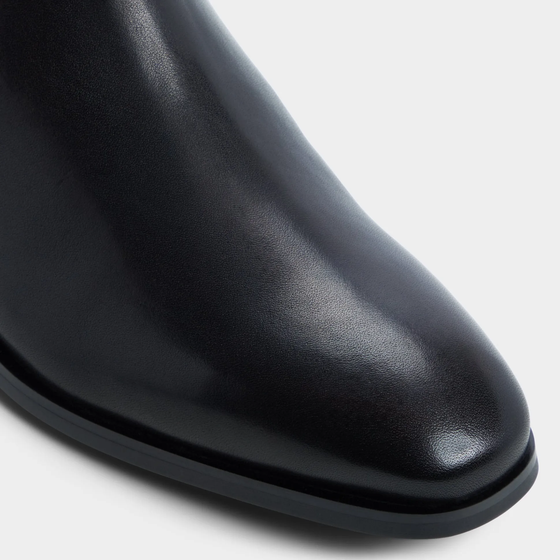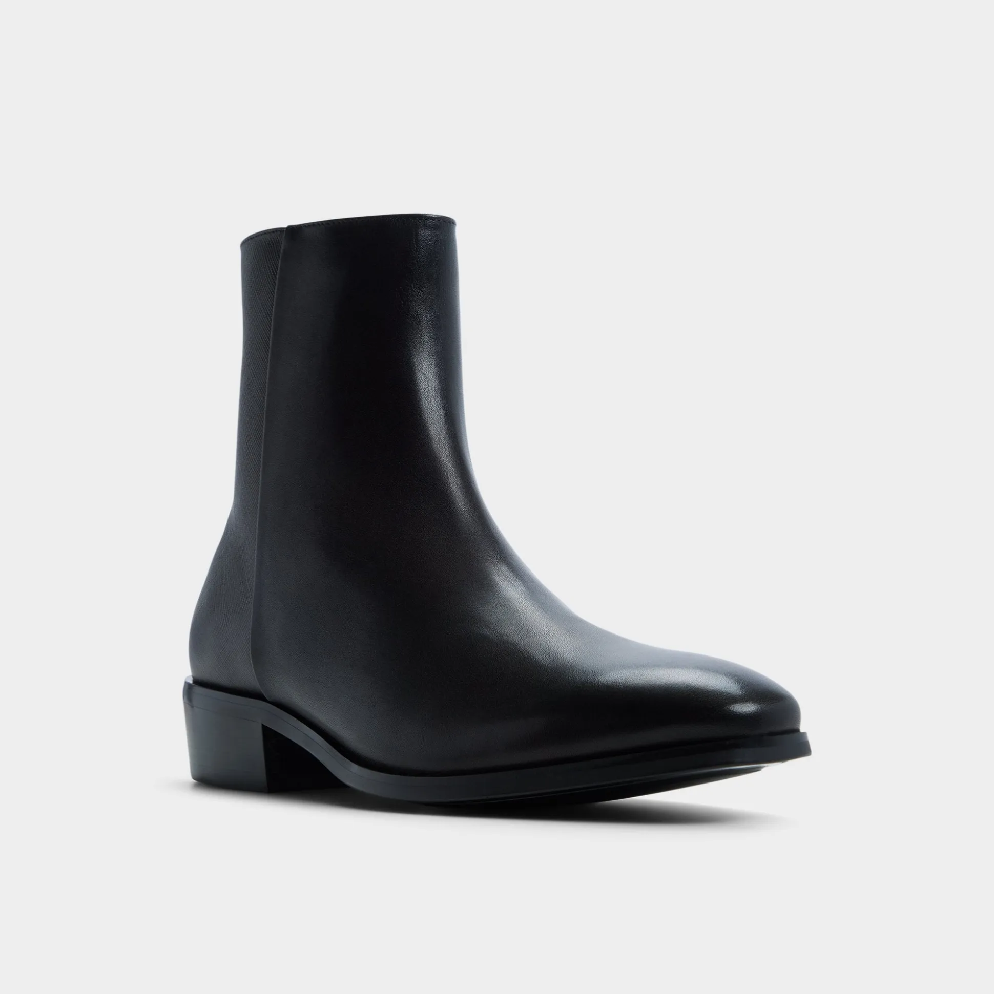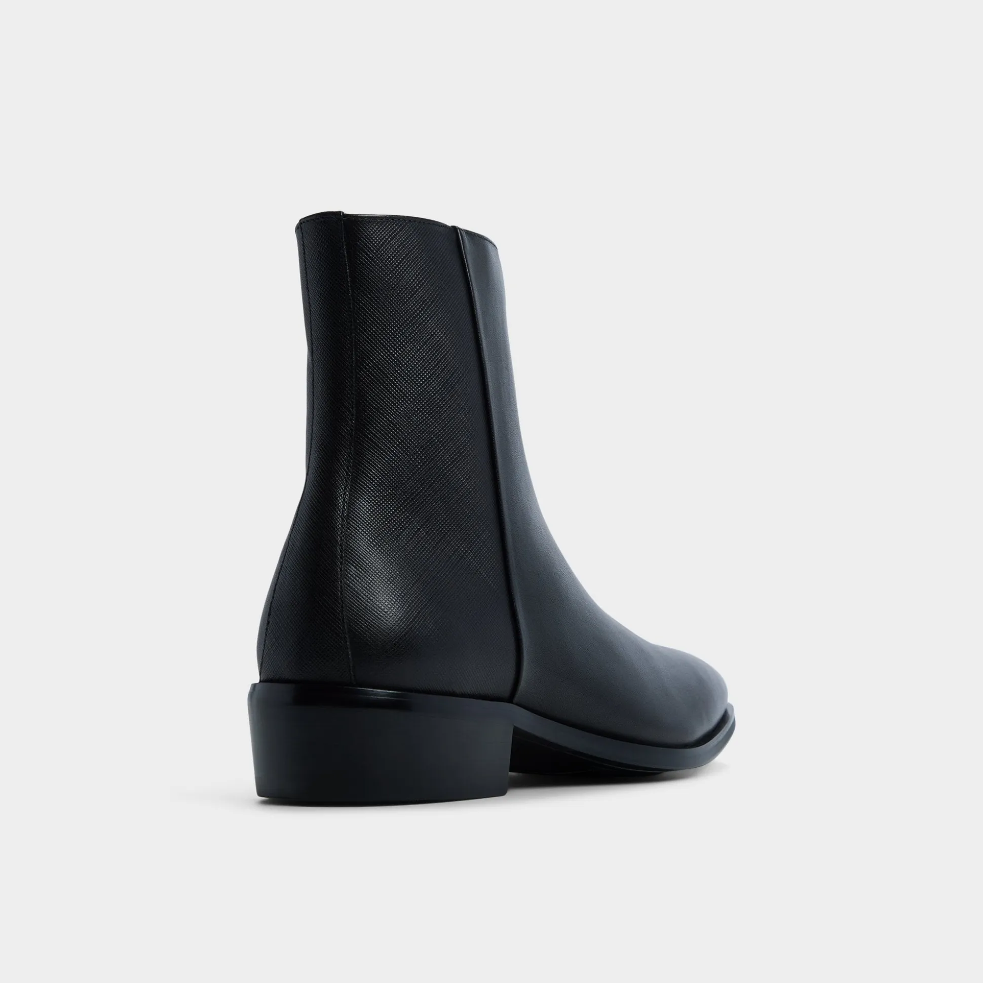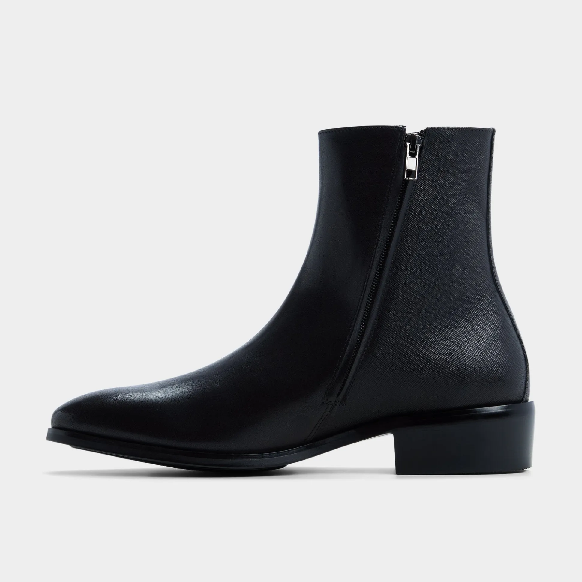 Smooth black leather in front and a textured rear panel create a subtle contrast in this ankle boot, while a side zip offers quick access and a low stacked heel ensures easy movement. Anchor slim dark denim for evening meet-ups or polish tailored trousers on office days-its squared toe finishes each look sharply.