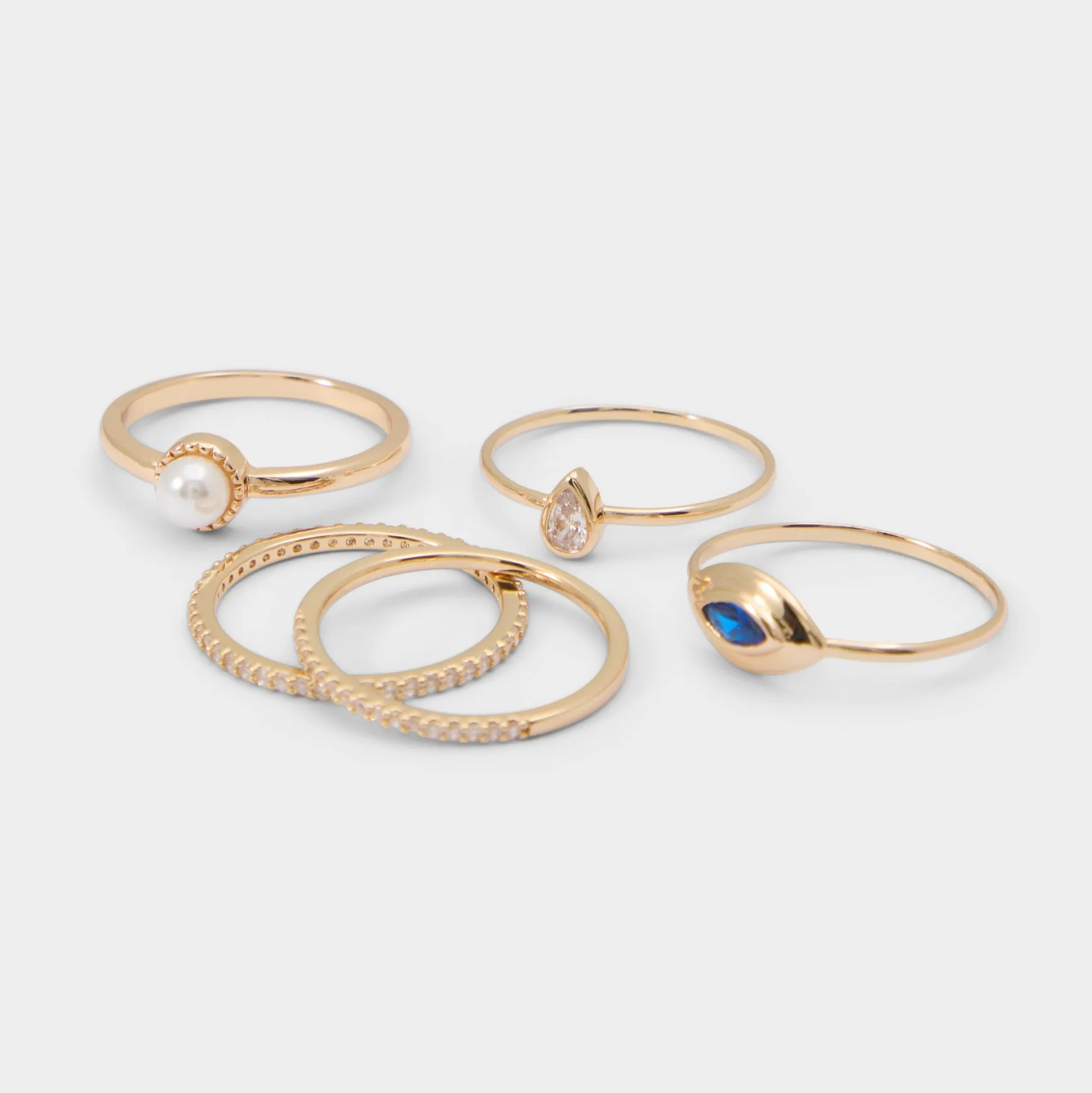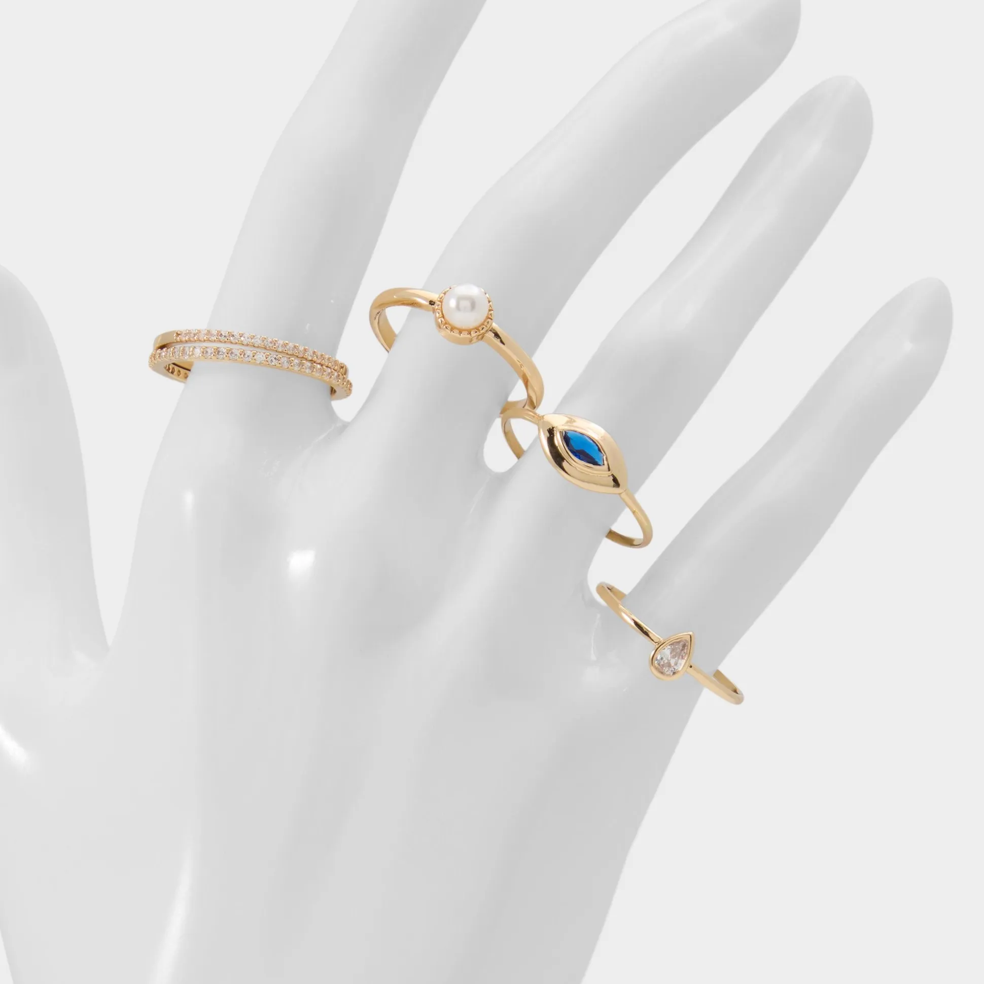 Five ultra-slim bands slip on like golden whispers, each tipped with a pearl, marquise crystal or cobalt evil-eye charm, ready to stack and restack as mood shifts. Layer them with a blazer-and-jeans combo for coffee runs, or let one eye ring spotlight a satin slip at rooftop drinks.