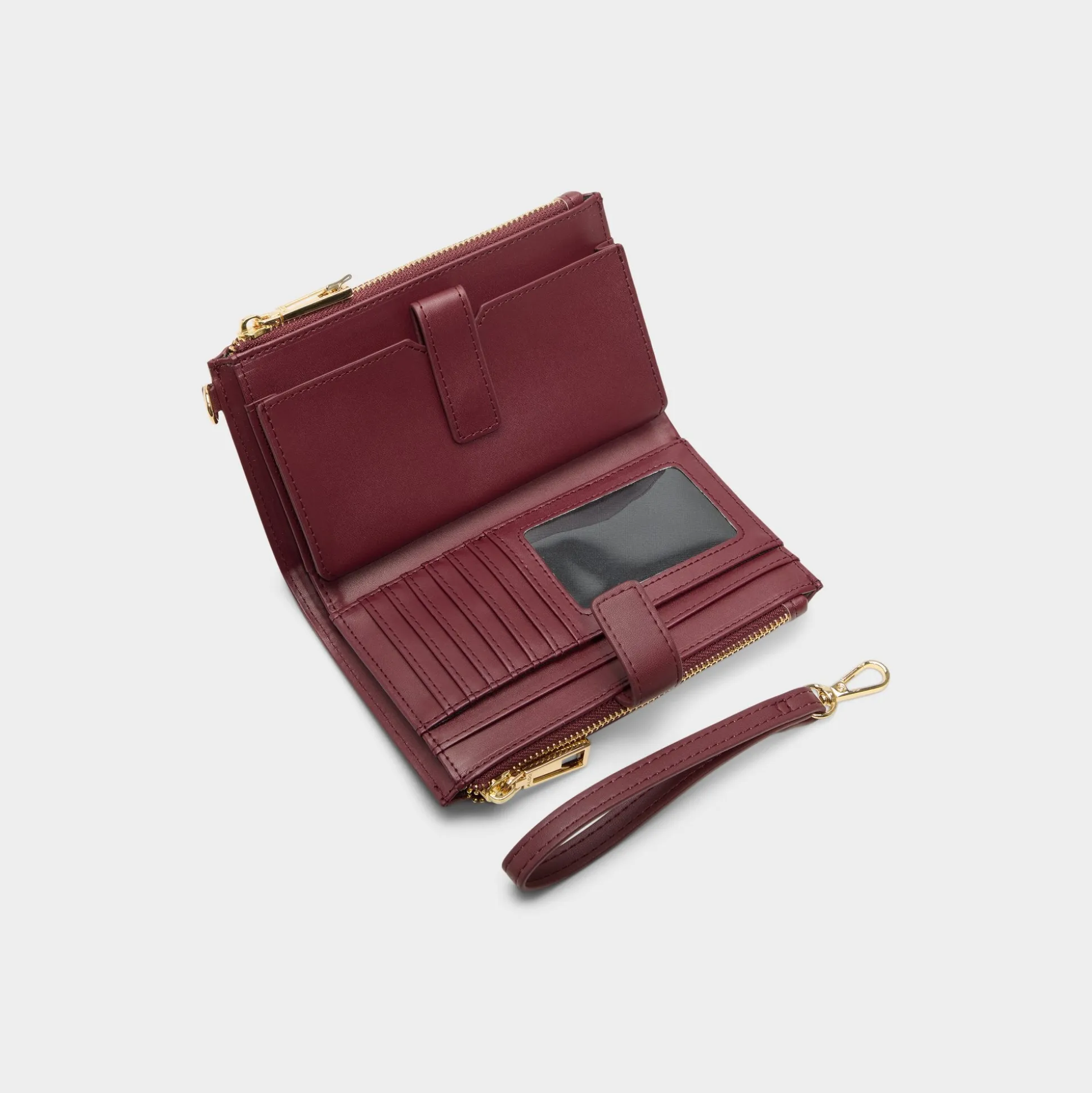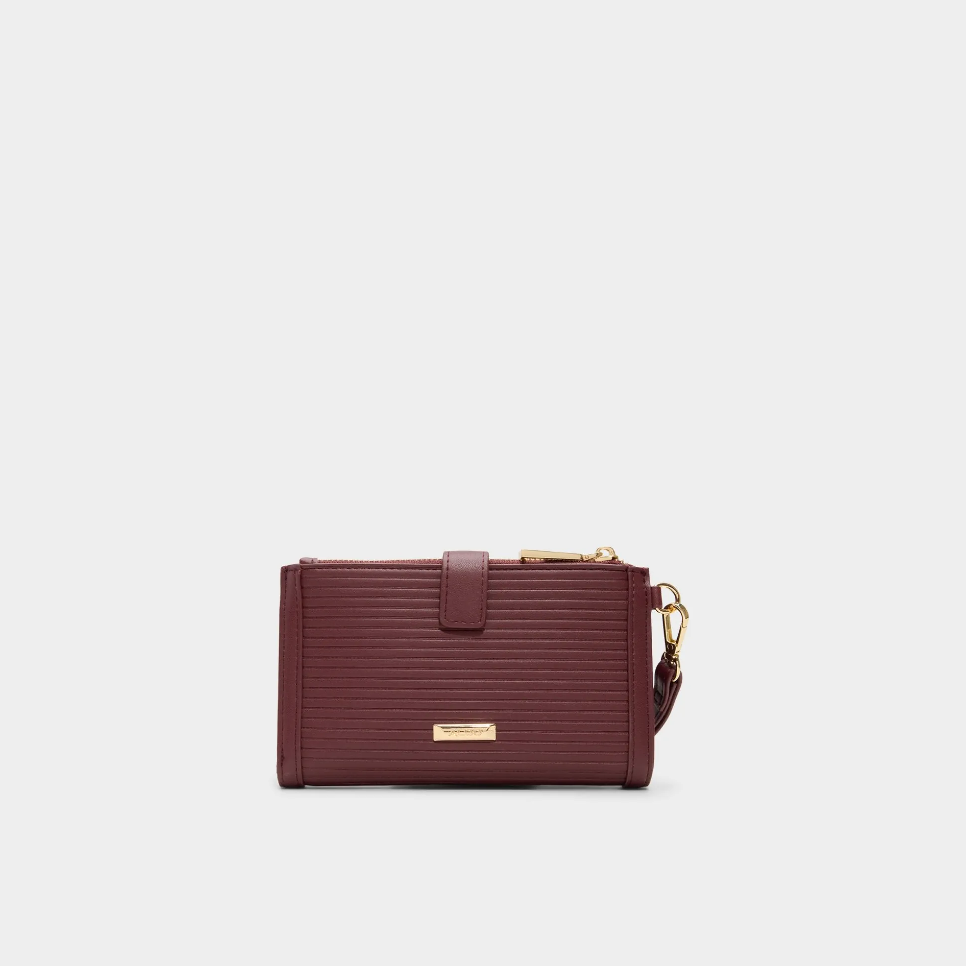 Rich burgundy synthetic elevates this slim wristlet into low-key luxury, with tonal embossing and glinting gold studs, while a detachable strap swaps handheld for hands-free in seconds. Carry it with a slip dress at gallery nights or tuck it inside your commuter tote for coffee-run breaks, sealing every switch-up with polish.