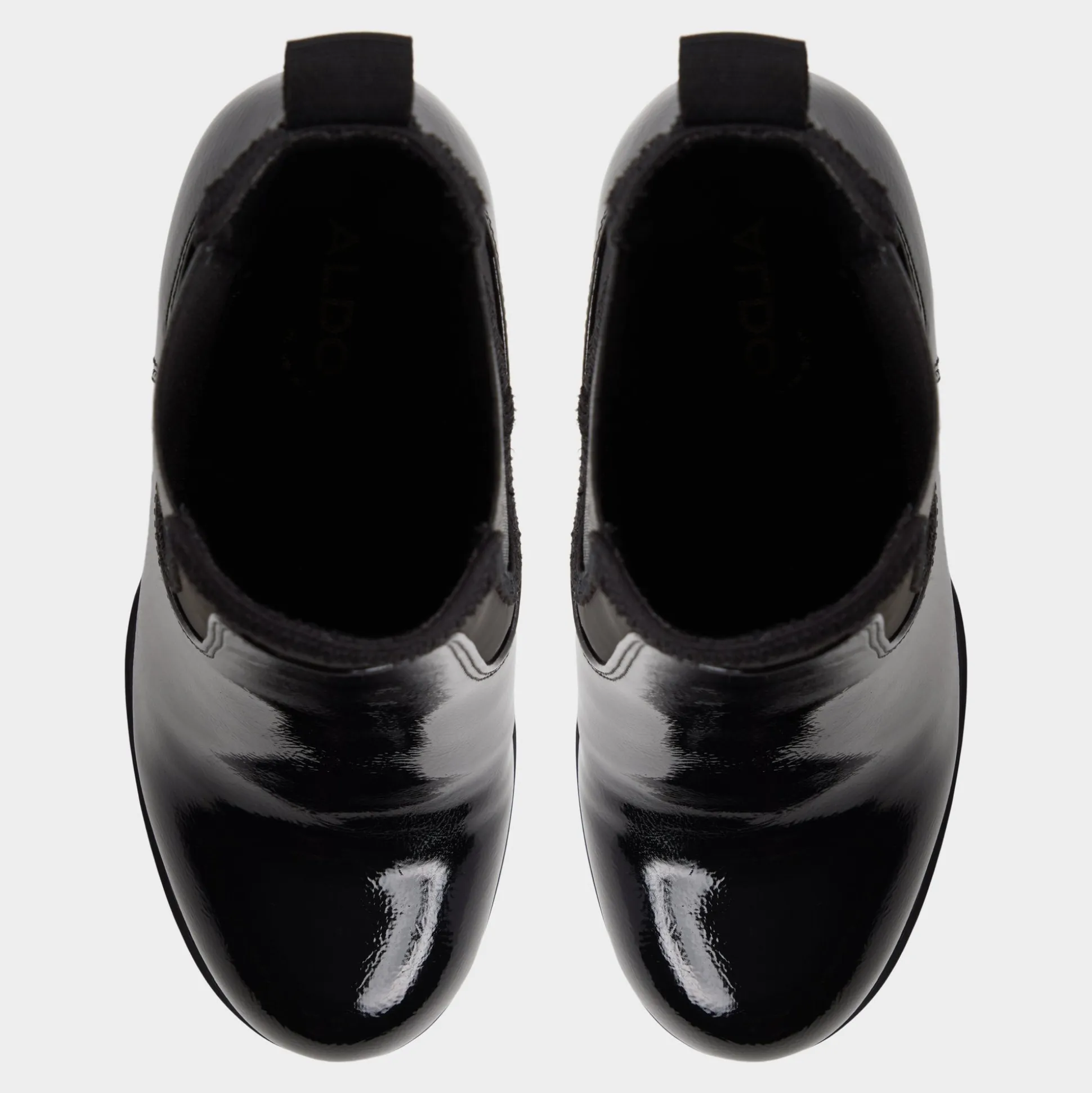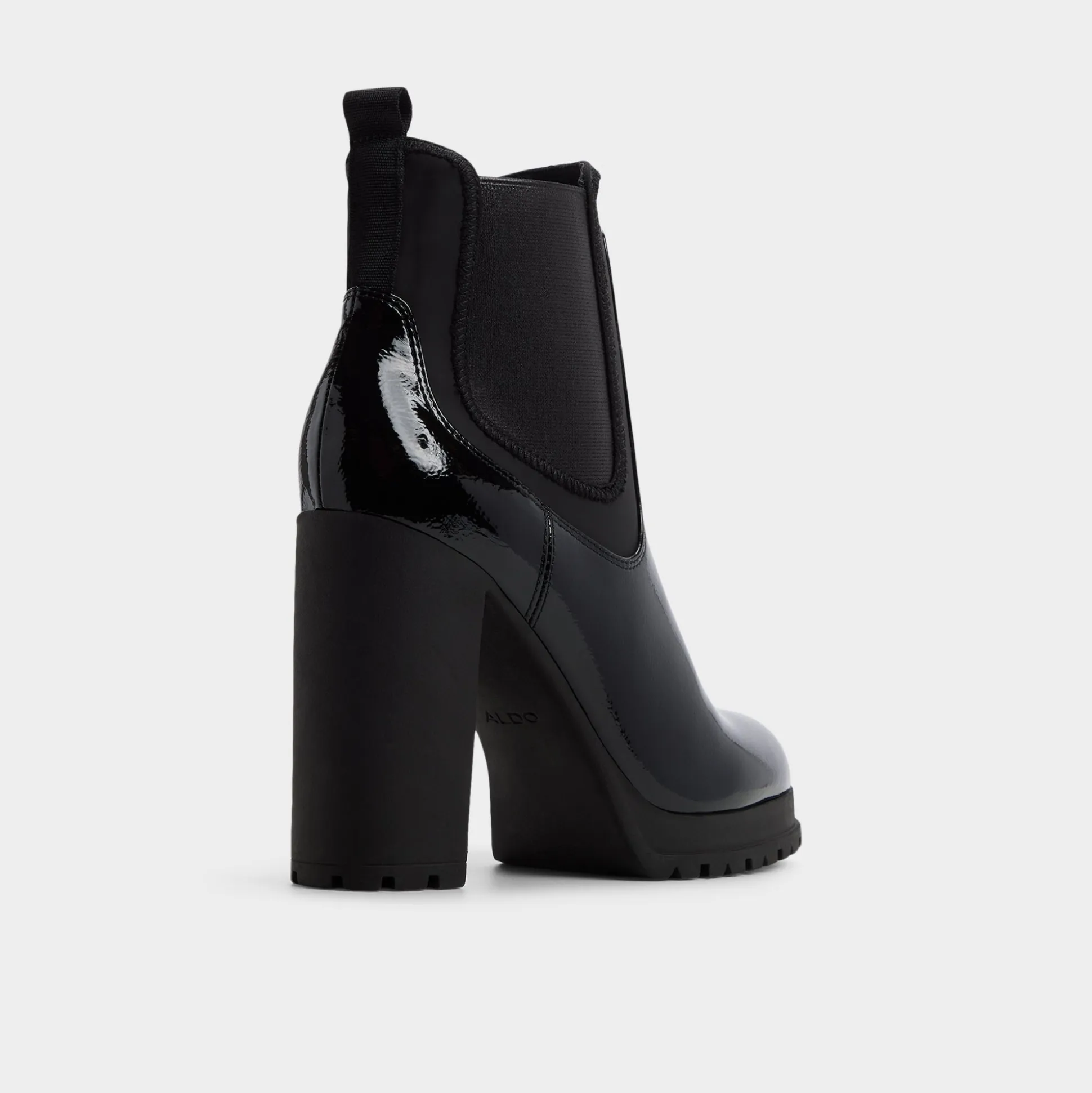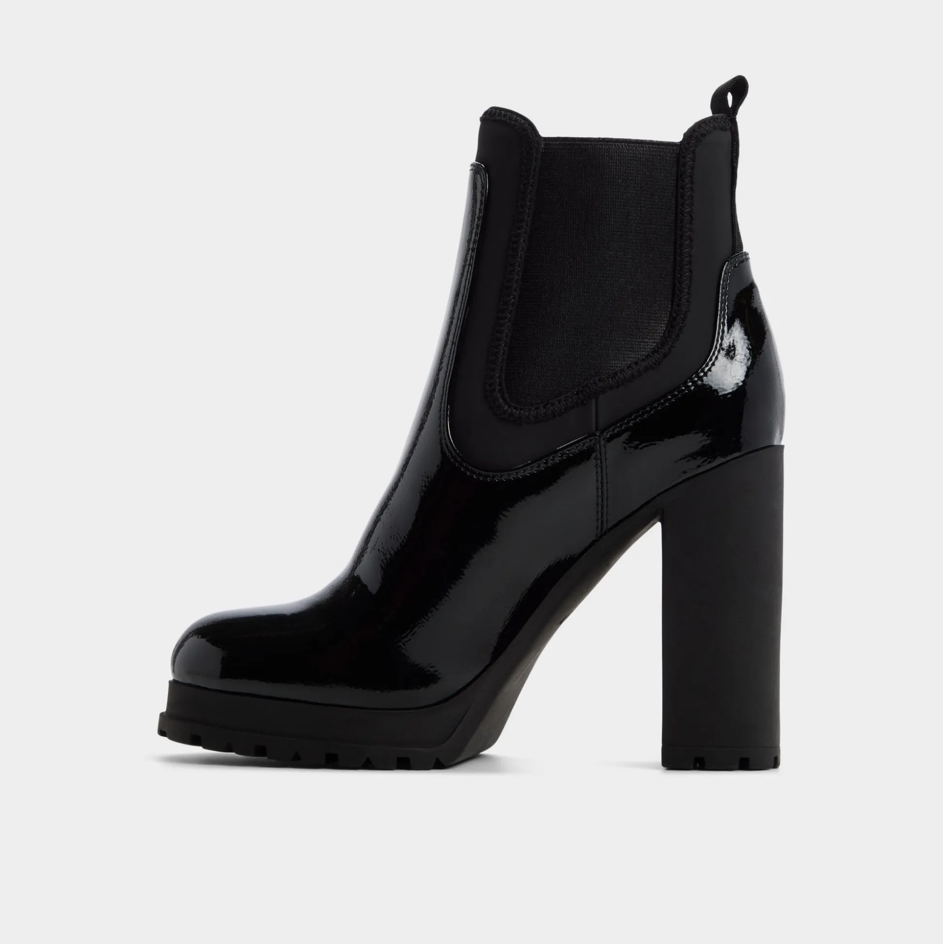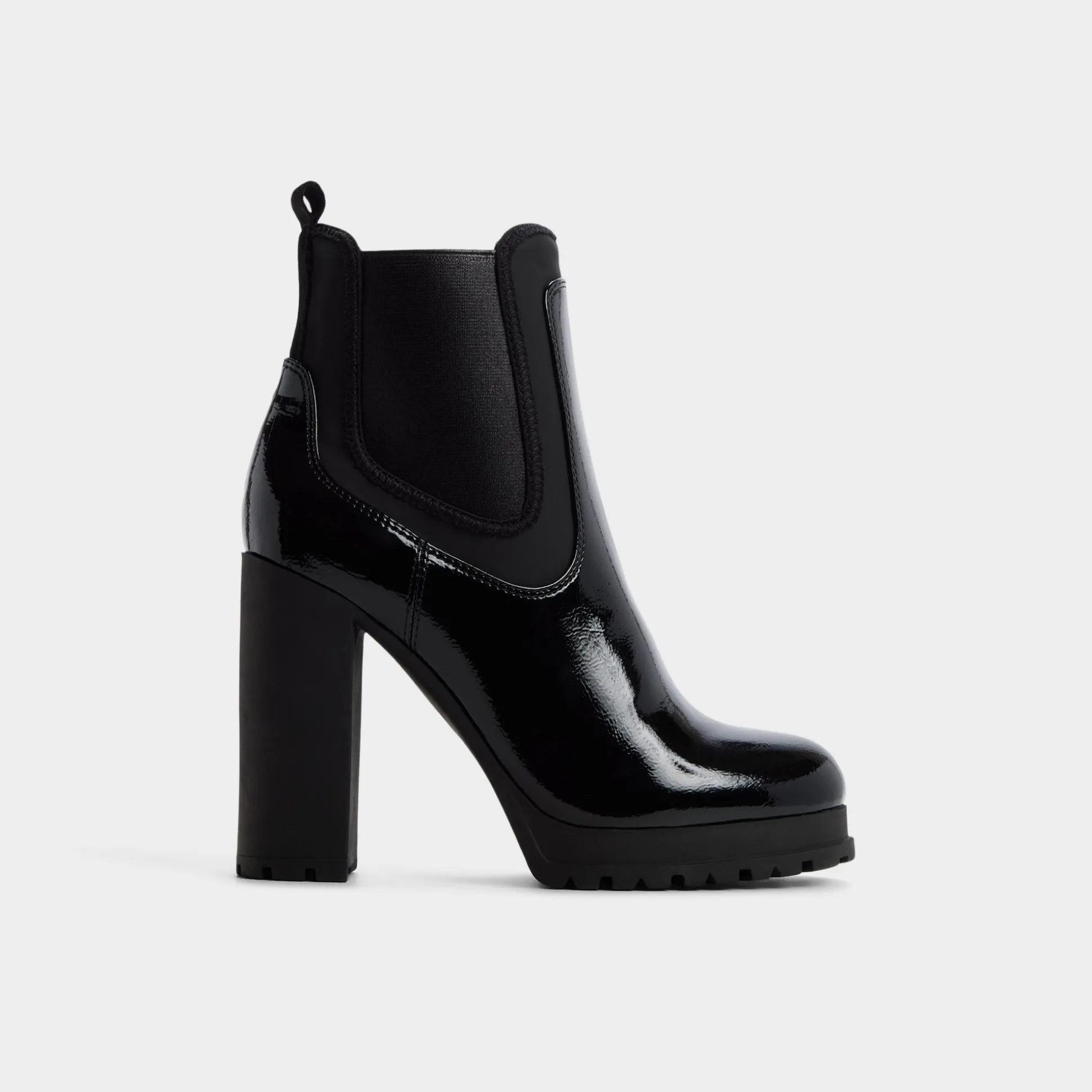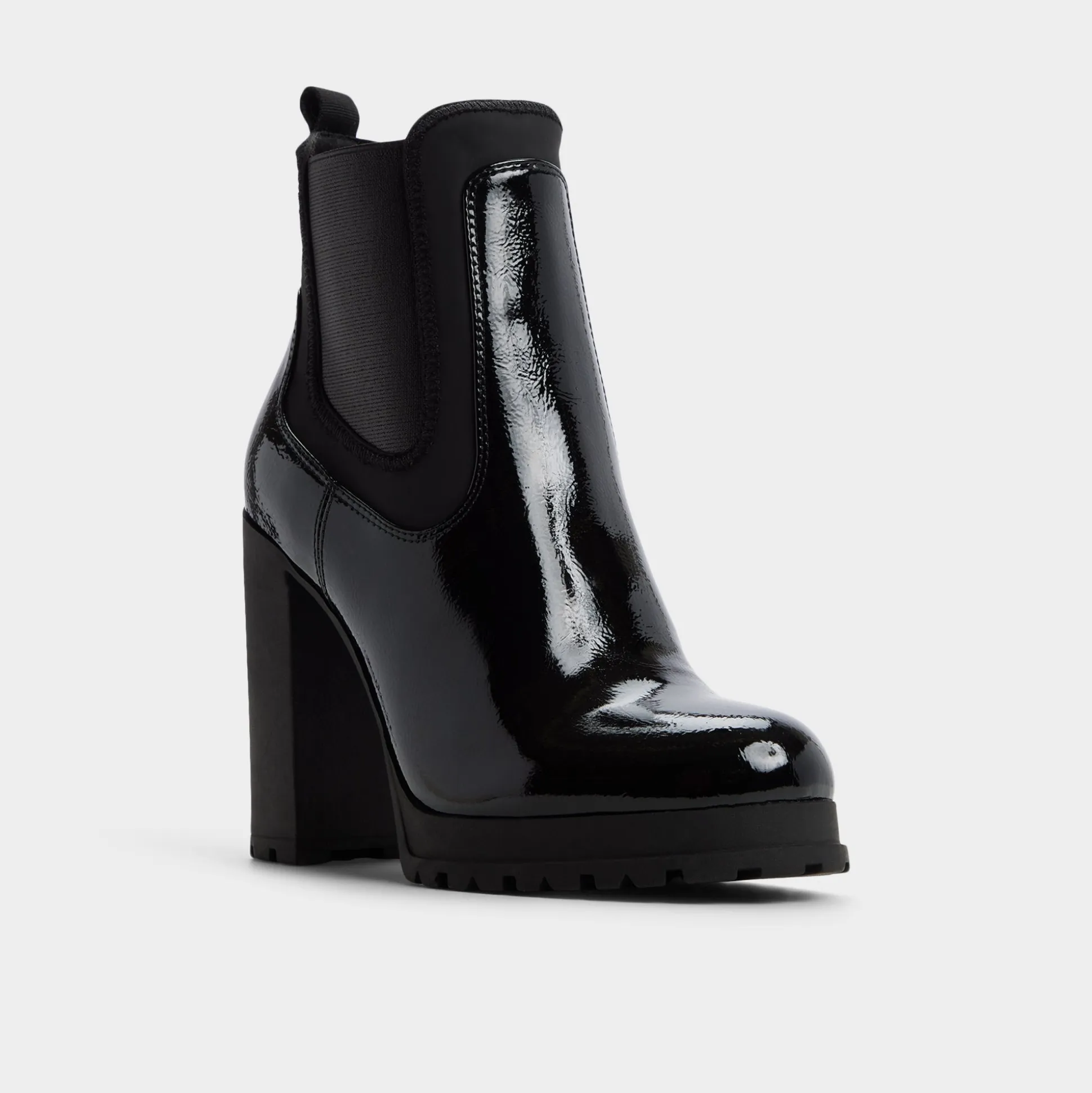 Midnight-slick patent leather wraps a Chelsea silhouette as a towering block heel rises above a grippy lug sole, marrying city poise with night-ready edge in one bold, enduring look that turns heads. Pair with raw-hem denim for gallery hops, or ground satin slip for rooftop cocktails under city lights.