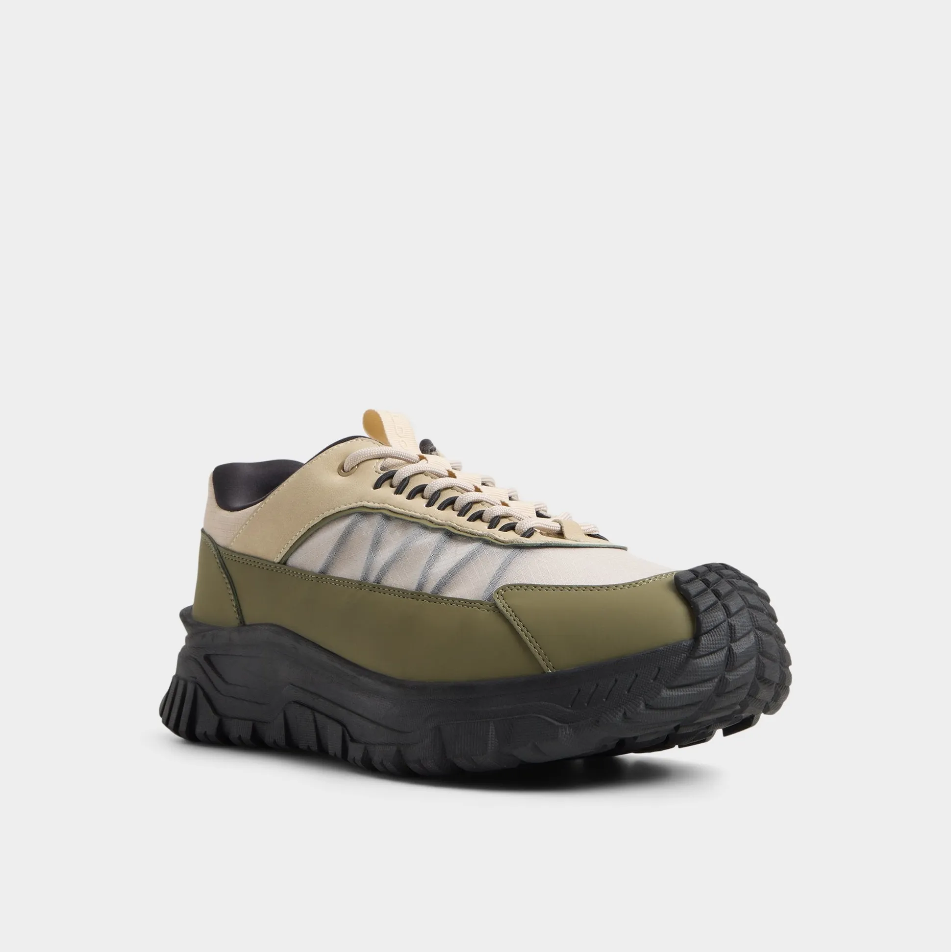 Chunky rubber lugs give this leather-and-mesh sneaker an adventurous spirit, cushioning each step while green and beige layers keep it fresh on streets or trails. Wear with cargo shorts for coastal walks or joggers after workouts-the contrasting tread grounds every style effortlessly.