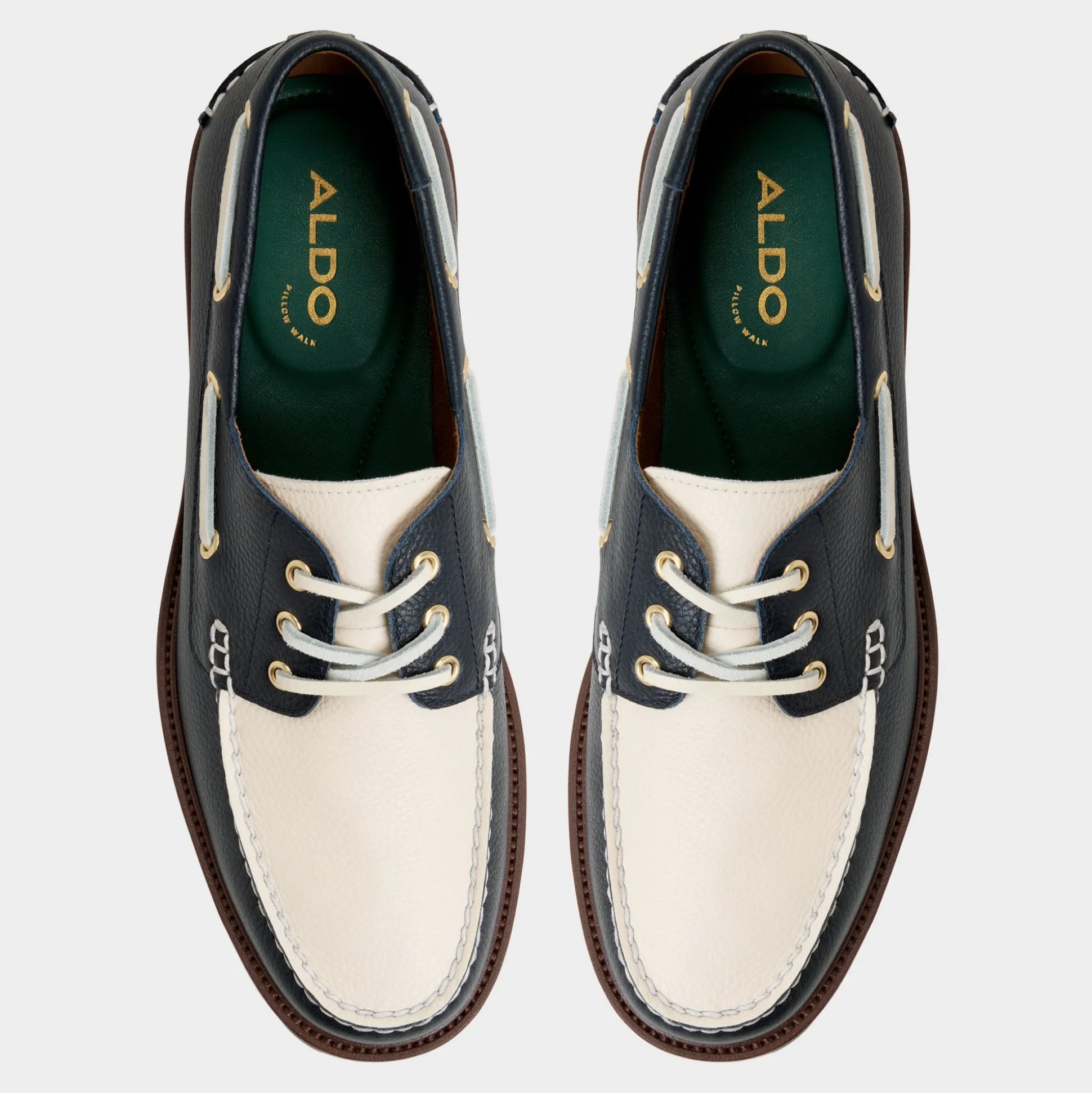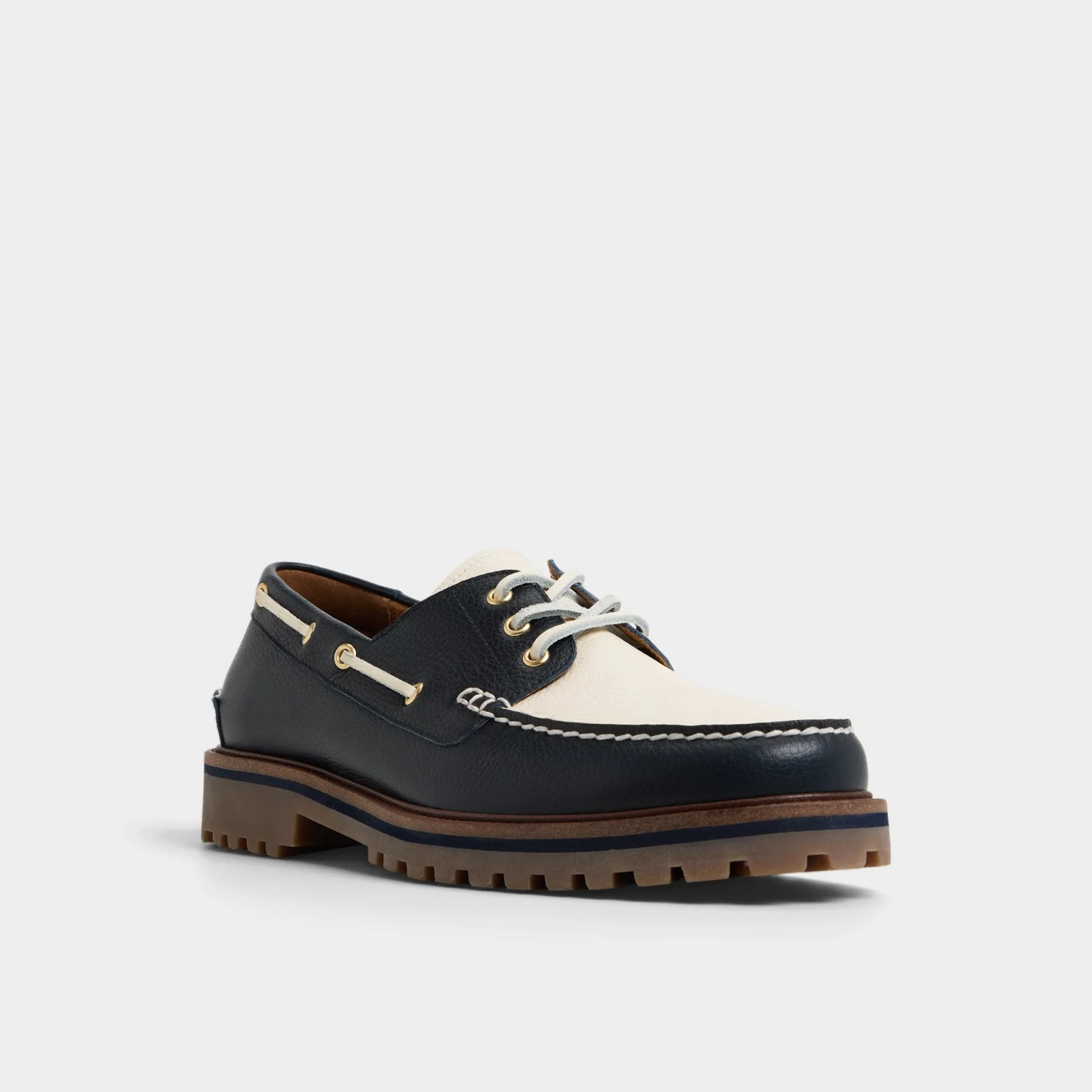 Pebbled navy leather sets the boat shoe apart, with deep-cut lug soles and metal eyelets that fuse rugged function with city-ready polish, while a supple, full-grain upper keeps comfort steady from dockside to downtown. Team it with cuffed chinos for seaside brunches or anchor faded jeans for road trips, the tread grips wet decks and city pavements.