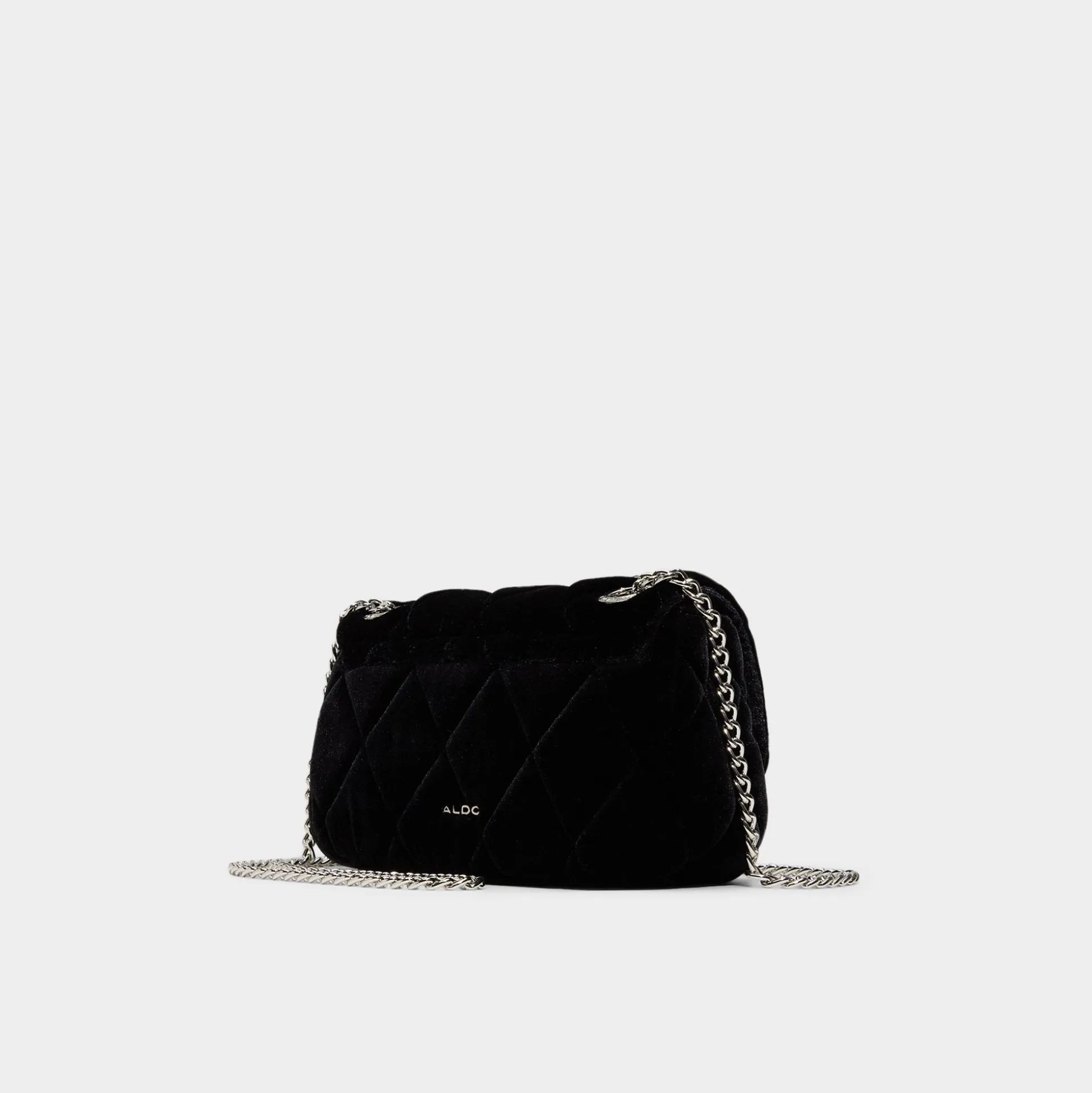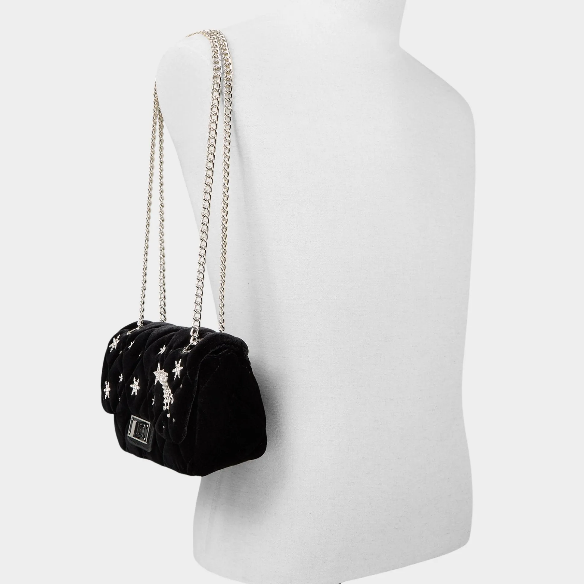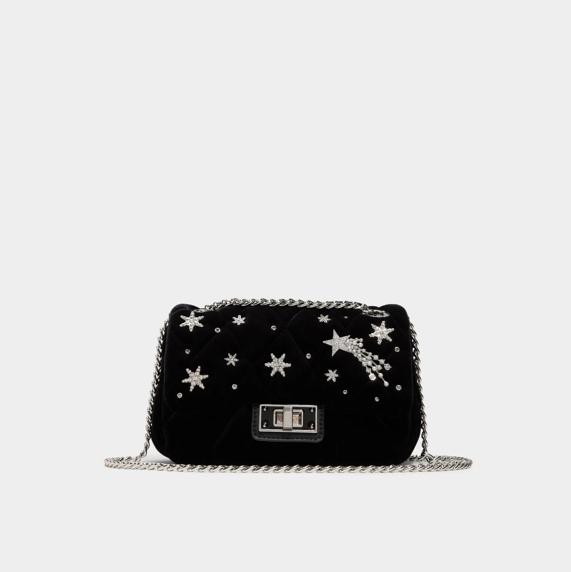 Midnight velvet transforms pocket-sized form into a clutch that hints at a constellation, its crystal panels catching light as a silver chain and a gleaming turn-lock closure finish the look. Sling it with slips for rooftop nights or pair it with tailored denim for gallery days, finishing each moment with a touch of cosmic chic.