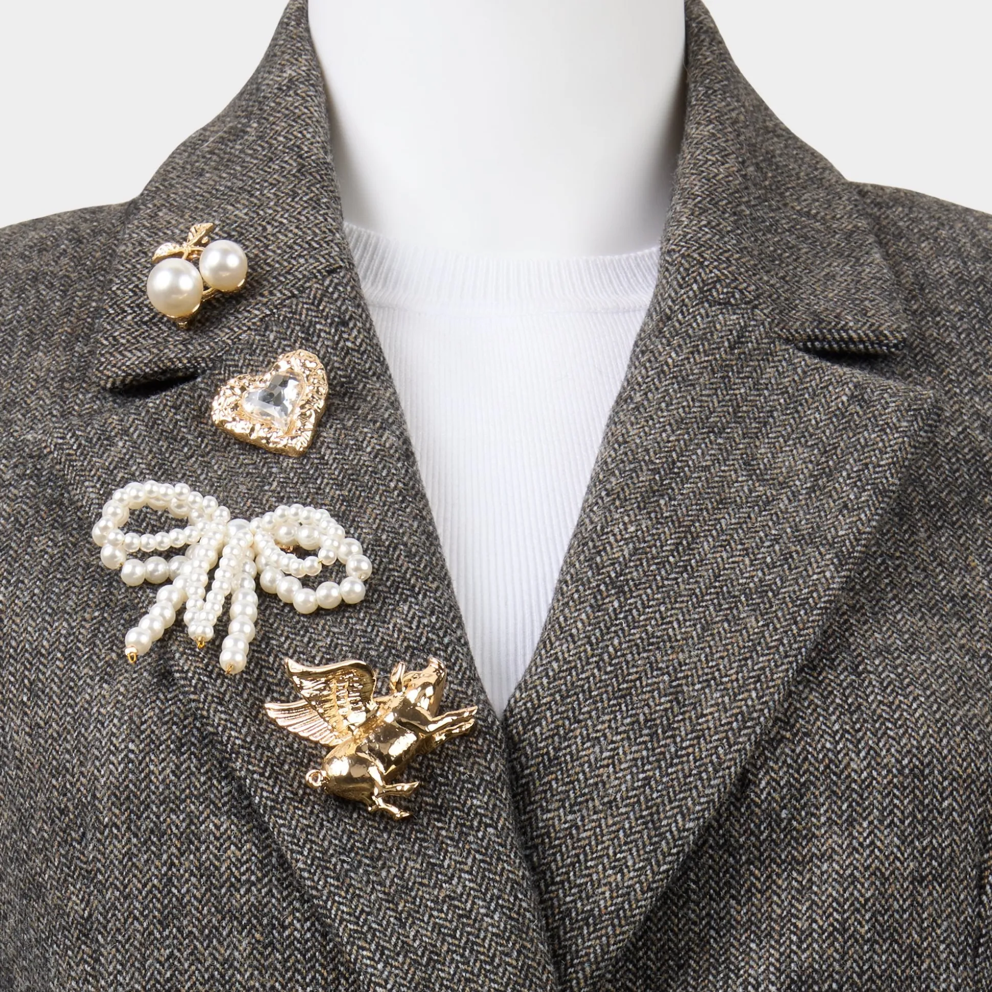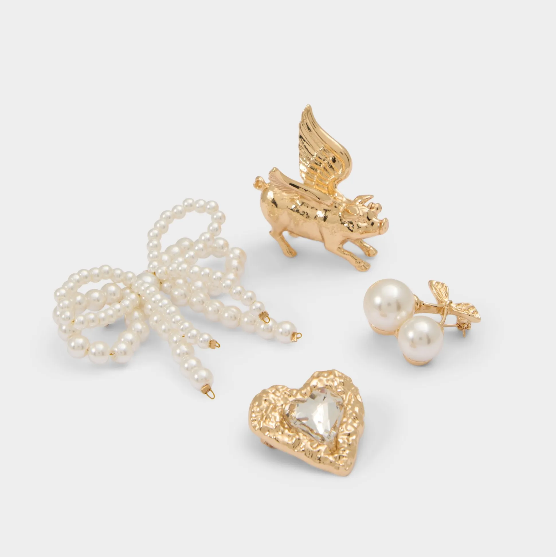 Pearl-strung bow, rhinestone-heart, sugar-sweet cherry and a winged pig join forces in this gold pin set, turning jackets, totes or bucket hats into mini mood boards. Cluster them on a vest for events or dot a clutch at parties for sparkle.