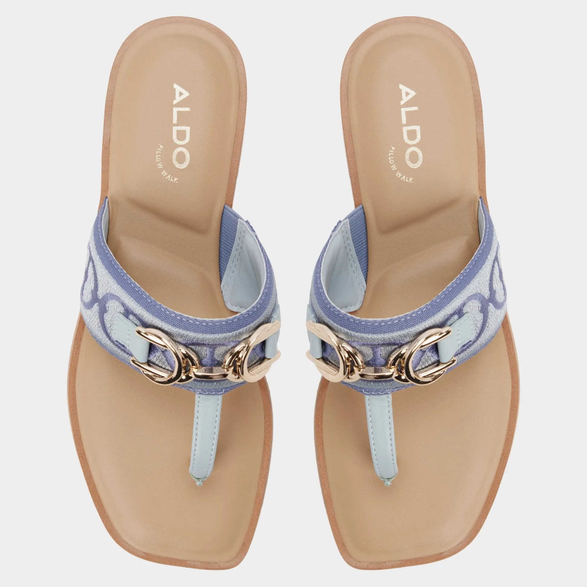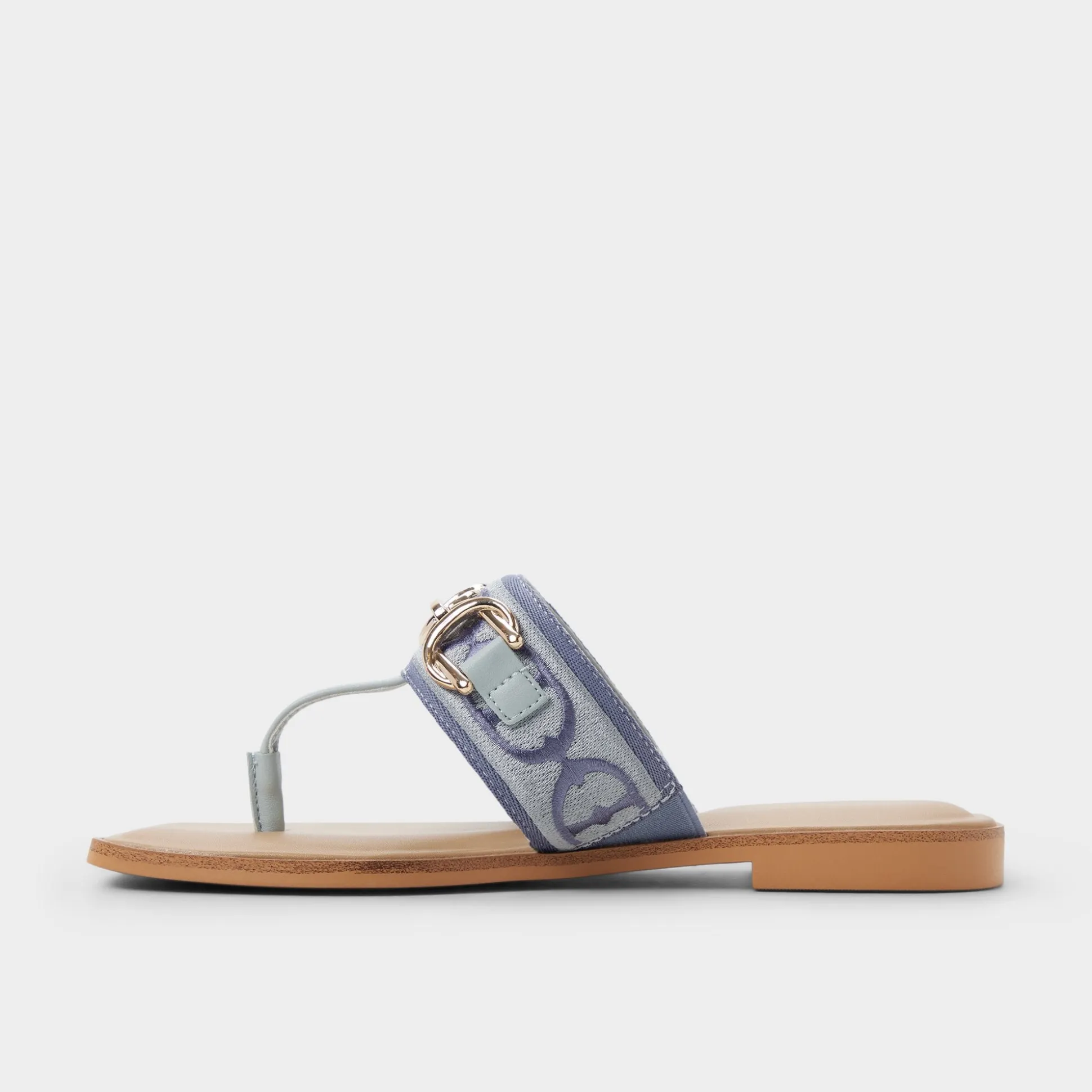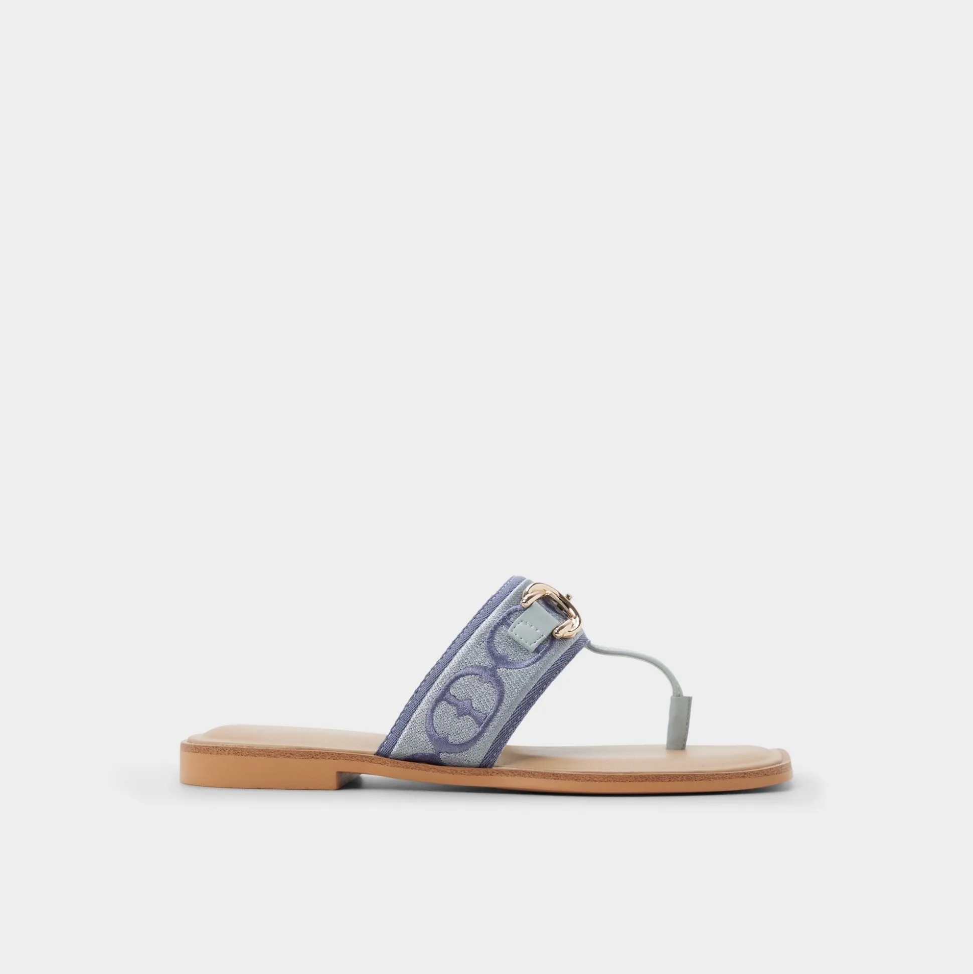 Denim-blue jacquard crowns a wide strap thong sandal, brushed-gold buckle lining lending quiet polish, while a flexible flat keeps movement easy from city staircases to sunlit boardwalks for spontaneous city days. Pair with white cutoffs for farmers-market loops, or slip beneath a breezy midi for sunset strolls.