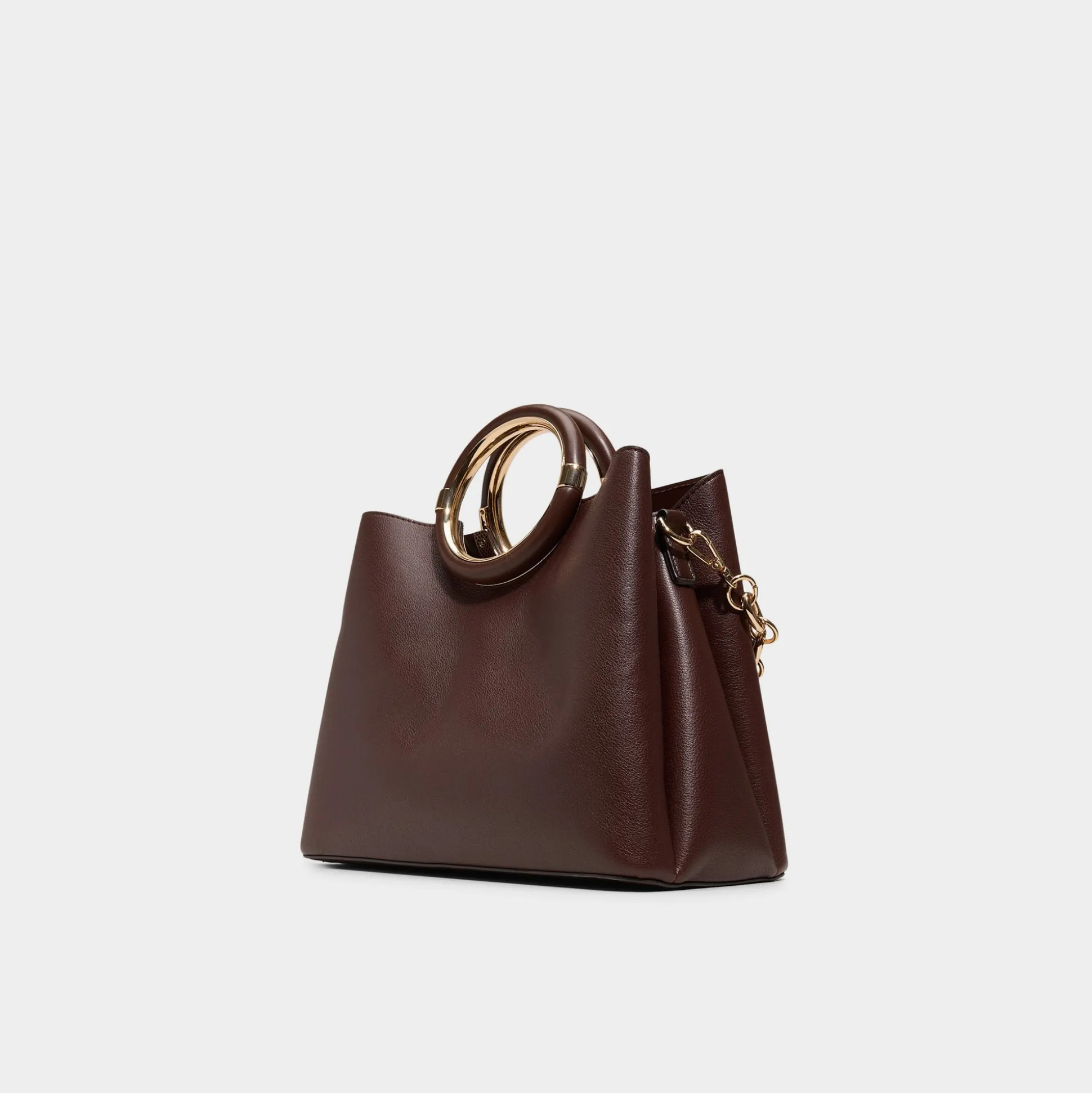 Espresso leather meets art-deco drama in this sculptural top-handle bag, where an oversized gold-rimmed ring handle and chunky chain drape turn every corner into a red-carpet moment during caffeine-fueled city days. Carry it with a power suit for client mornings or tuck it under a denim jacket for weekend errands, finishing looks with confident polish.