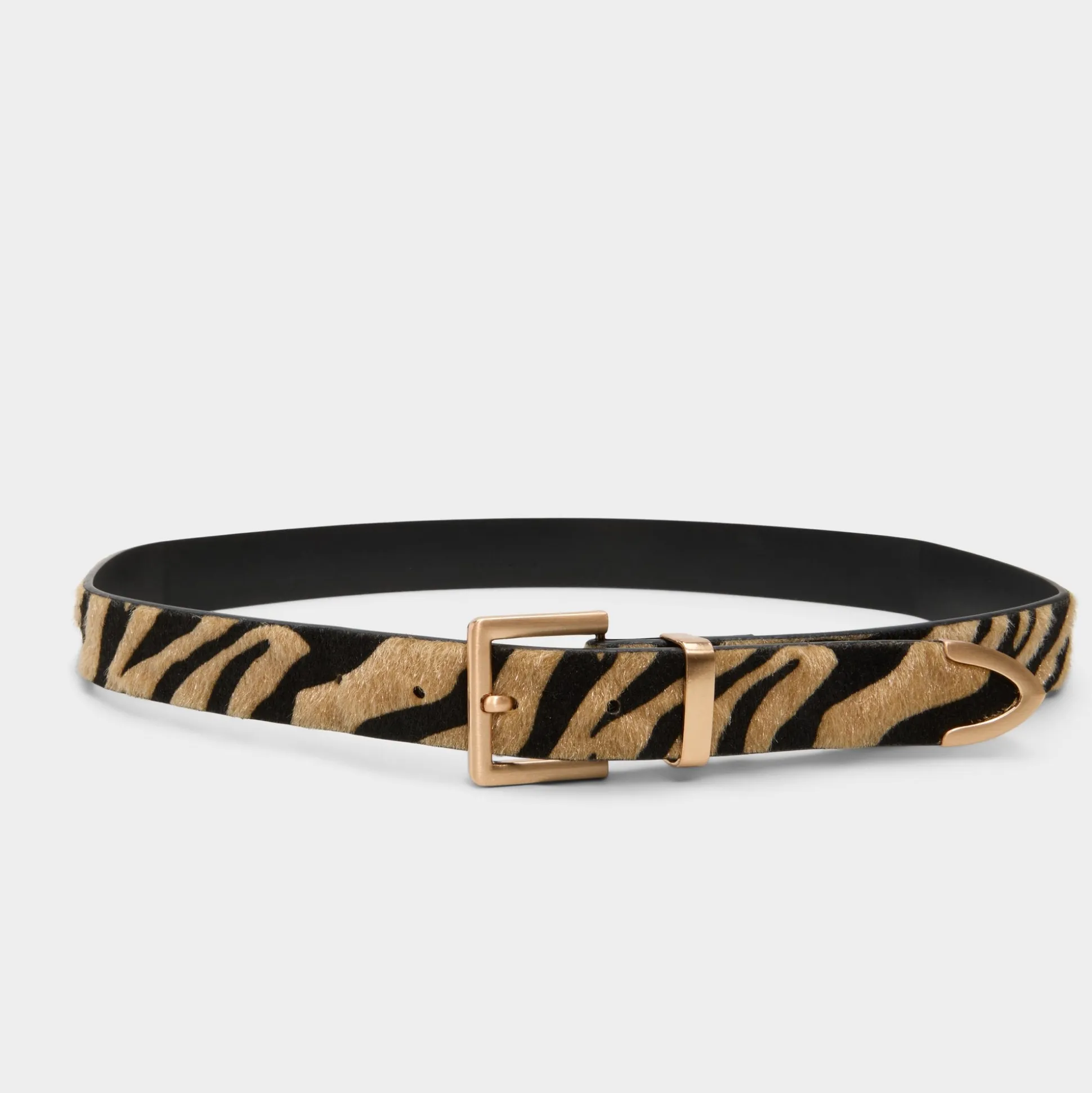 Tiger-striped calf hair wraps the waist with swagger, anchored by a sculptural buckle that turns a cinch into main-character energy. Cinch a blazer for coffee runs or belt a slip dress at gallery nights, showing how the belt sharpens every look.