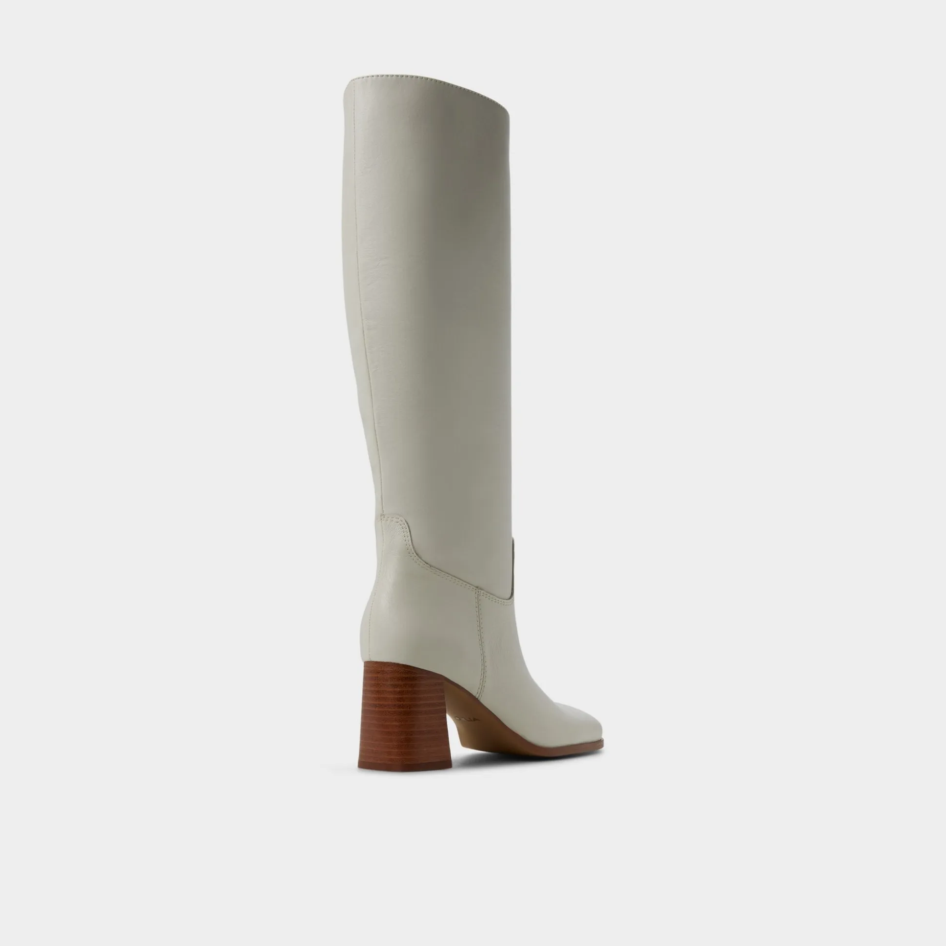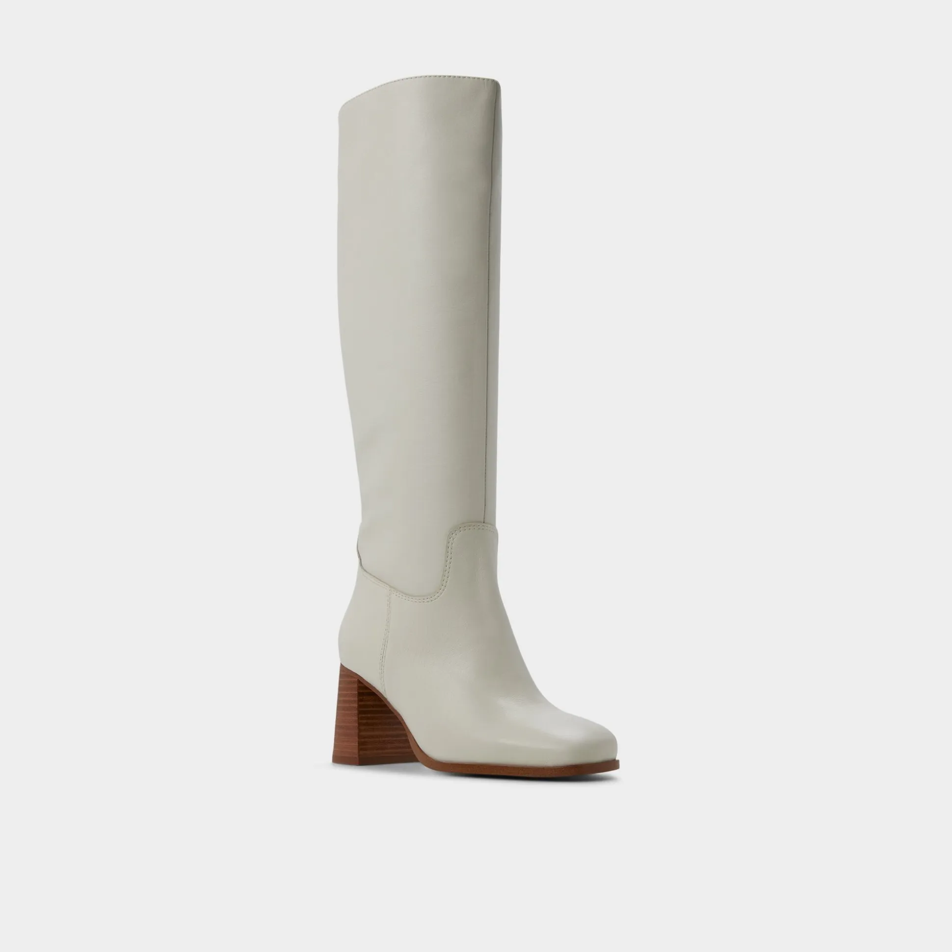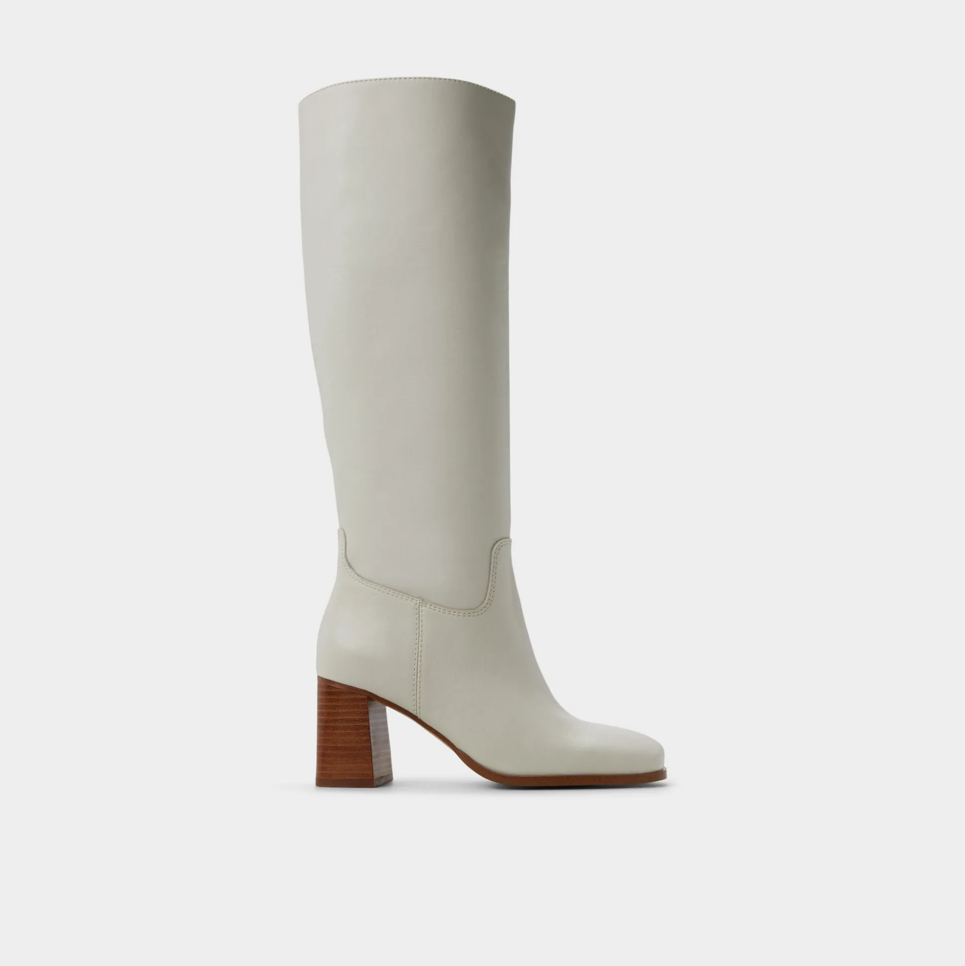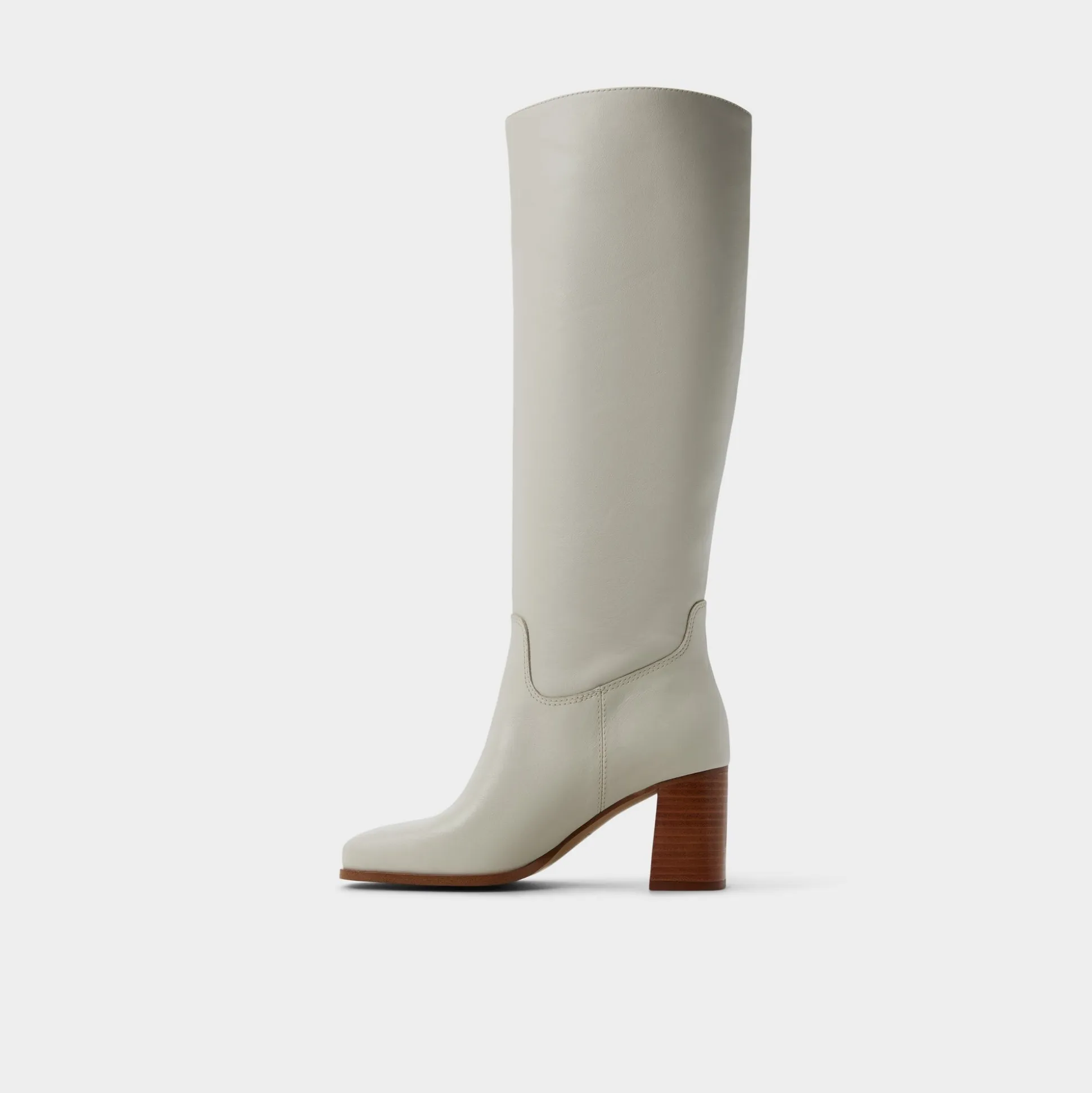 Supple ivory leather rises to the knee in a retro 70s silhouette, while stacked wood heels give lift from frosty mornings to late-night galleries, merging timeless polish with confident stride. Pair with sweater dresses for office brainstorms, or ground denim with a trench at weekend markets.