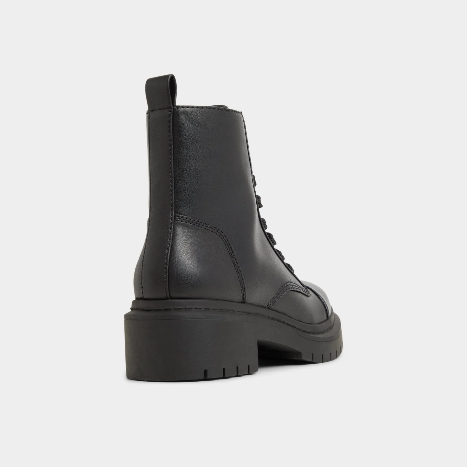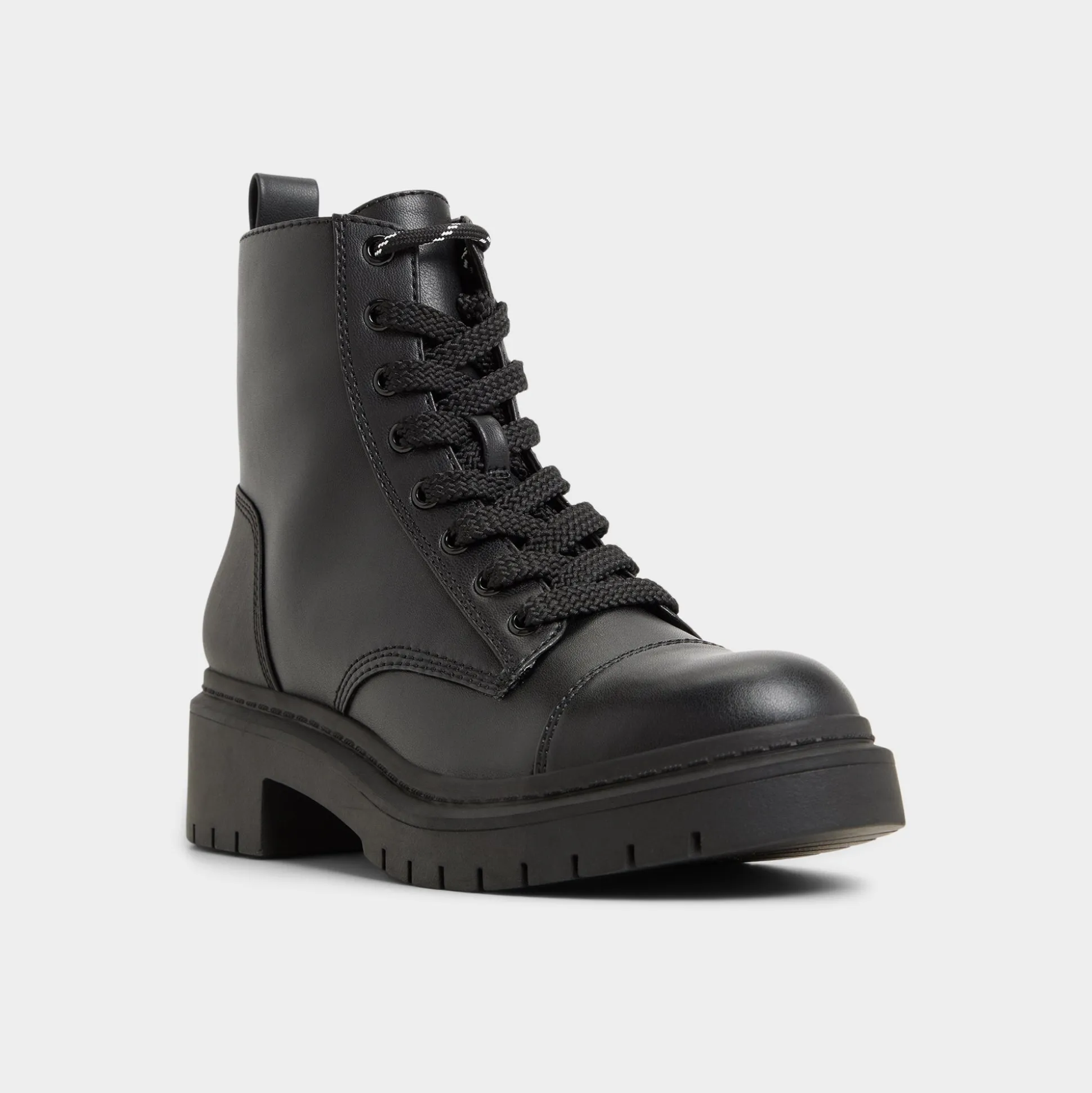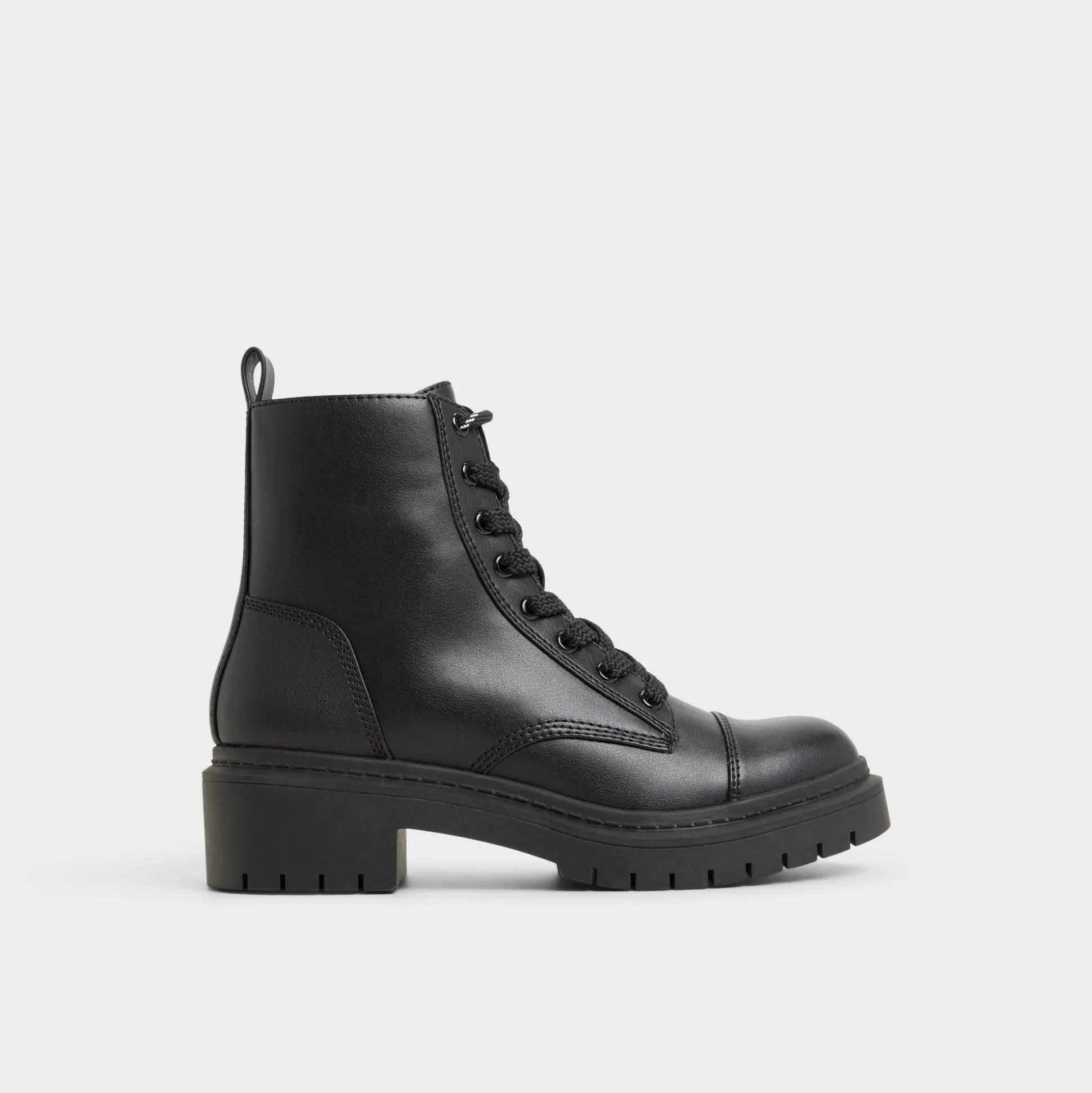 Black leather lace-up combat boots fuse rugged edge with city-smart polish, the chunky lug soles delivering sure footing for damp sidewalks and late-night detours, while a streamlined silhouette keeps the look versatile from work to after-hours. Pair with plaid minis for concerts, or ground a pared-down tee and relaxed pants for city-style commutes.