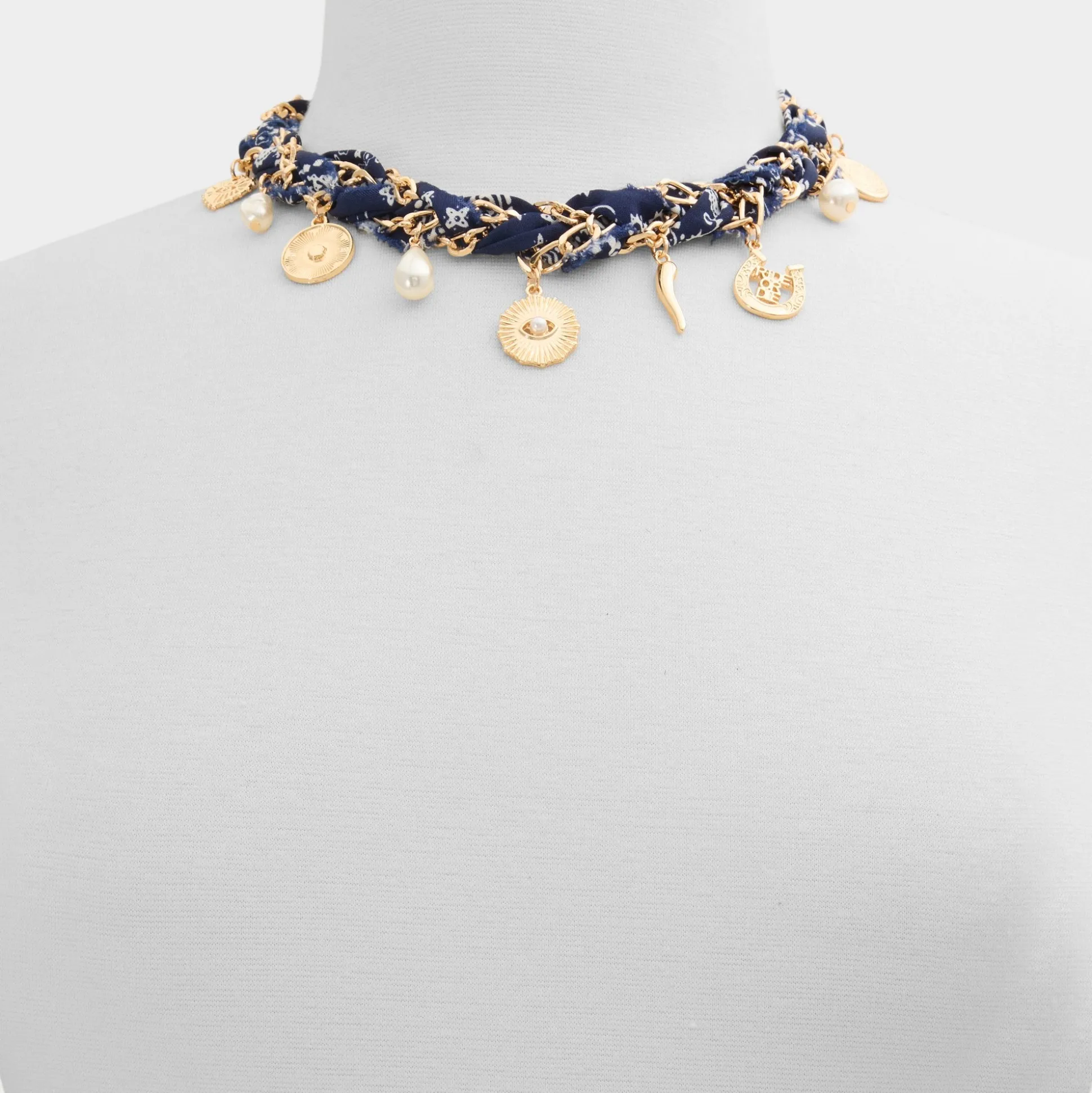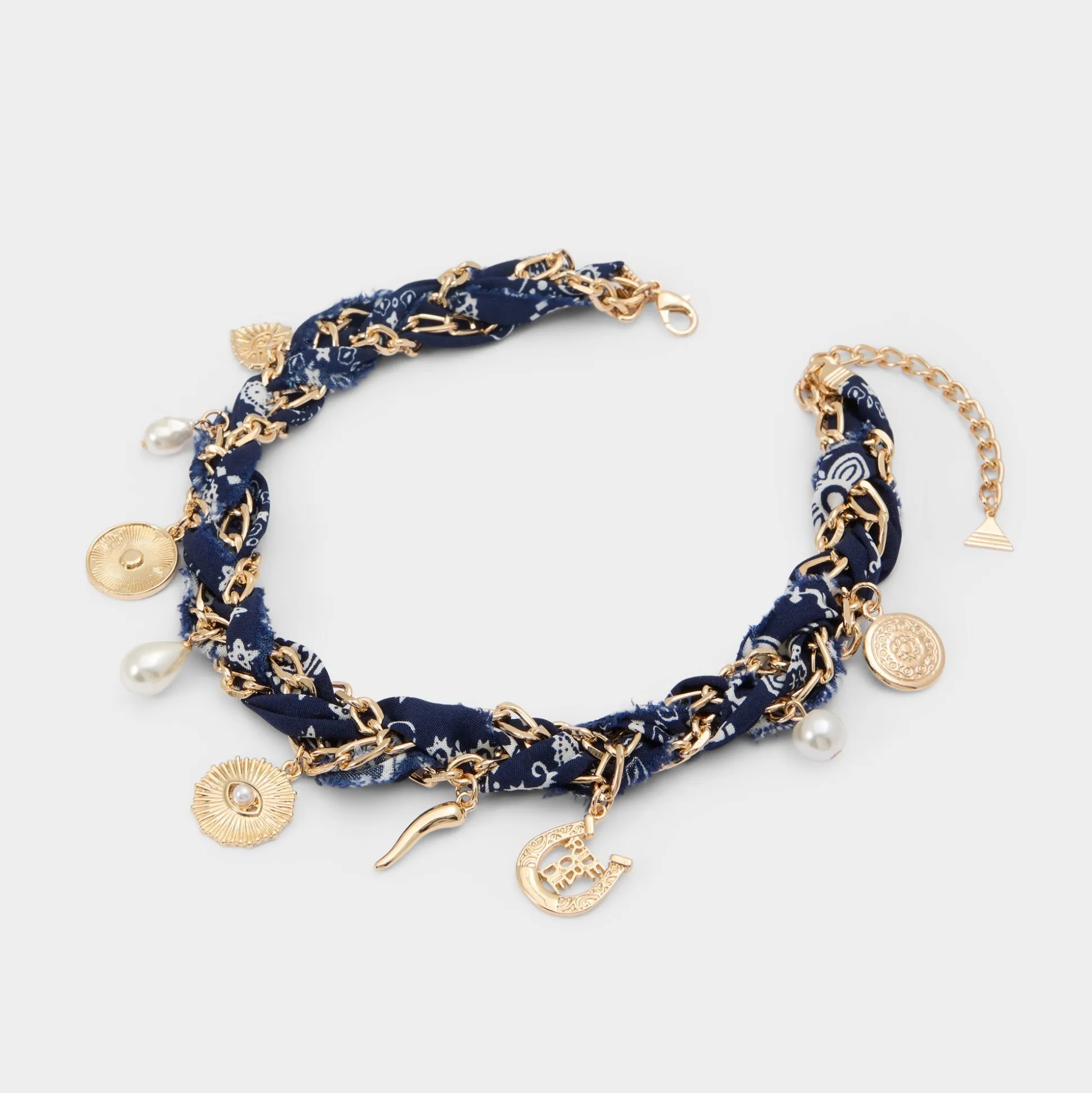 Bandana-print navy fabric weaves through a chunky gold chain, setting the stage for swinging pearls, coins and lucky talismans that turn the bracelet into a treasure hunt around your wrist. Pair it with a slim leather watch at coffee catch-ups or let it solo with a sundress on sunset boardwalk strolls, sealing the vibe.