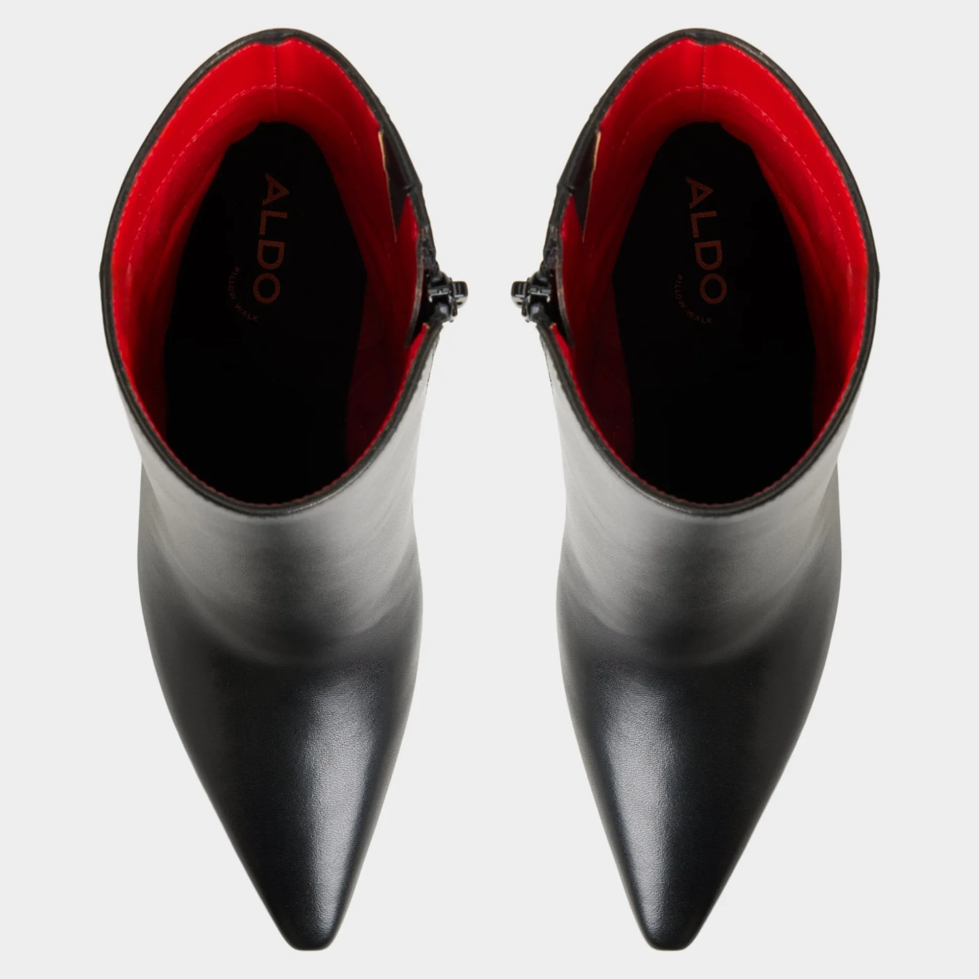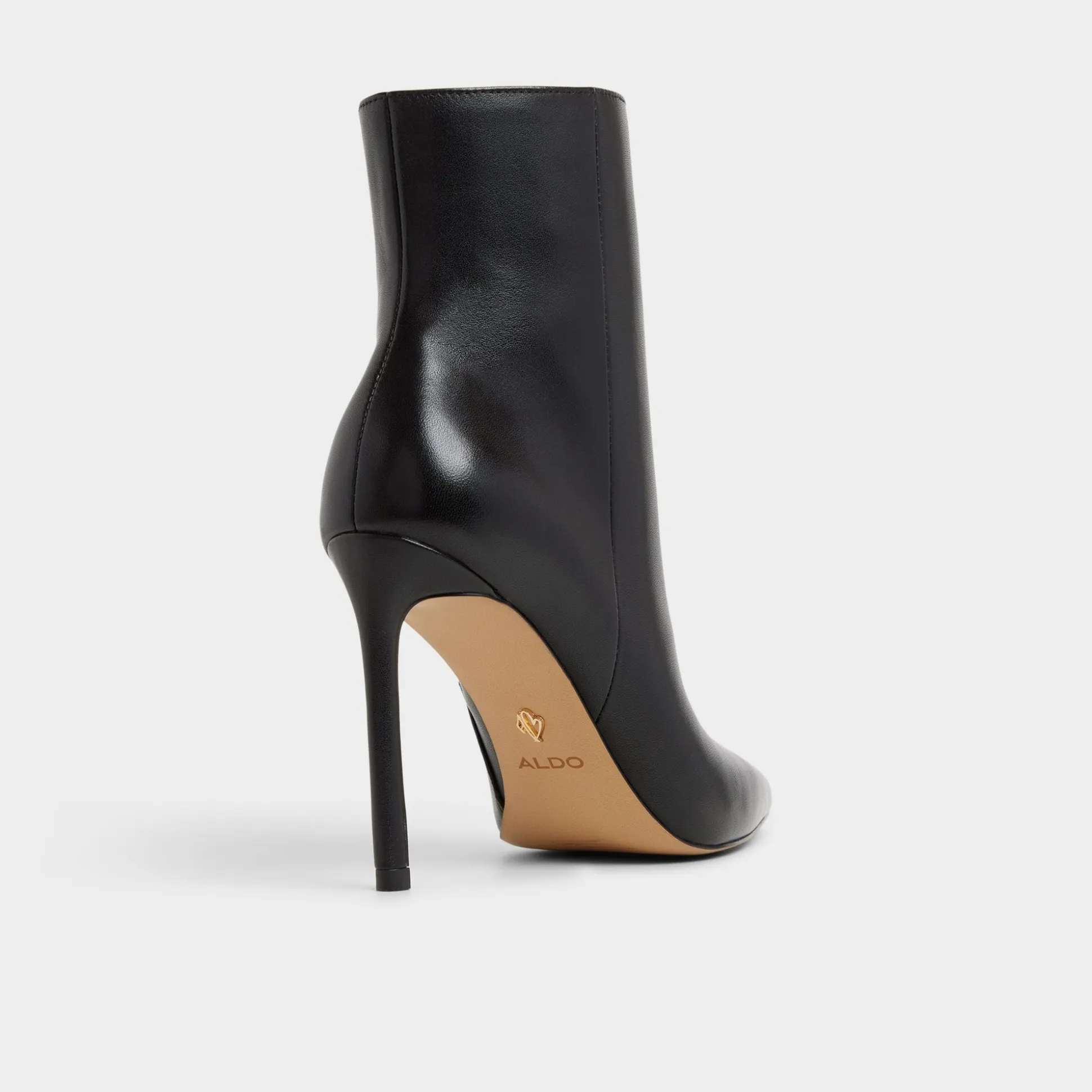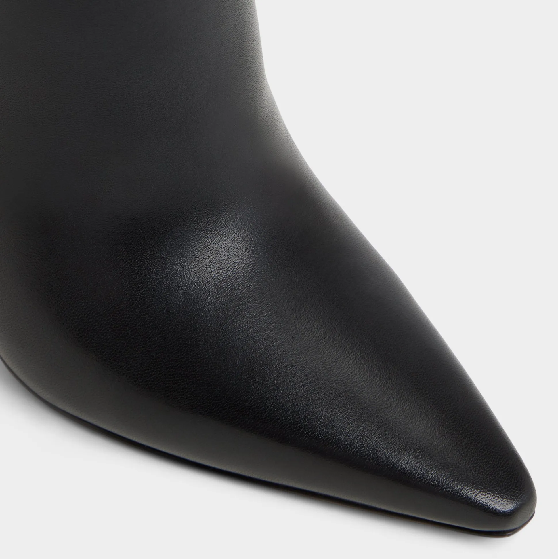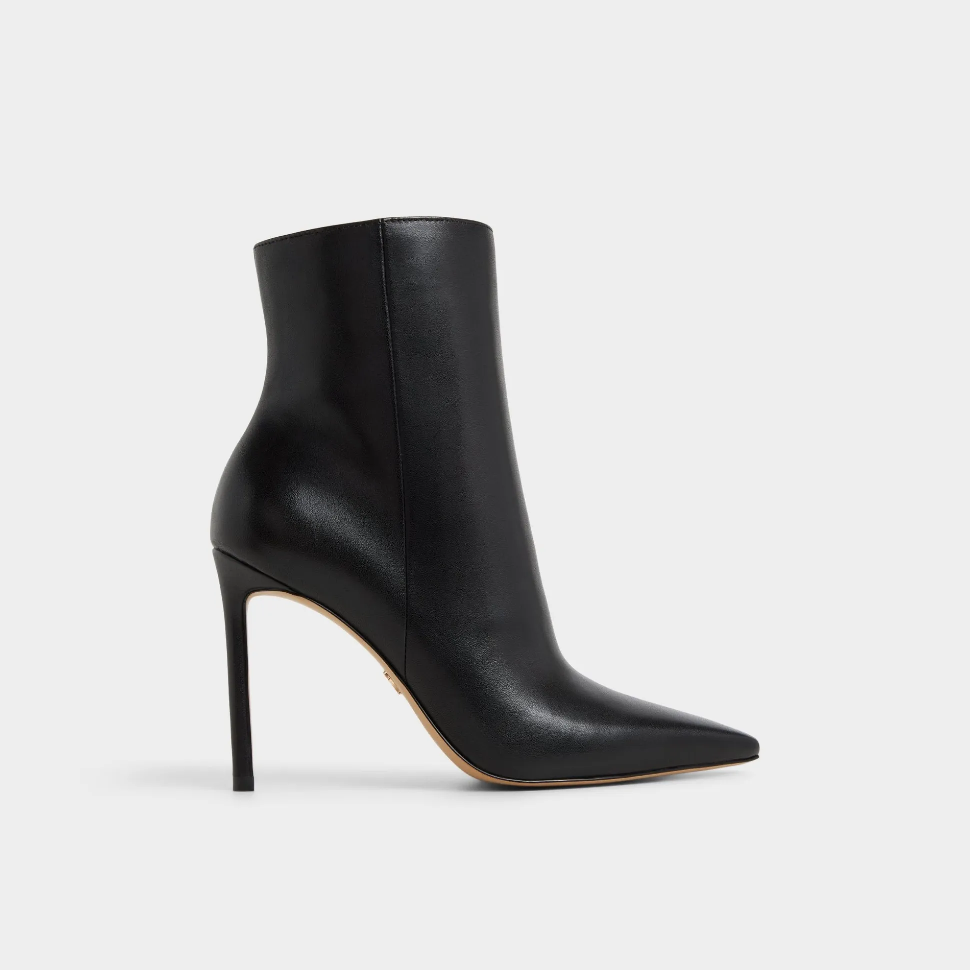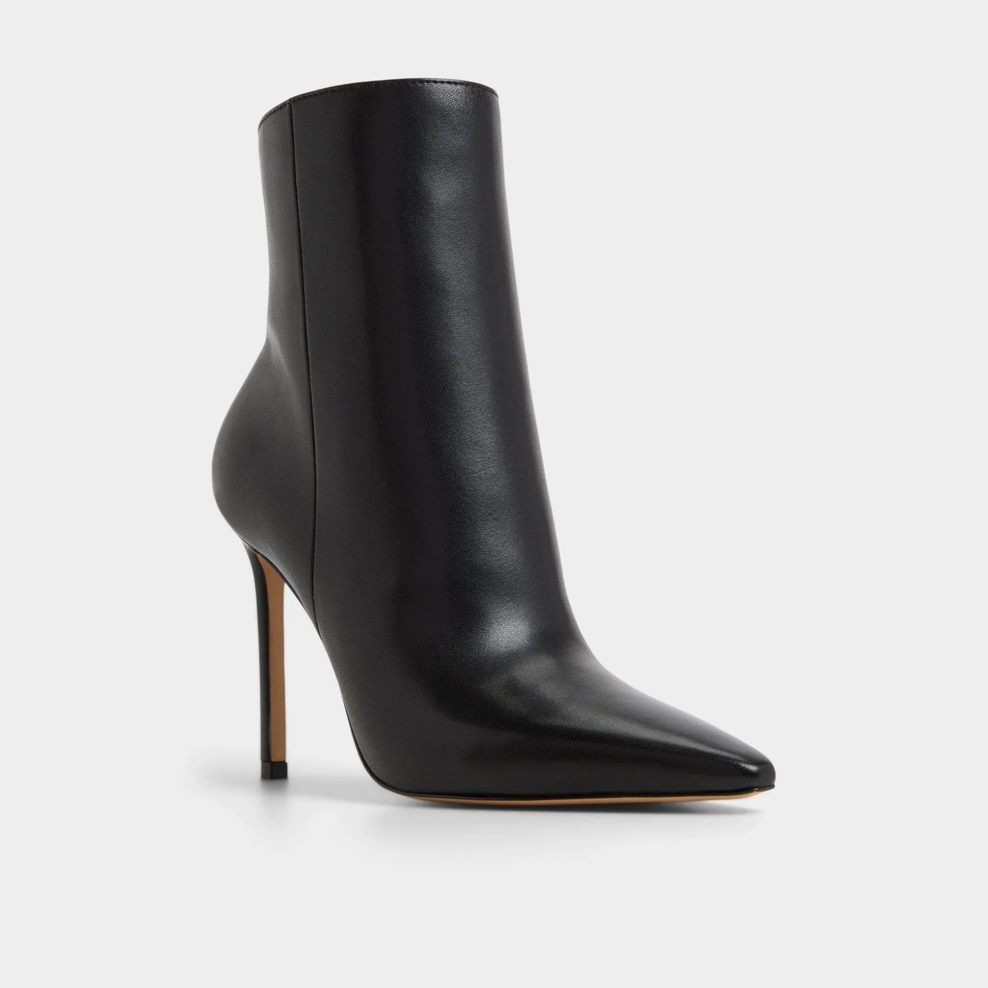 Midnight-sleek leather wraps this ankle boot in confident minimalism, while a blade-sharp stiletto heel carves extra height that feels equal parts city dare and late-night elegance, supported by a smooth side zip for easy exits. Pair with cropped tailoring for power lunches, or slip under a silky mini when champagne invites turn sidewalks into impromptu runways.