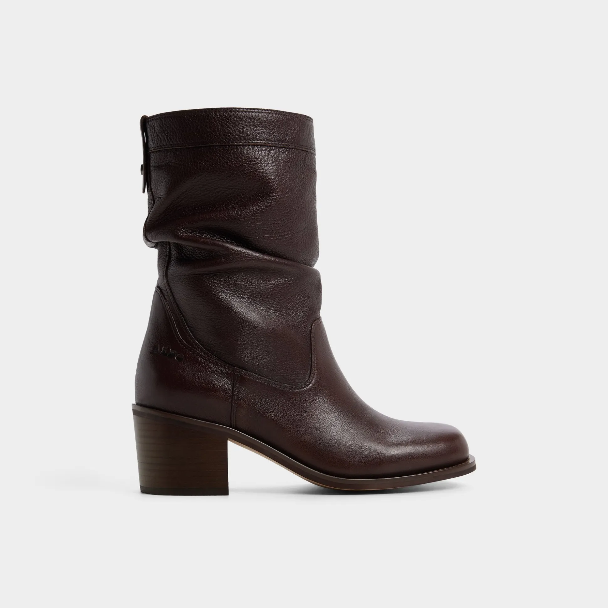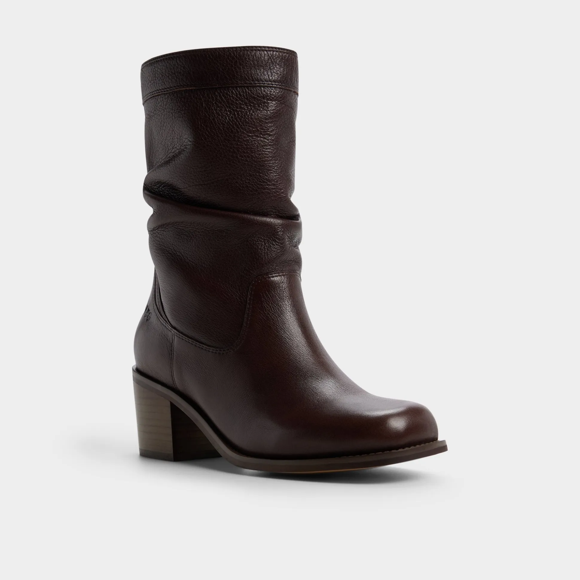 Cocoa leather drapes into a graceful slouch around the calf, pairing with a soft lining and a sculpted stacked block heel that brings steady comfort to brisk commutes and cafe check-ins. Pair with skinny denim for gallery afternoons, or ground a cozy sweaterdress for late-night ramen runs.