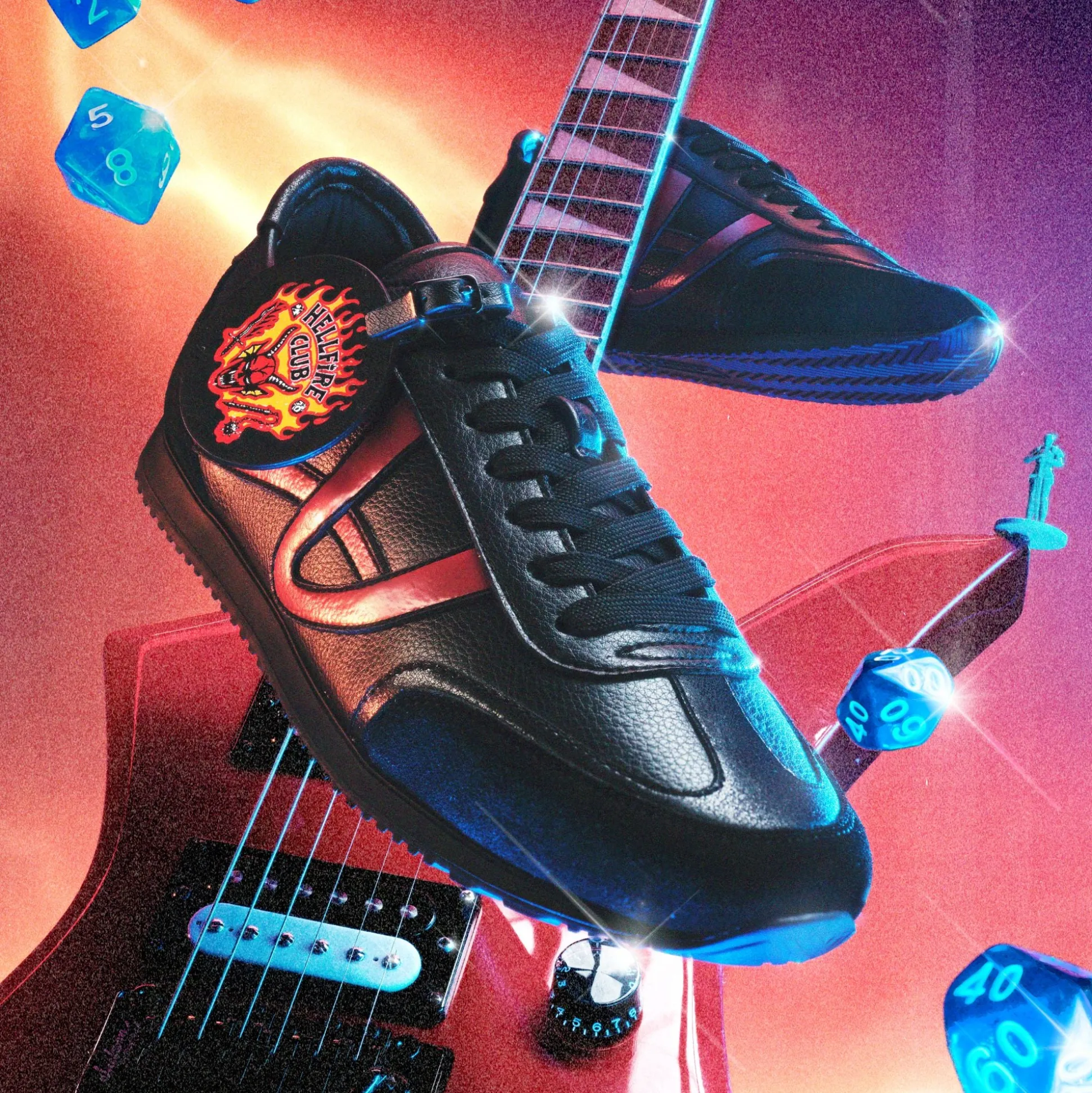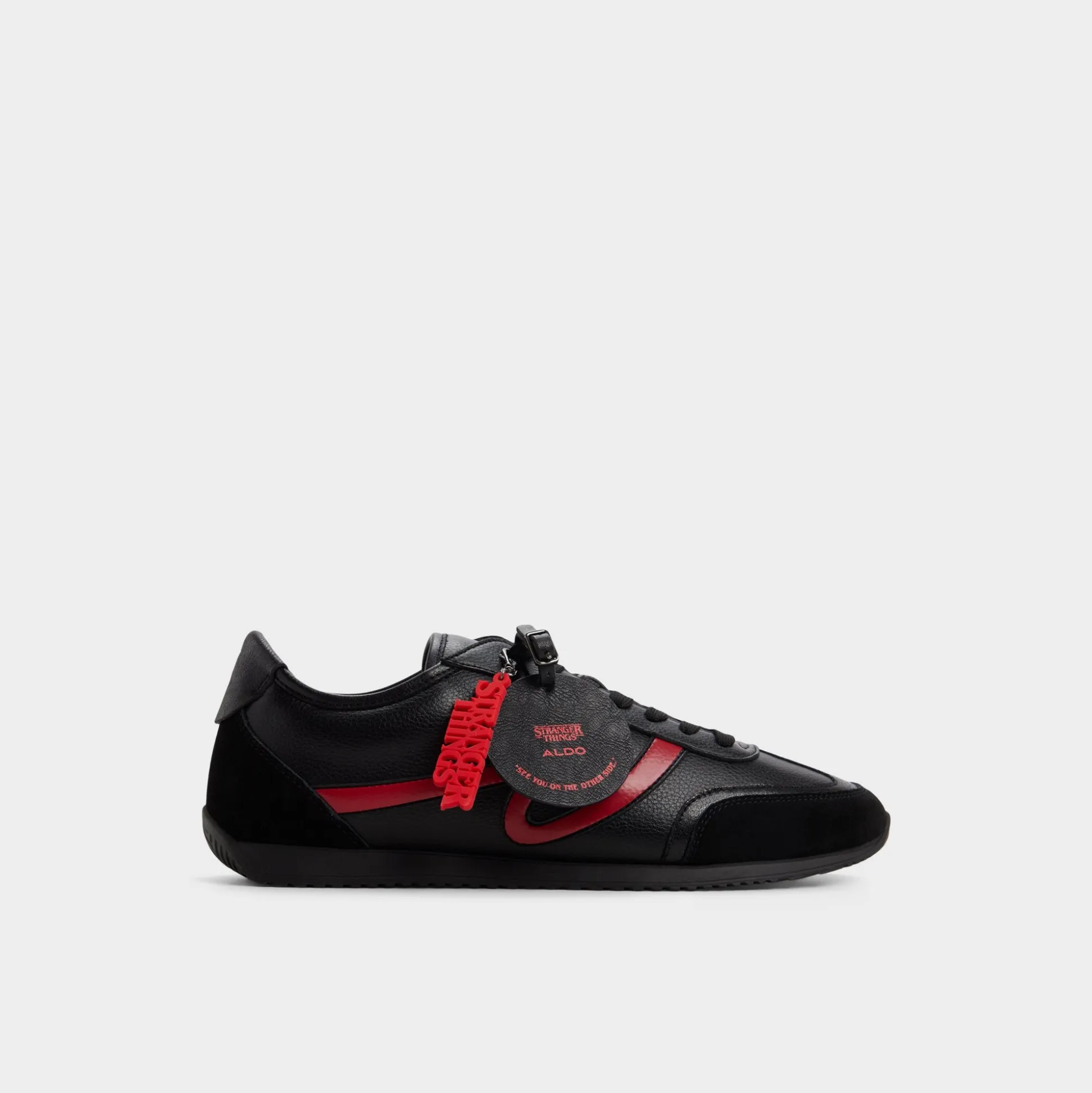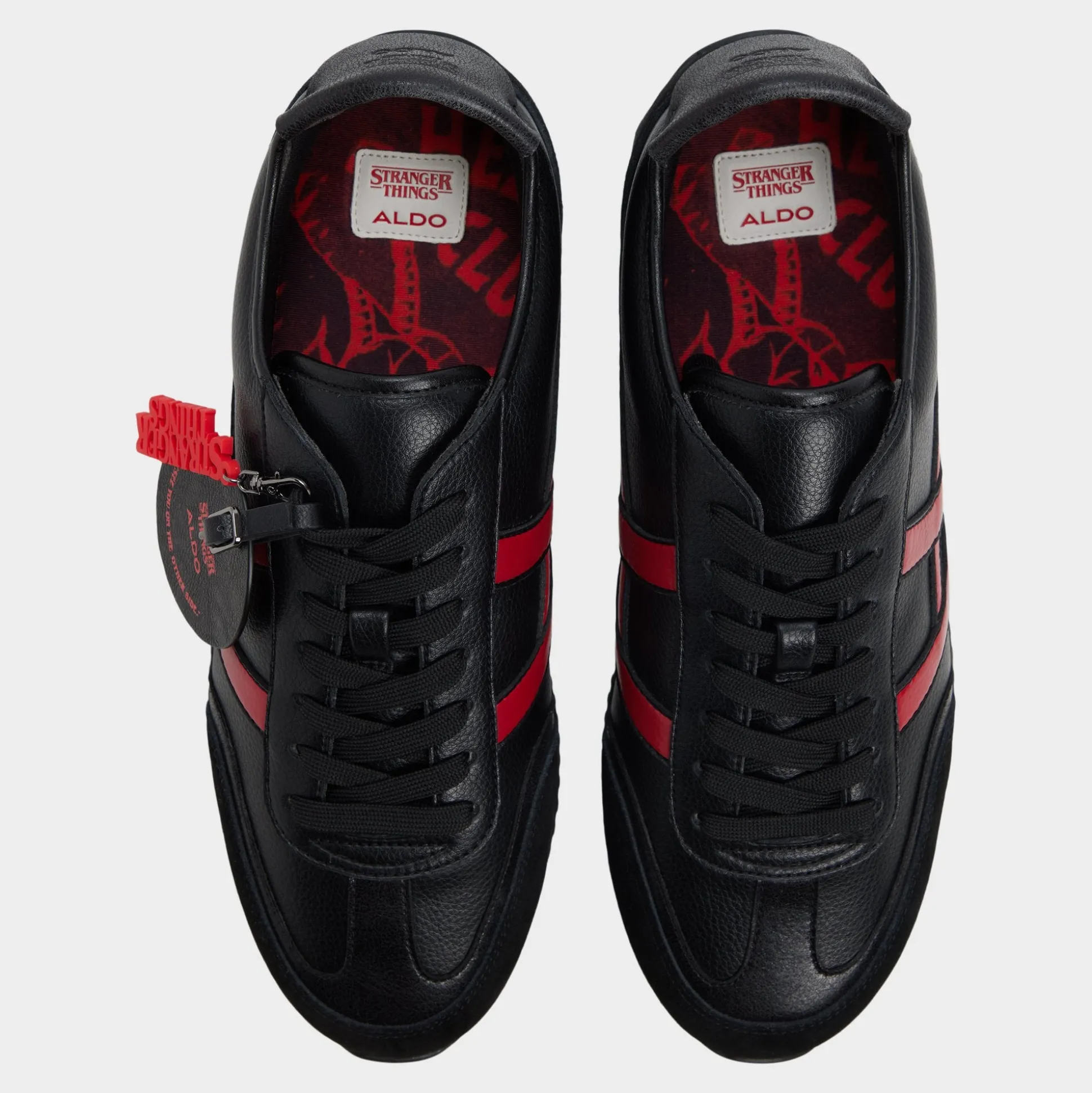 Pledge your allegiance to the Hellfire Club in these limited-edition Stranger Things x ALDO black leather runners. The removable hang tag and Hellfire print sock bring a hotter than hellfire, rebellious energy to every step.