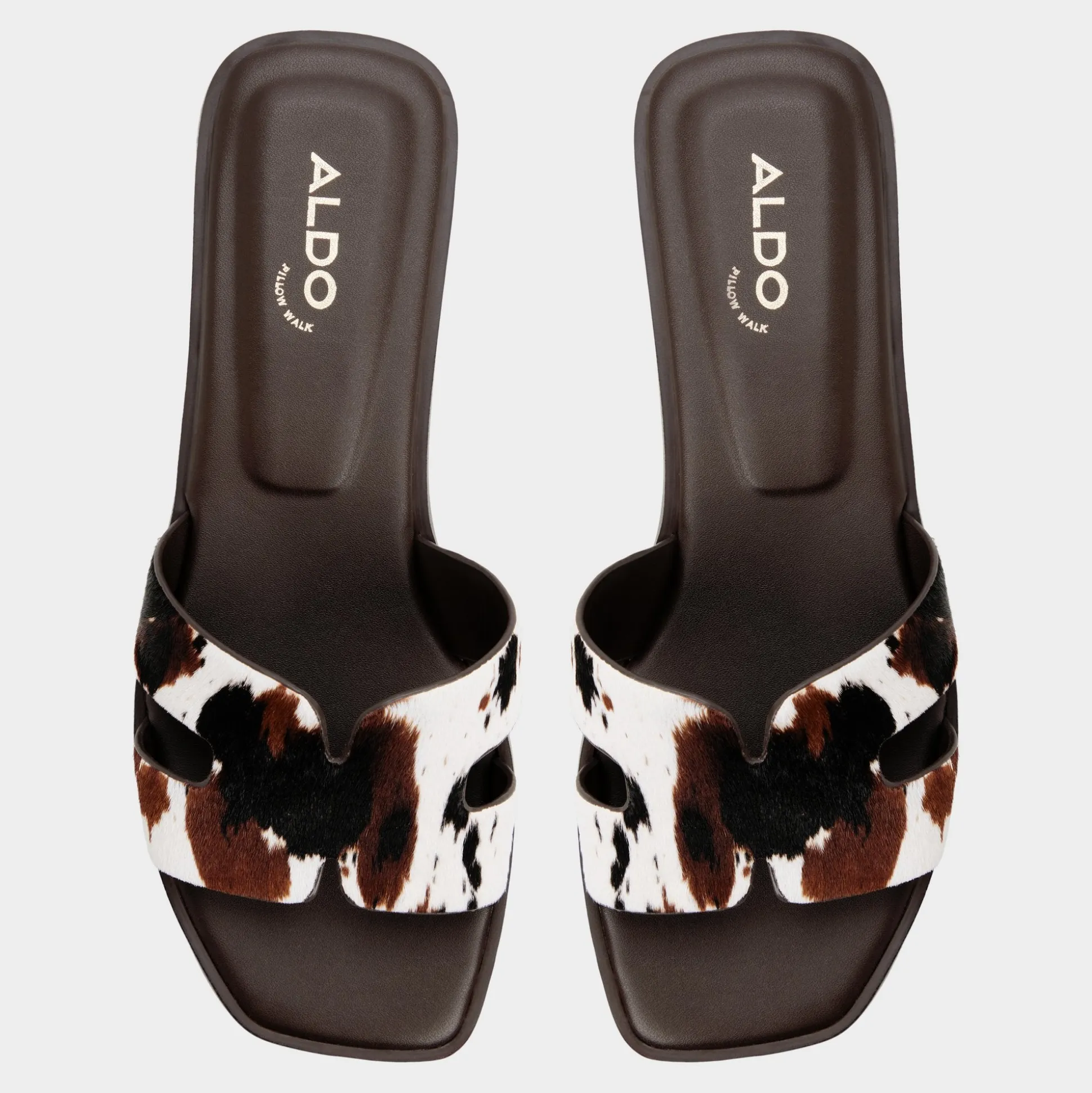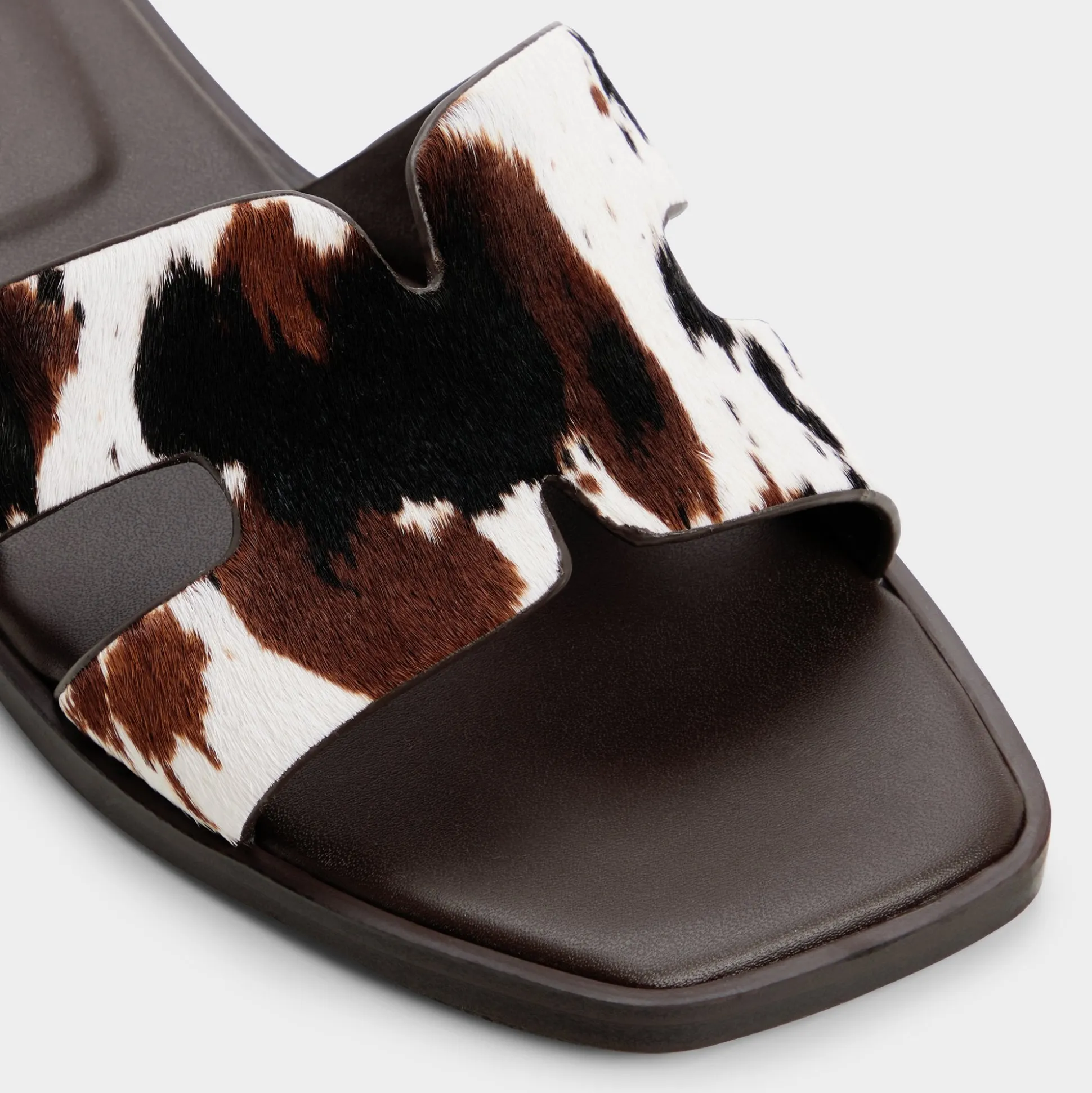 Spotted haircalf cow-print adds fearless flair to these cut-out slides, and a supple leather footbed cushions every step, keeping comfort chic from sunlit sidewalks to candlelit dinners. Pair with white denim for brunch, or slip beneath a sundress for patio strolls and sunset dates, ready for city nights.