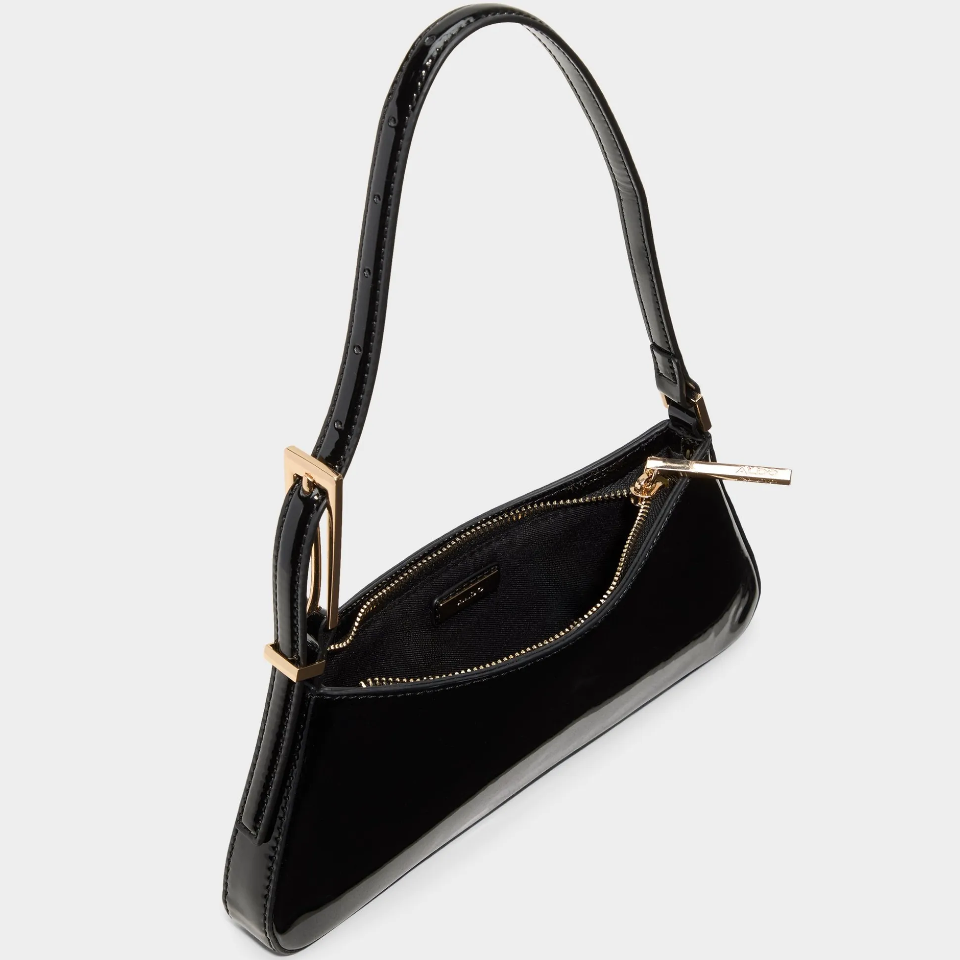 High-gloss patent leather adds shine to this slim baguette, its trapezoid silhouette framed by tonal stitching and gold hardware, all zipped tight for minimalist nights. Tuck it under a satin blazer for gallery openings or sling it over a ribbed tank and cargos for late-night bites.