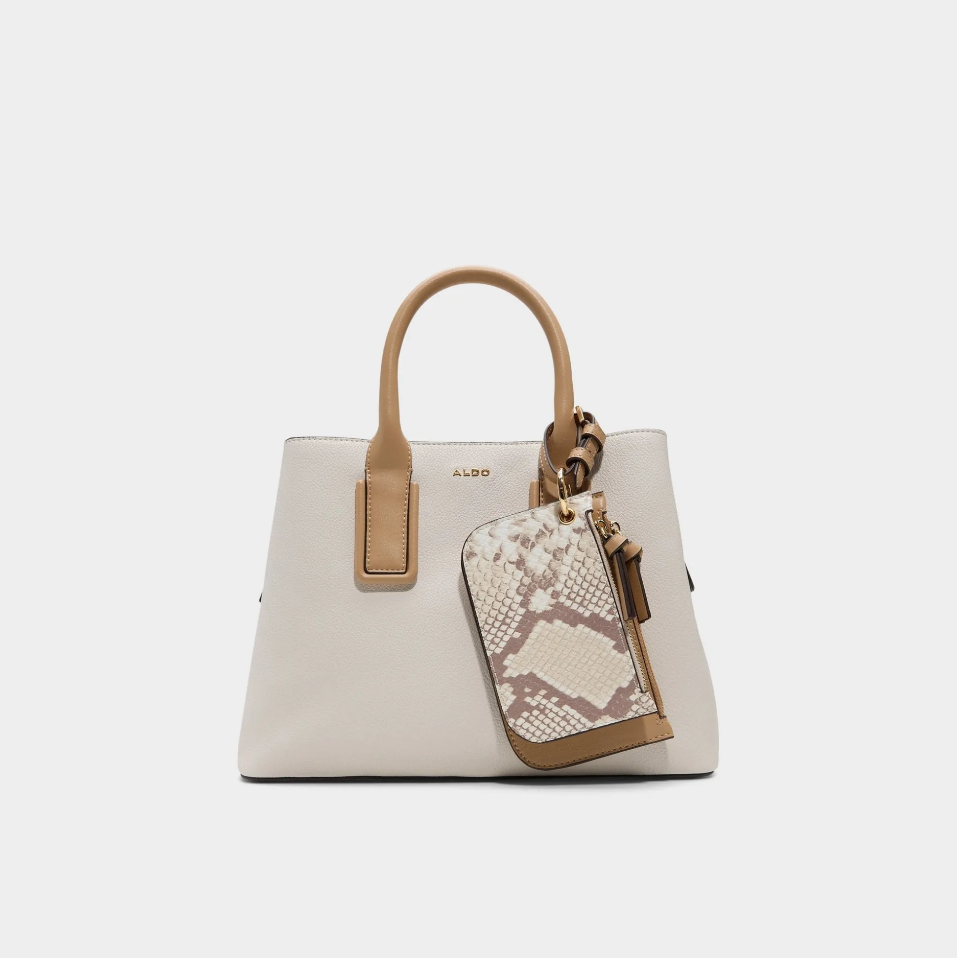 Snakeskin-printed pouch dangles from this beige satchel, detaching with a quick clip so the main bag stays polished while the pouch goes solo, adding a playful, texture-rich twist to everyday moments. Carry it to meetings with tailored separates or sling it over weekend denim for effortless, city-ready finishes.