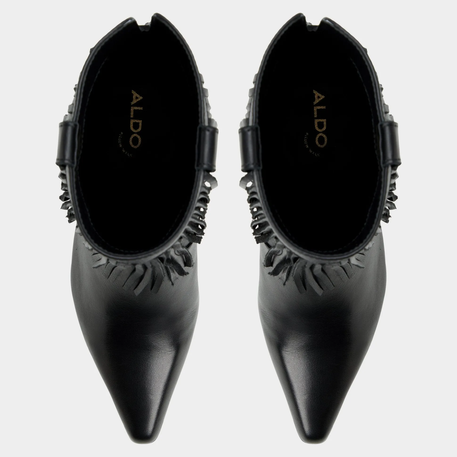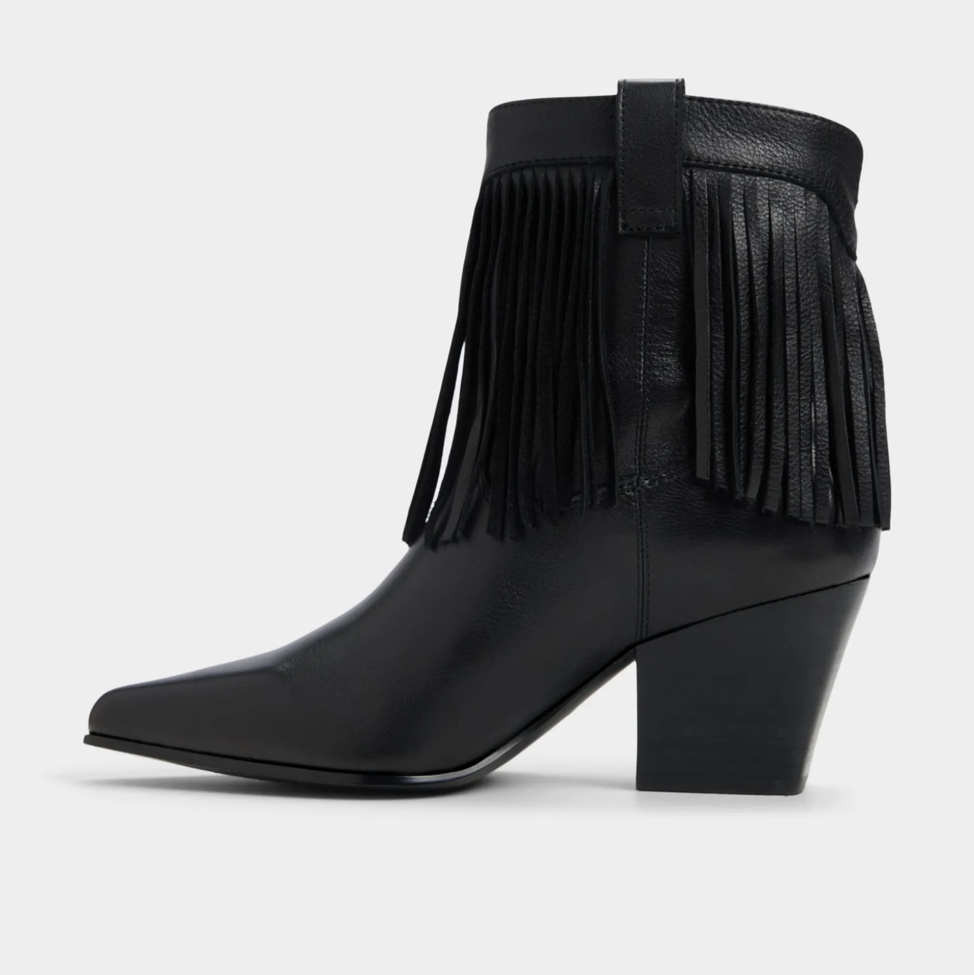 Fringe-trimmed supple black leather blooms around a pointed toe block heel, blending Western swagger with city polish in a statement silhouette that moves with you from street-ready errands to after-dark moments. Pair with cropped flares for record-store Saturdays, or swap in a swishy midi when festival nights call for extra rhythm.