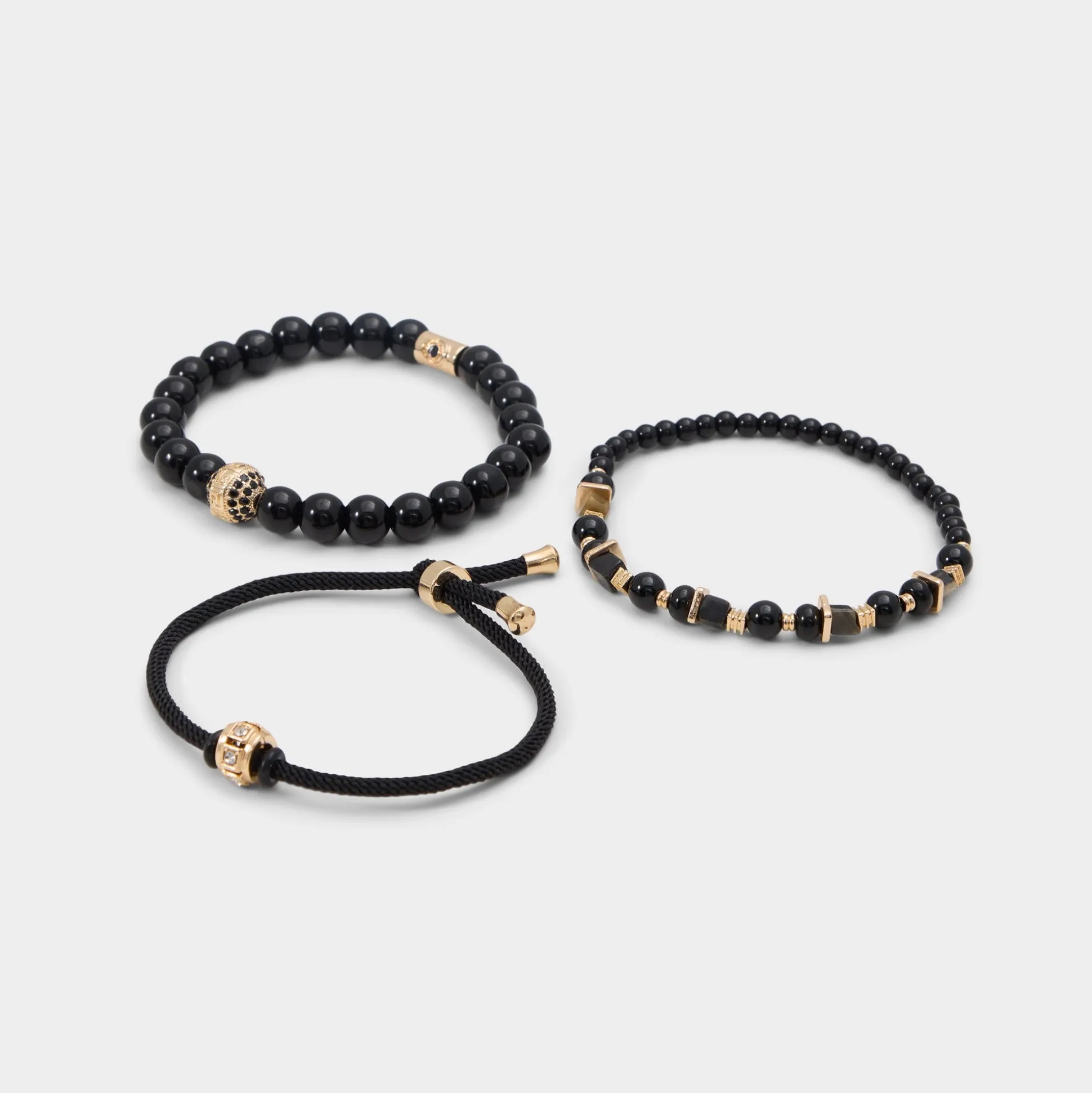 Glass beads mix-and-match sizes circle the wrist in a black-sheen glow punctuated by gilded cubes and a pave sphere, delivering a ready-made trio that never feels fussy. Layer them with a denim jacket and slip dress for cocktails, or stack beside a chunky knit for weekend coffee runs.