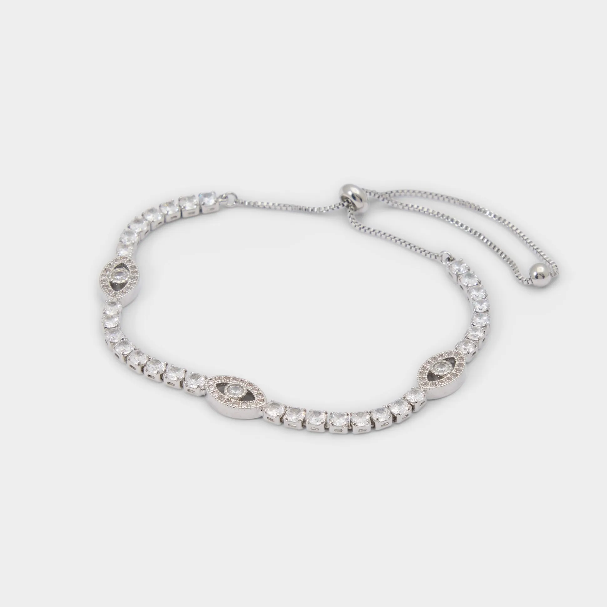Triple evil-eye charms punctuate a sparkling tennis bracelet, turning cubic zirconia into a talisman that catches light and flickers with silver-toned confidence. Cinch the slider beside a satin slip for rooftop dinners, or stack with beaded cuffs for casual coffee runs.