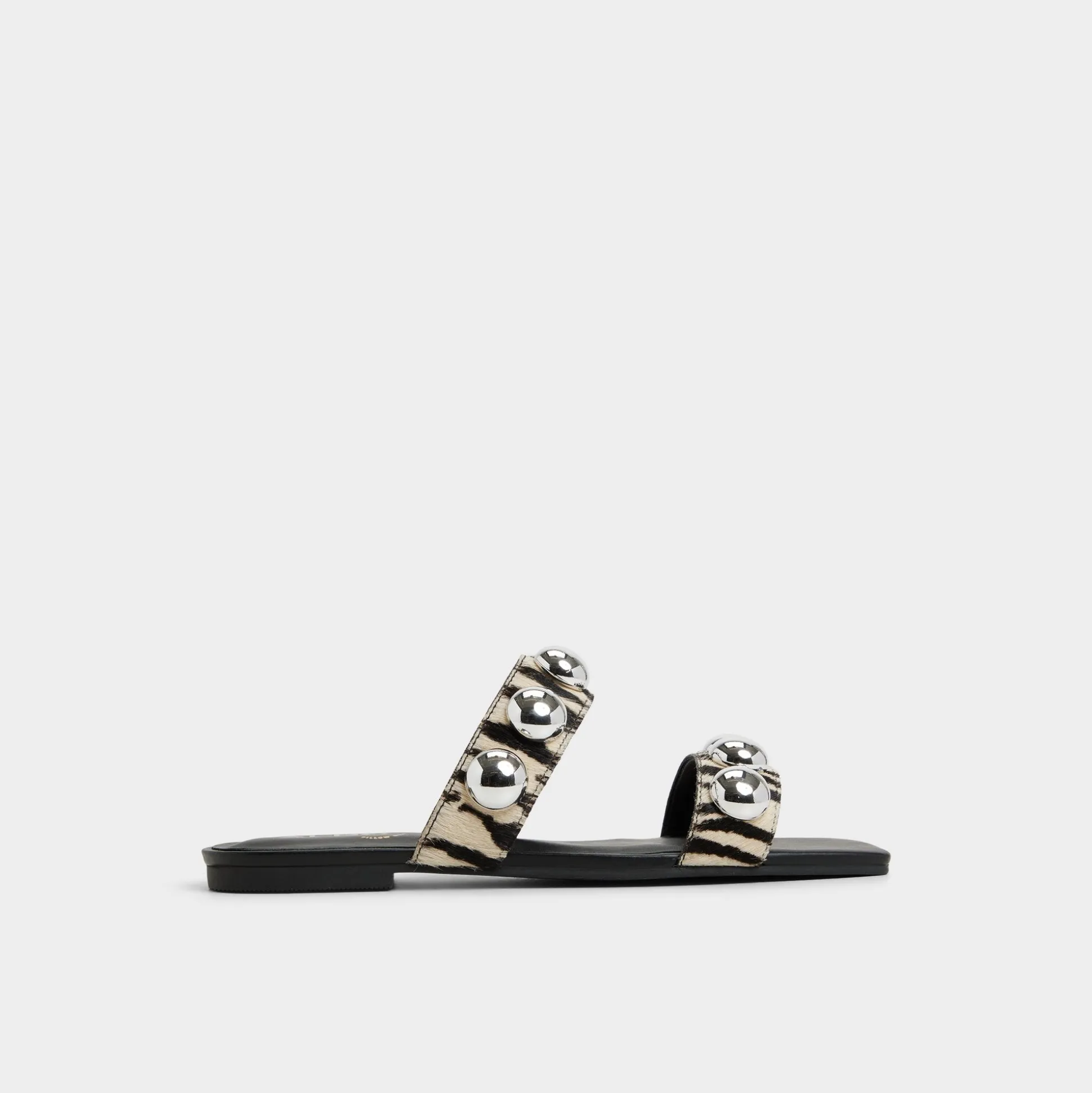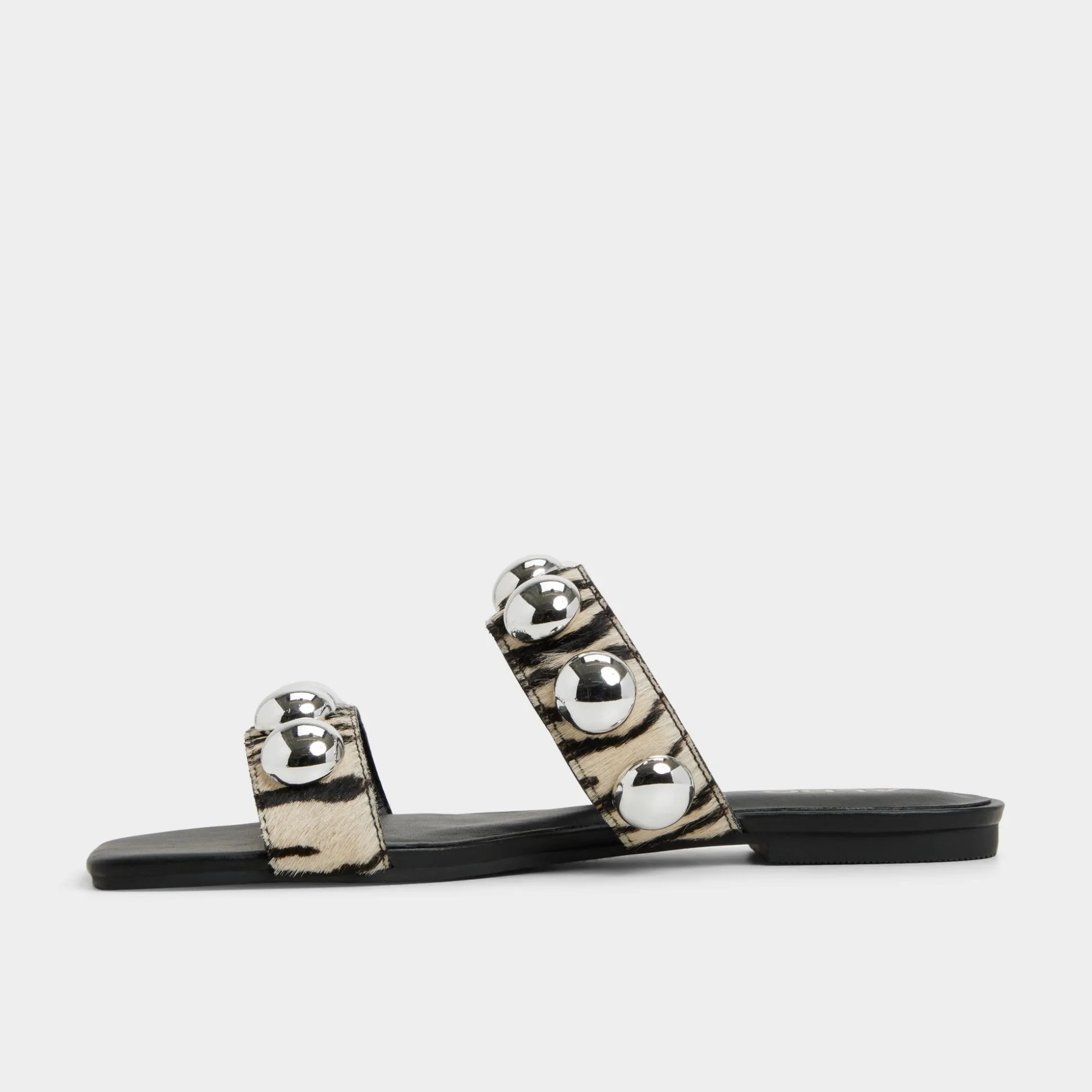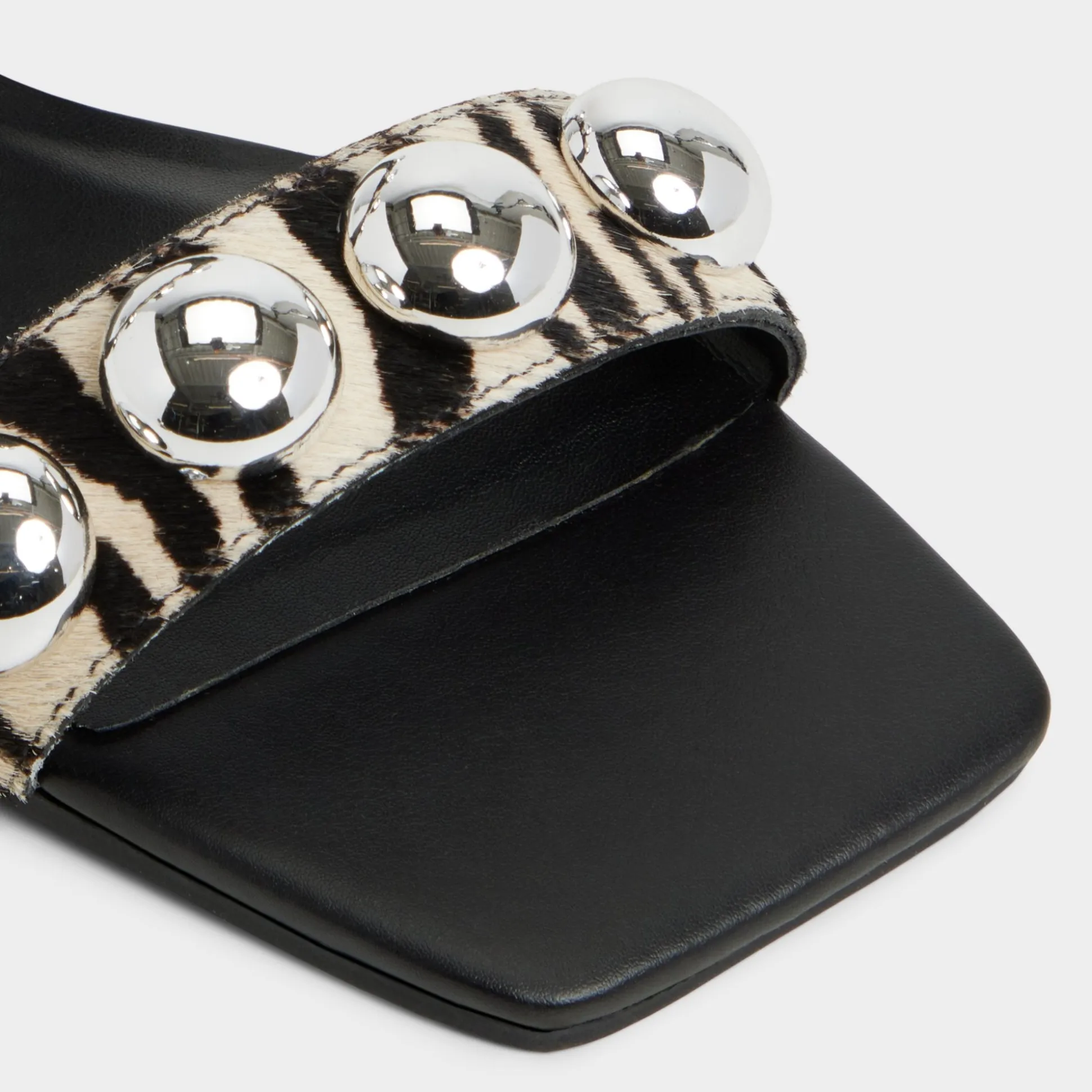 Zebra-striped straps with glossy studs crown a light, airy sole, turning every step into a bold, carefree moment and letting city sidewalks feel like a playful runway from morning coffee to evening rooftop. Pair with cut-off denim for festival vibes, or slip into a silky slip dress for sunset drinks and after-dark strolls.