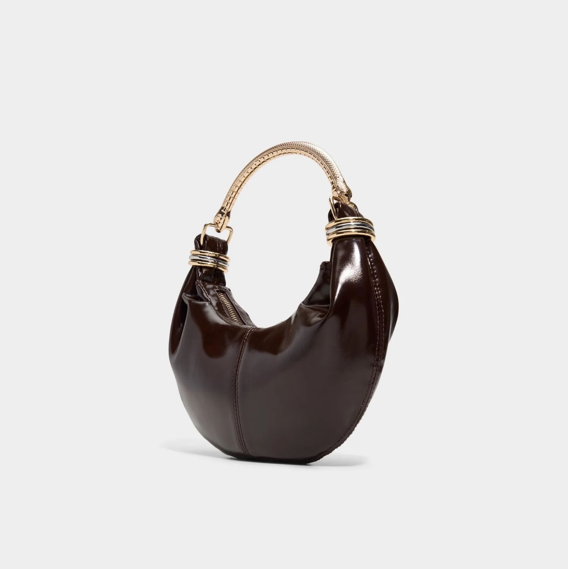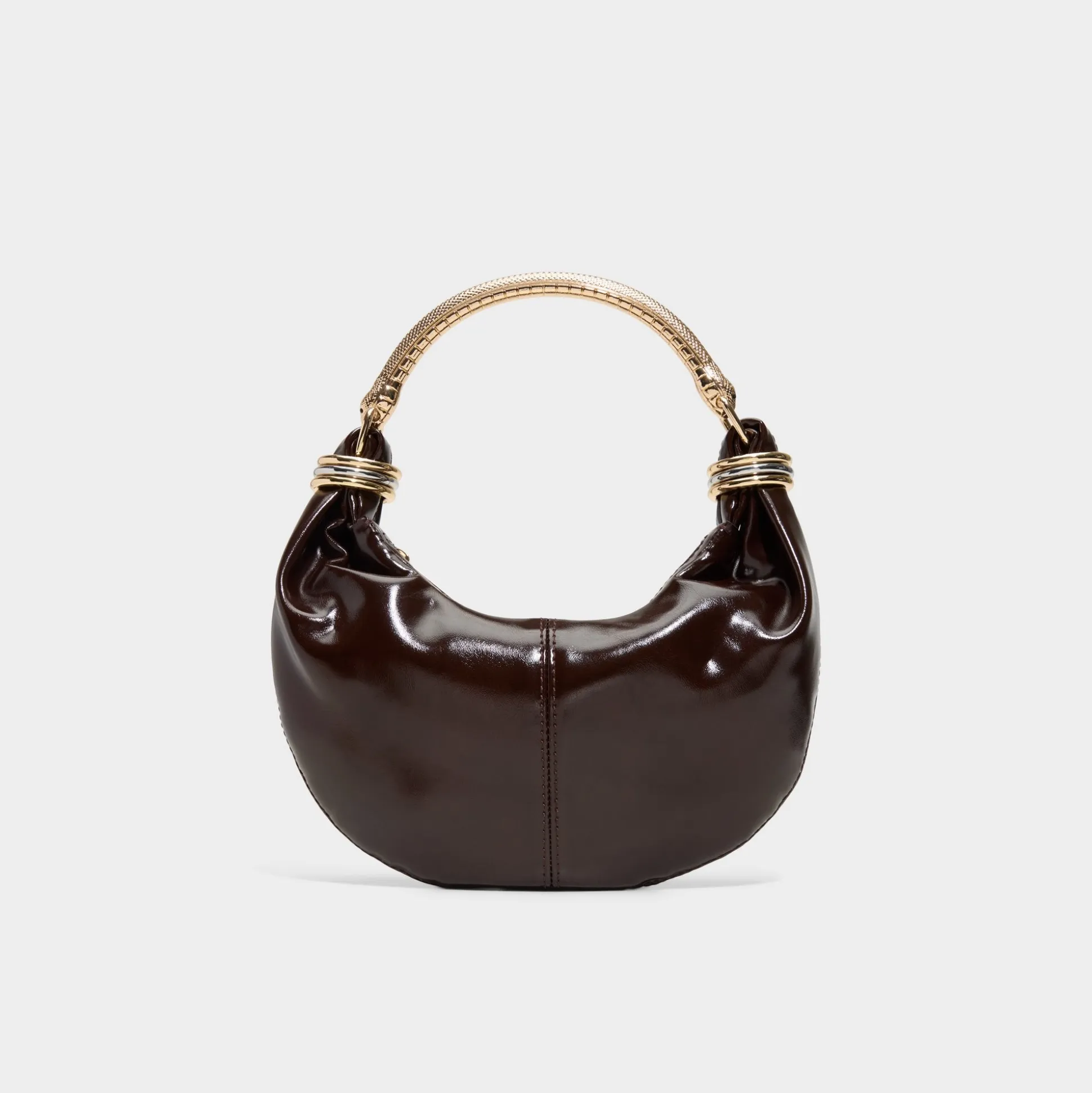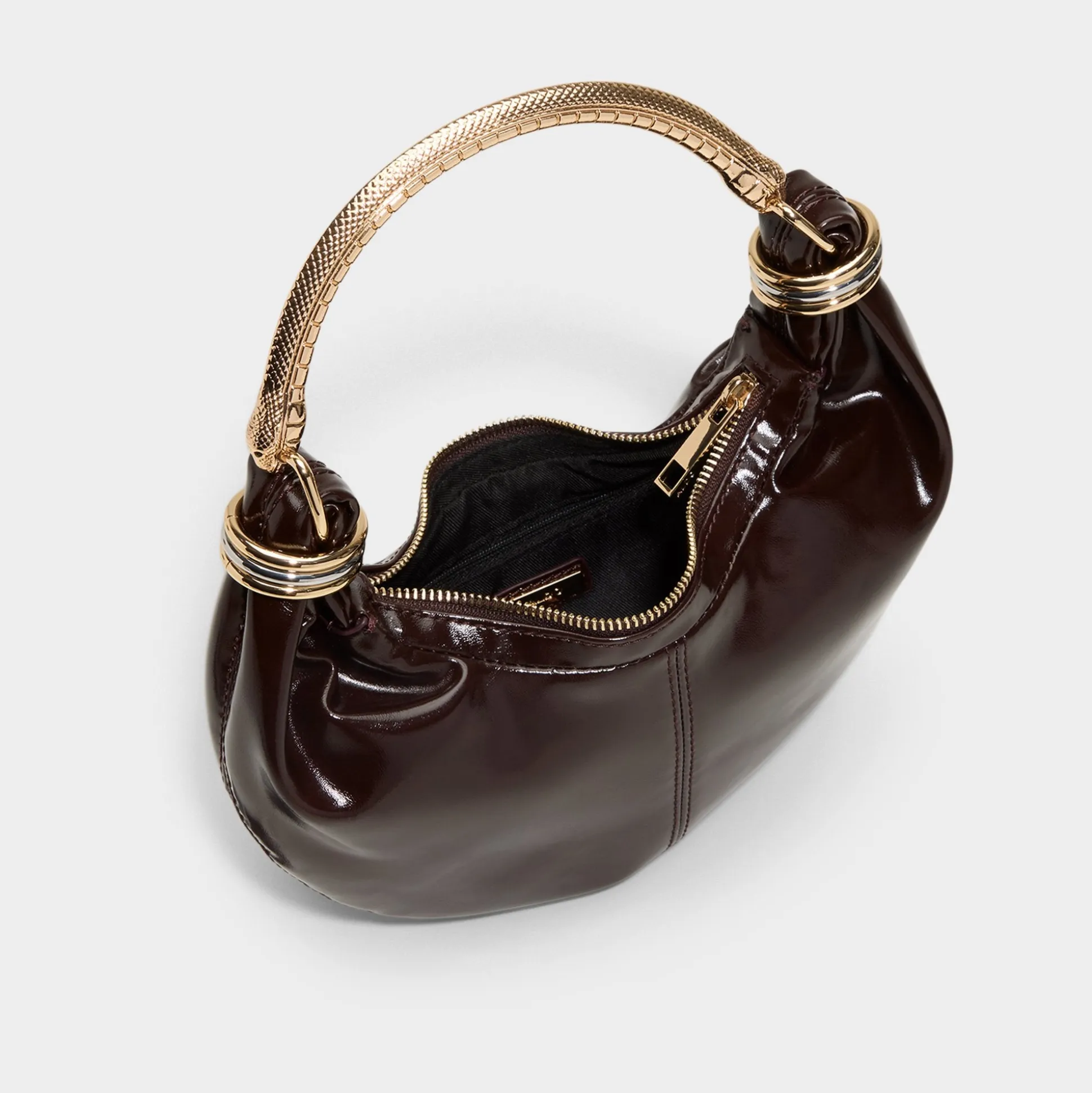 Moon-shaped silhouette, glossy patent leather arches over a sculptural gold handle wrapped in rings like stacked bangles, turning everyday elegance into a carefree statement for city nights and weekend wanderings alike. Tuck it under a tailored blazer for post-work drinks, or sling it over a silk slip at rooftop parties to finish the look with city-glow polish.
