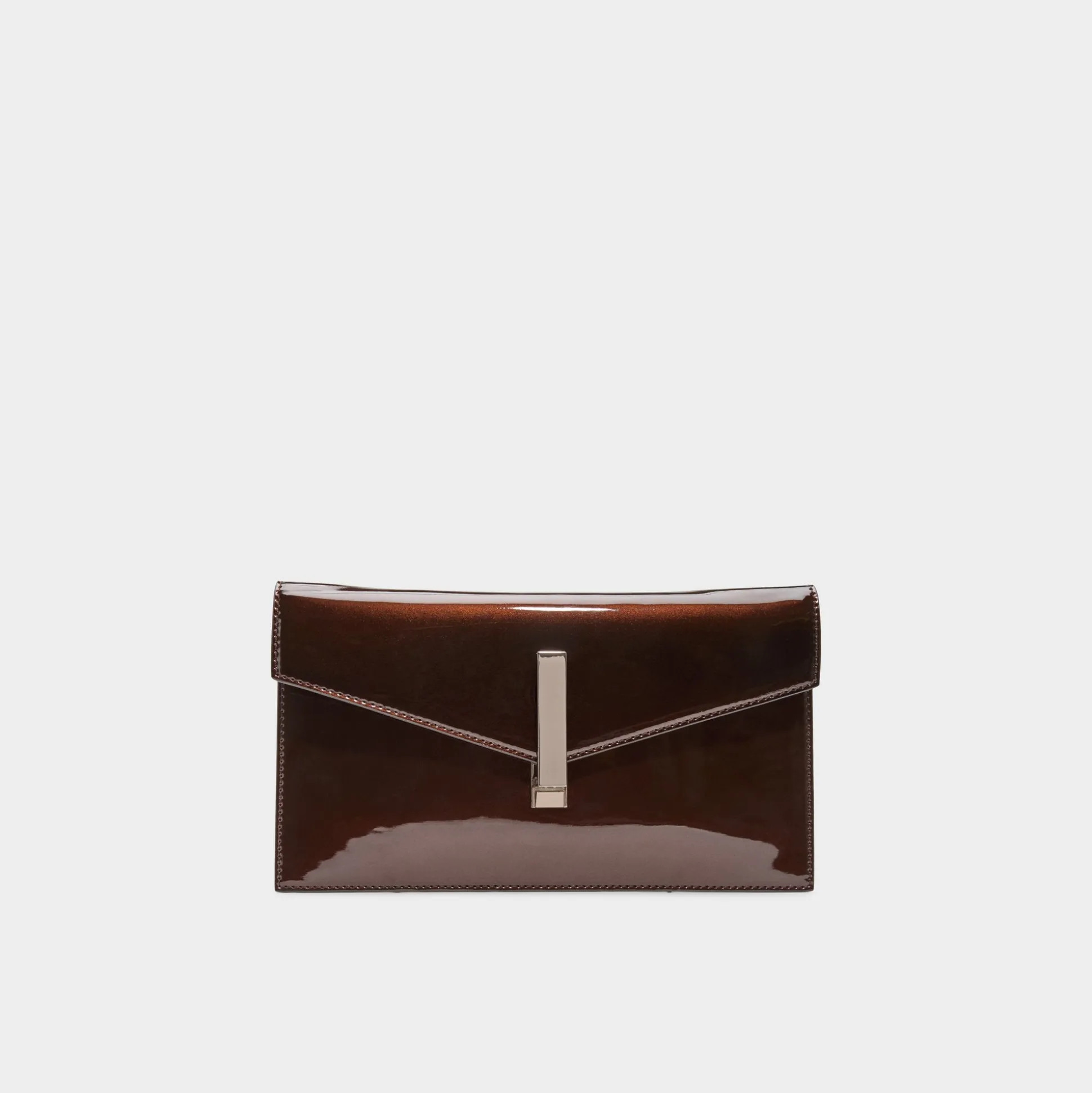 Espresso patent gloss brightens a curved envelope silhouette, with a sculptural silver bar snap revealing just enough space for the essentials, and a refined, architectural profile that feels instantly polished for evenings and rooftop dinners. Carry it under a satin blazer for rooftop dinners, or sling it over a knit midi and boots for artsy gallery afternoons.