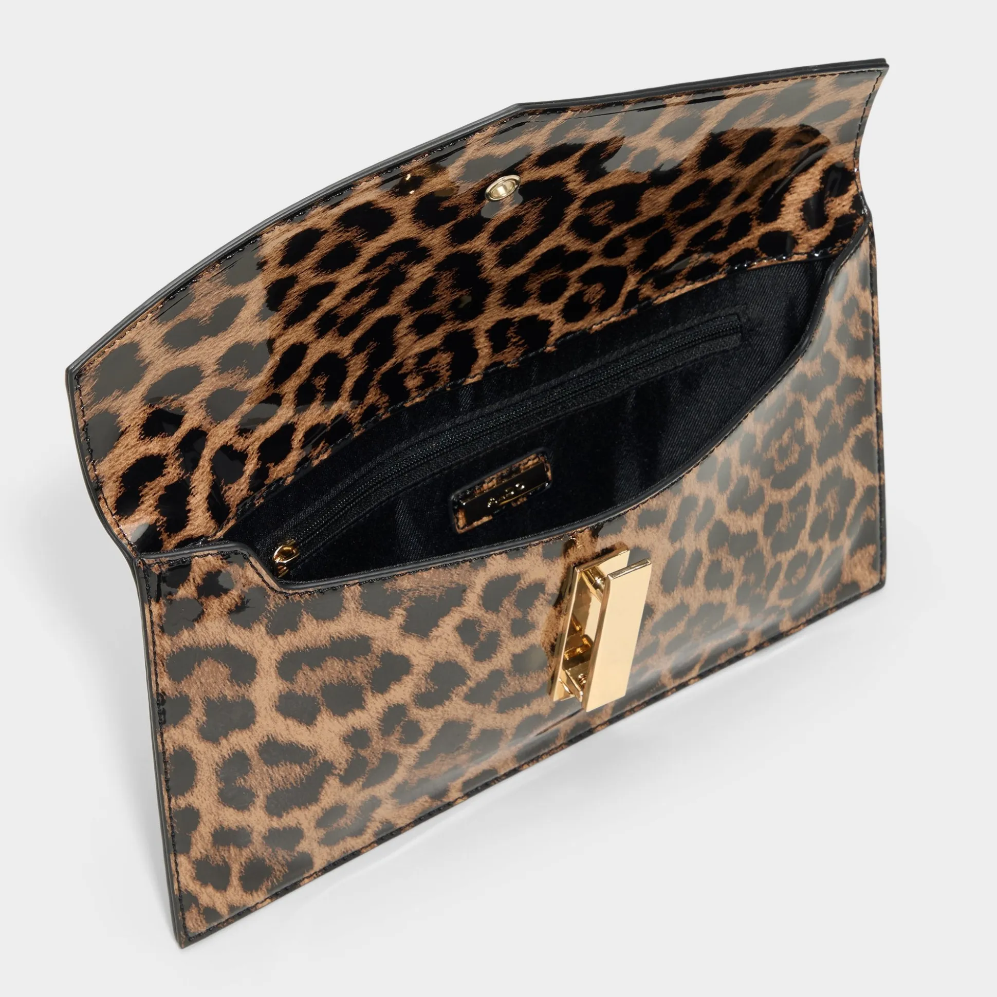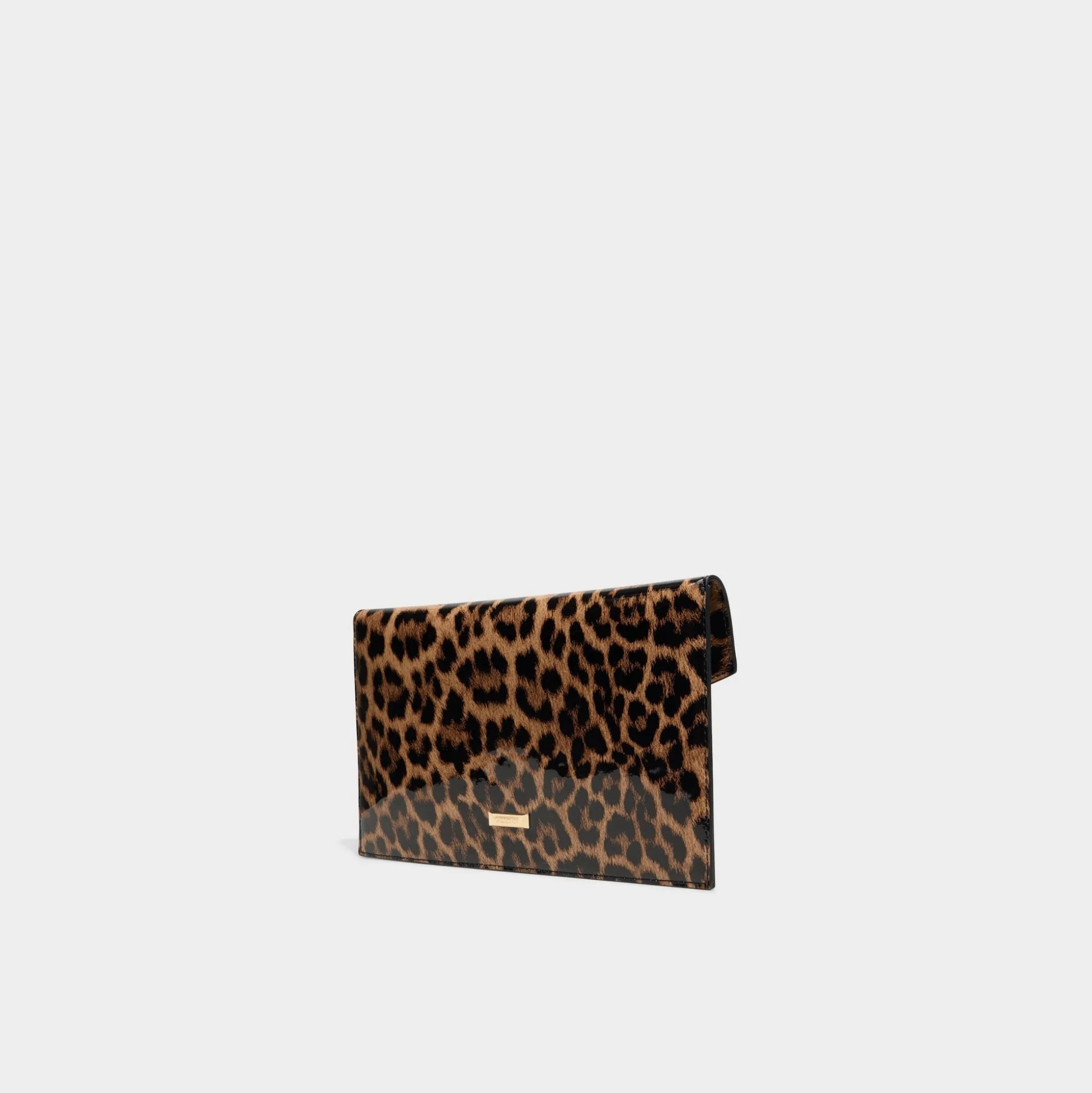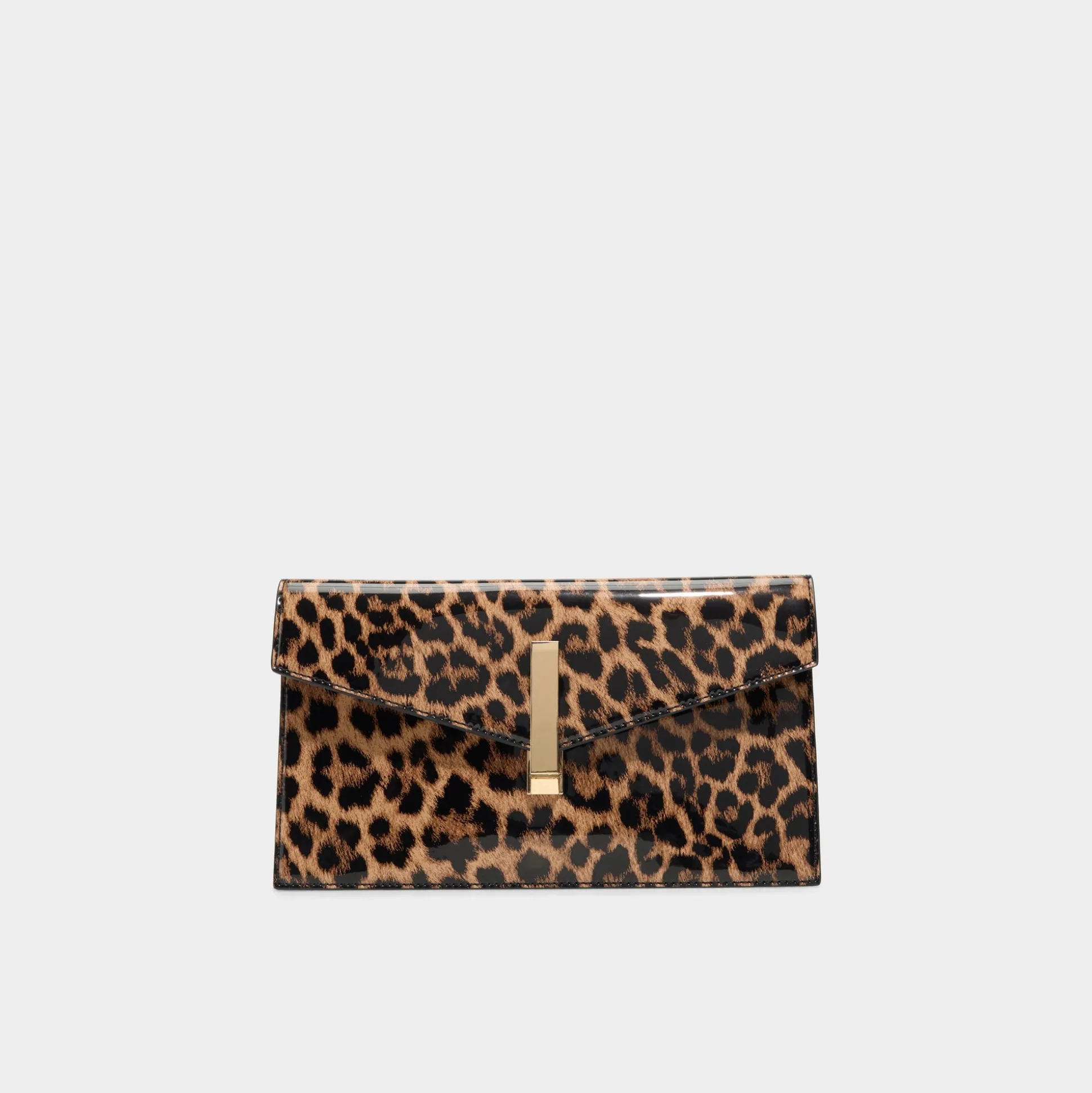 Leopard-patent envelope clutch shimmers under city lights, its sleek gold bar lock keeping essentials secure while elevating the look to instant after-dark confidence. Carry it with a satin slip dress for rooftop toasts, or tuck it under your arm with distressed denim for late-night gigs.