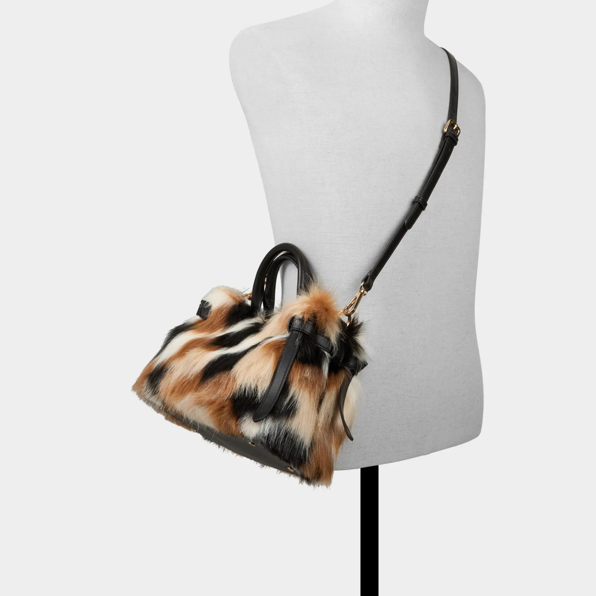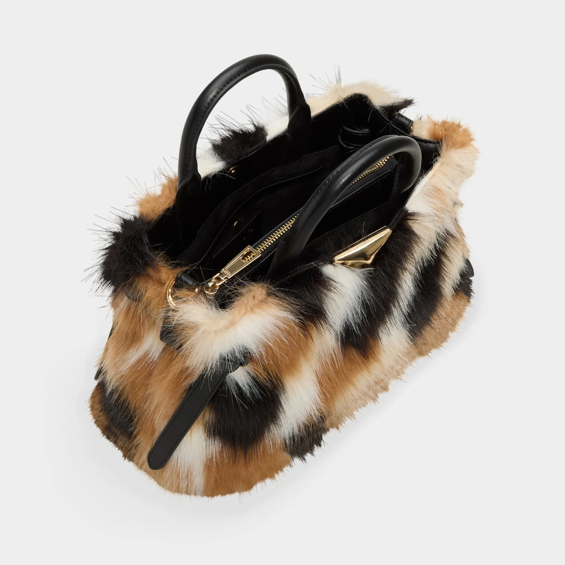 Patchwork faux fur wraps this top-handle bag in apres-ski charm, a super-soft texture catching the light as hidden drawstrings cinch the interior and gold hardware peeks through cozy layers. Carry it from coffee runs to evening plans, tucking a dress or cozy layer into the look for a warm finish you can wear everywhere.