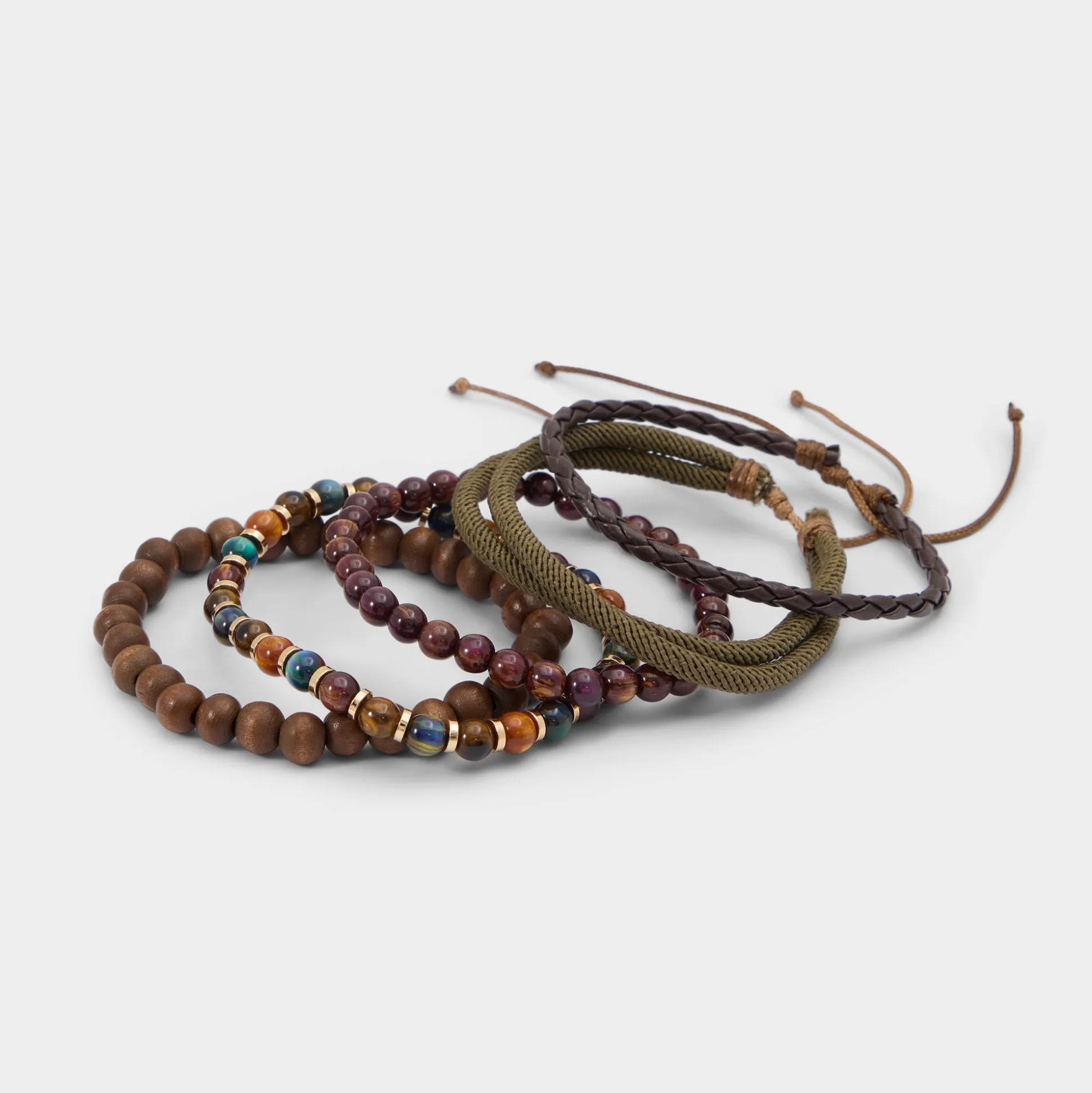 Braided cords hold wood and glass beads in warm browns and greens, creating a statement layer with adjustable knots for comfort. Stack them casually with sneakers and a tee, or dress up with a sundress for weekend sunshine.