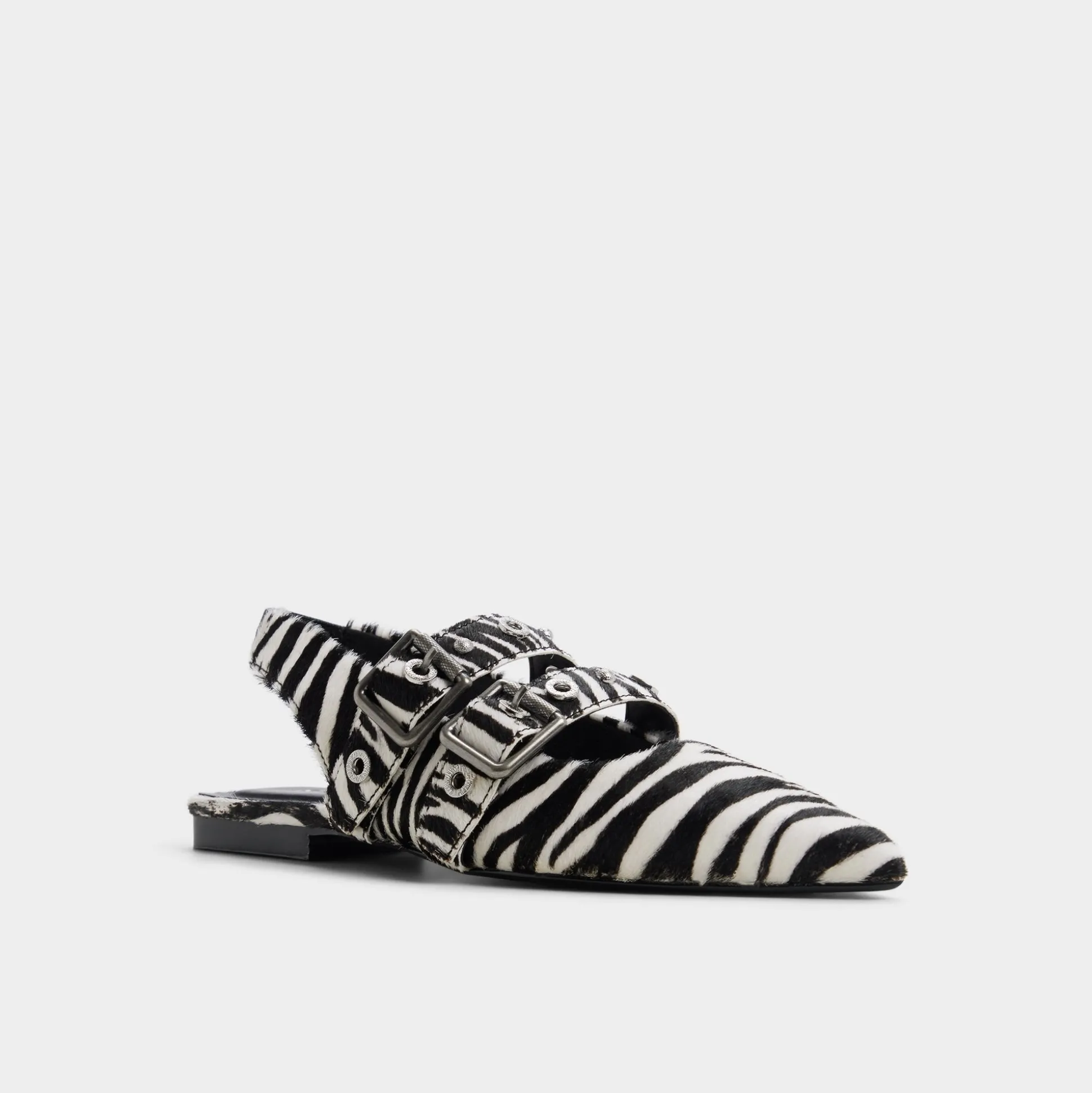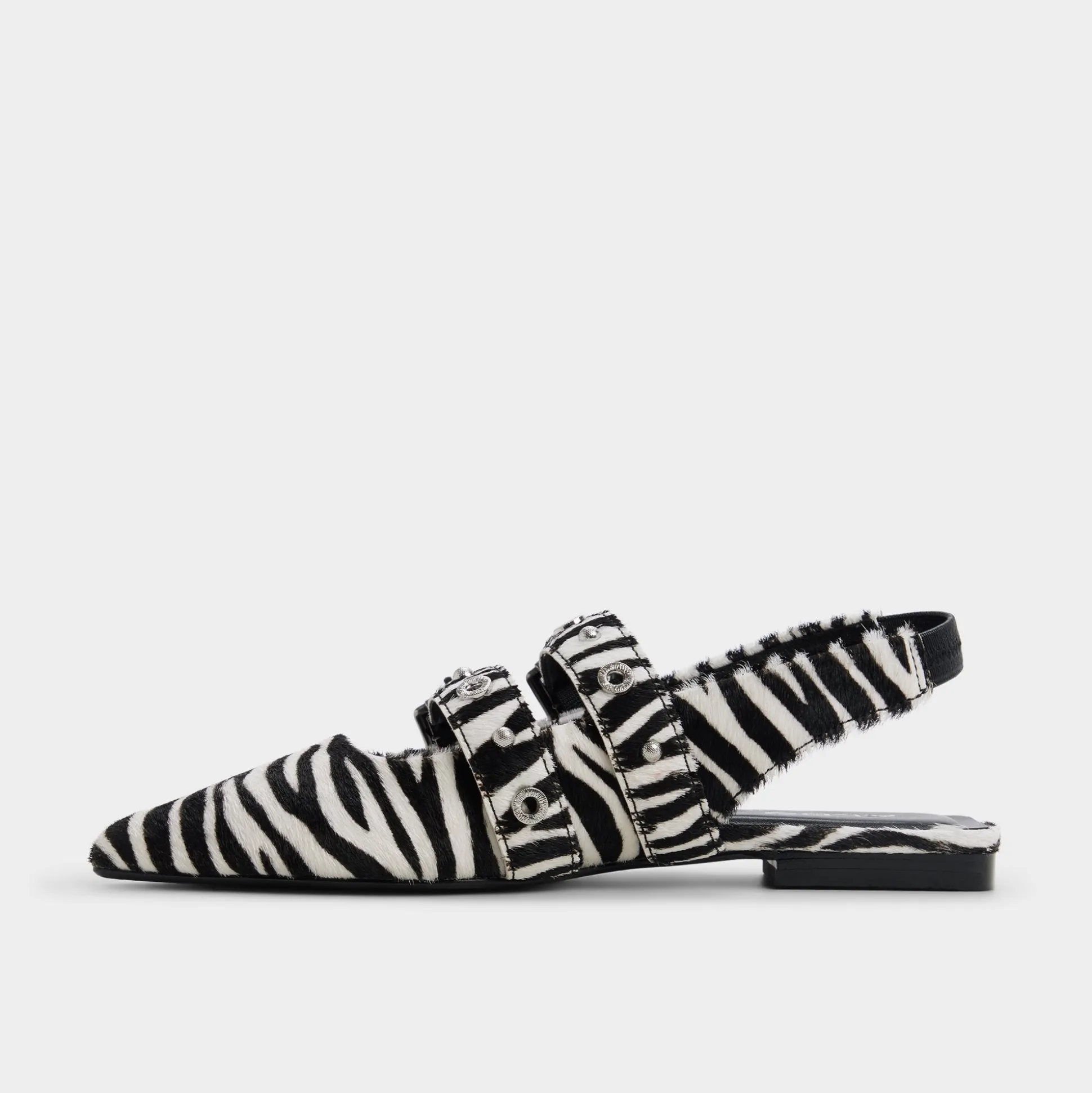 Wild zebra stripes in soft faux fur meet two polished buckles on this pointy slingback, turning the classic flat into a conversation starter that walks easy from sidewalk huddles to after-dark detours. Pair with cropped black denim for midday brainstorms, or ground a satin slip dress when gallery openings blur into midnight ramen.