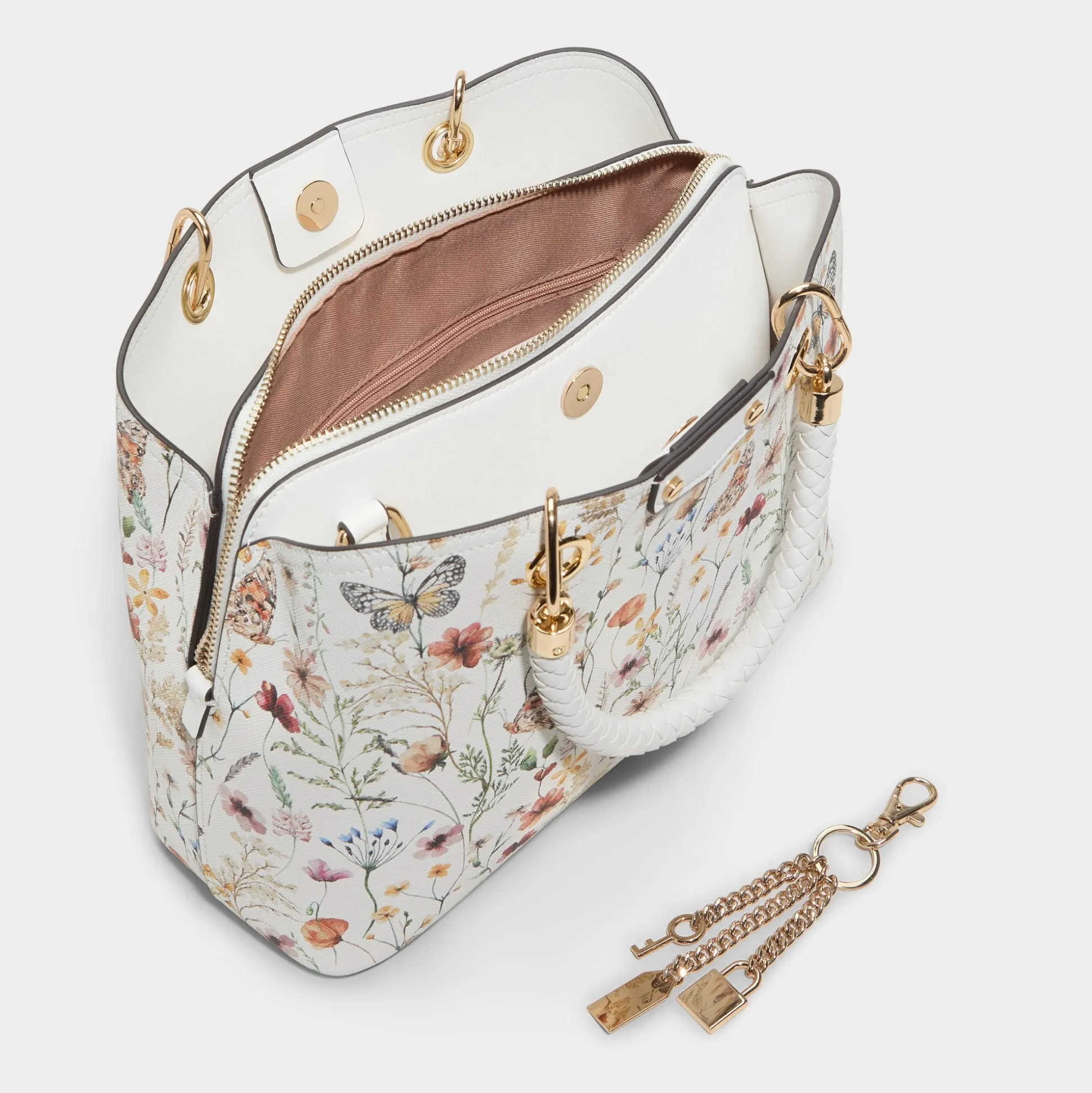 Wildflower illustrations crown this structured tote, where woven handles meet gleaming gold key-fob accents for a visually dominant accent that shifts everyday practicality into a statement piece you carry with ease. Carry it with a pastel suit for office coffee runs, or sling it over a sundress for weekend market strolls, letting the floral print finish the look.
