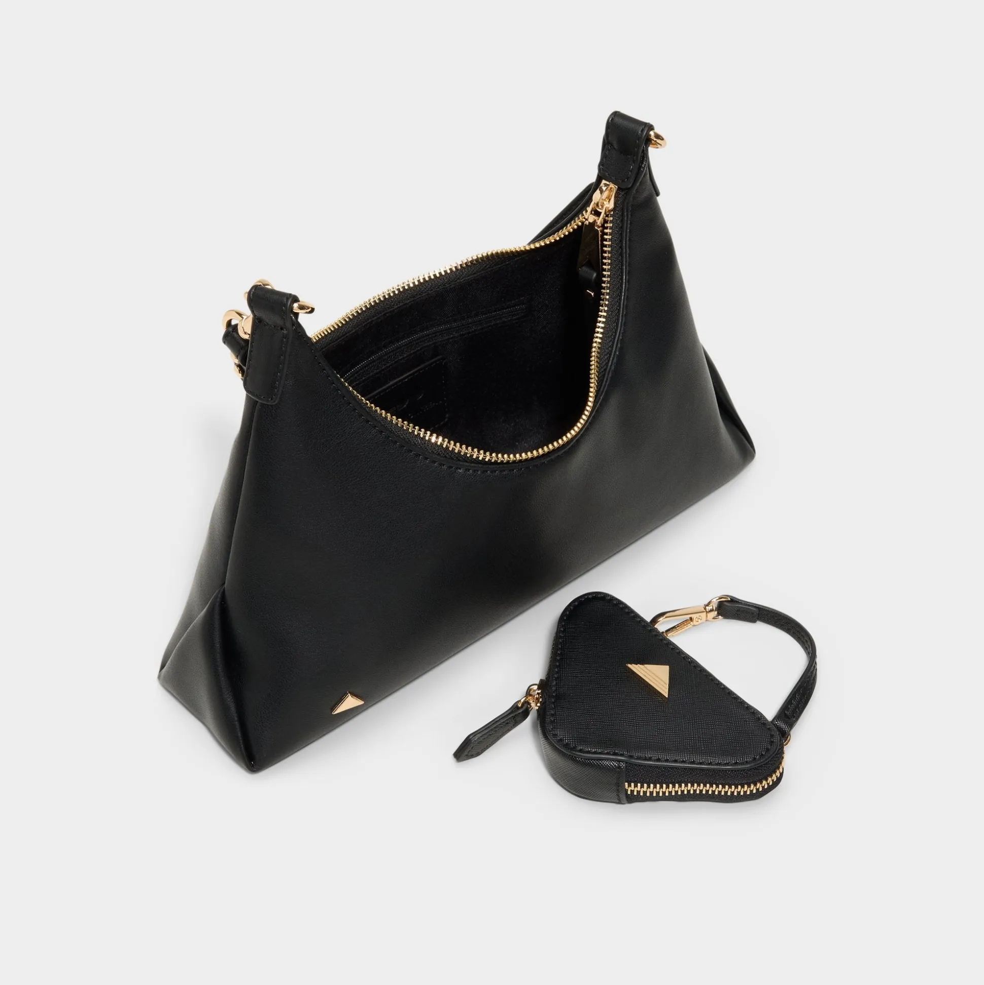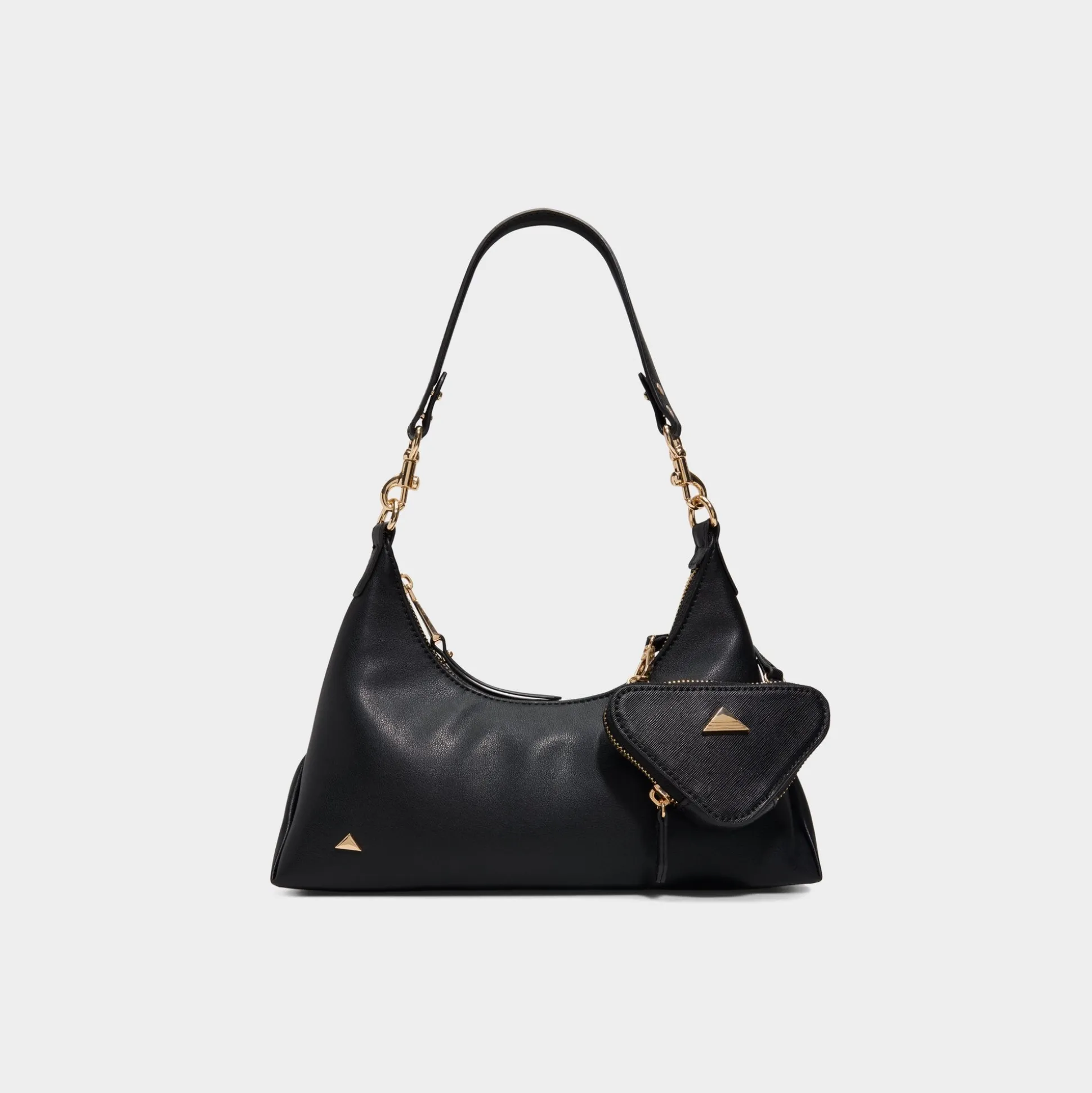 A triangle mini pouch clips off in a snap, adding playful utility to this sleek leather shoulder bag, with sculpted gold-tone chains tracing the strap and zipper for polished moves. Carry it with a blazer and wide-leg trousers for office catch-ups, or sling it over a slip dress on late-night plans to complete the look.
