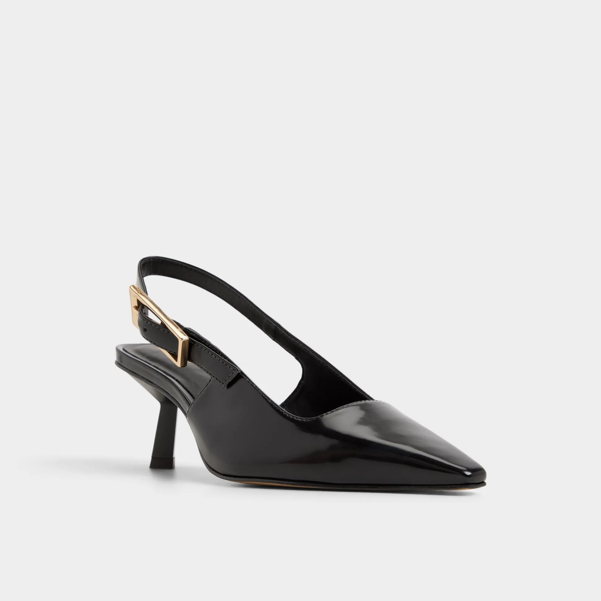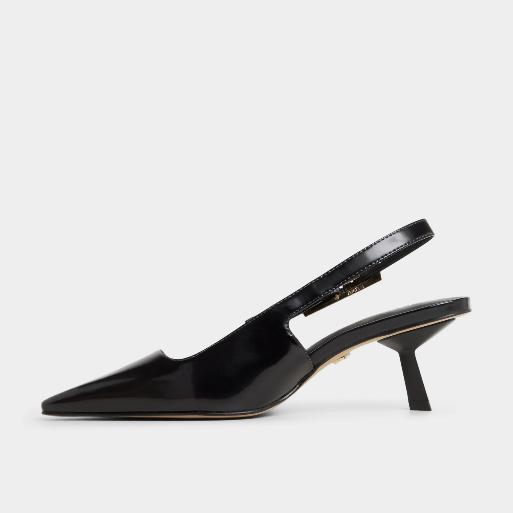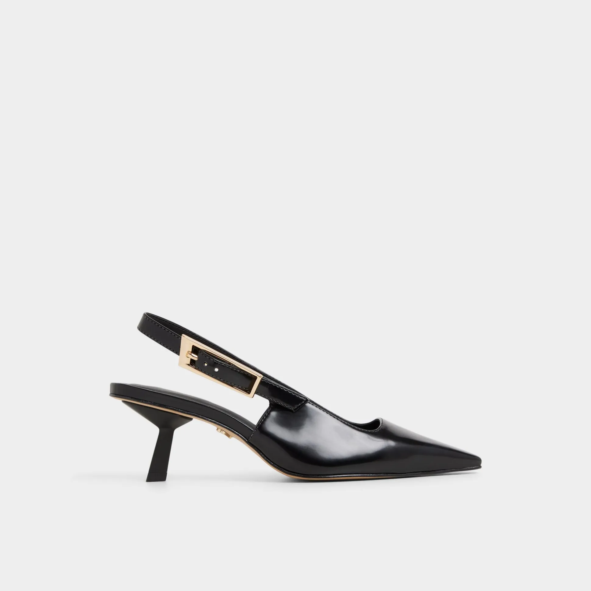 Midnight gloss leather sharpens the slingback silhouette, a gleaming gold buckle punctuating the strap as a low-set kitten heel keeps confidence effortless from desk to downtown through meetings, drinks, and quick city hops. Pair with tailored trousers for pitch meetings, or trade satin skirts for jazz-bar evenings when city lights glow.