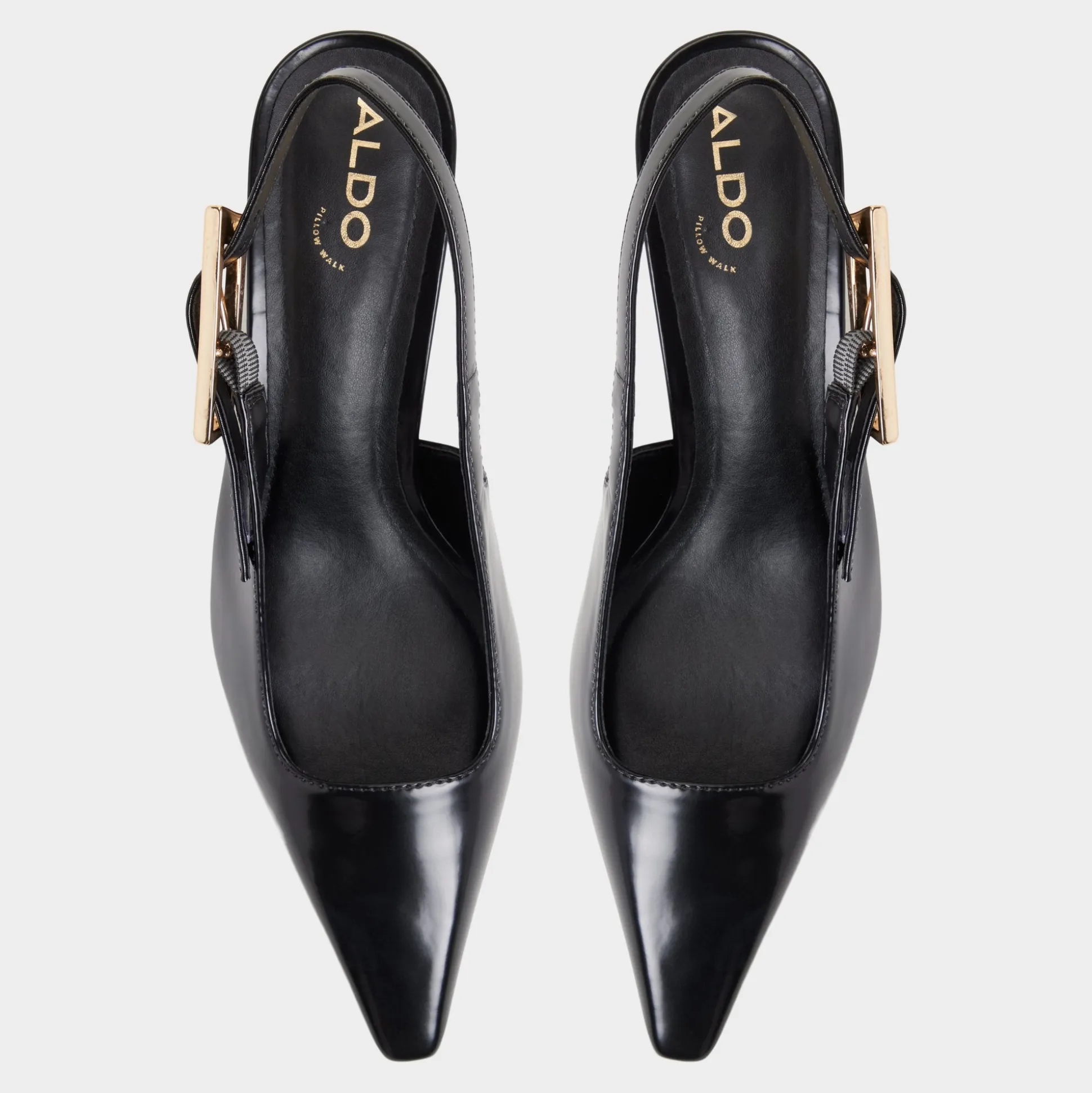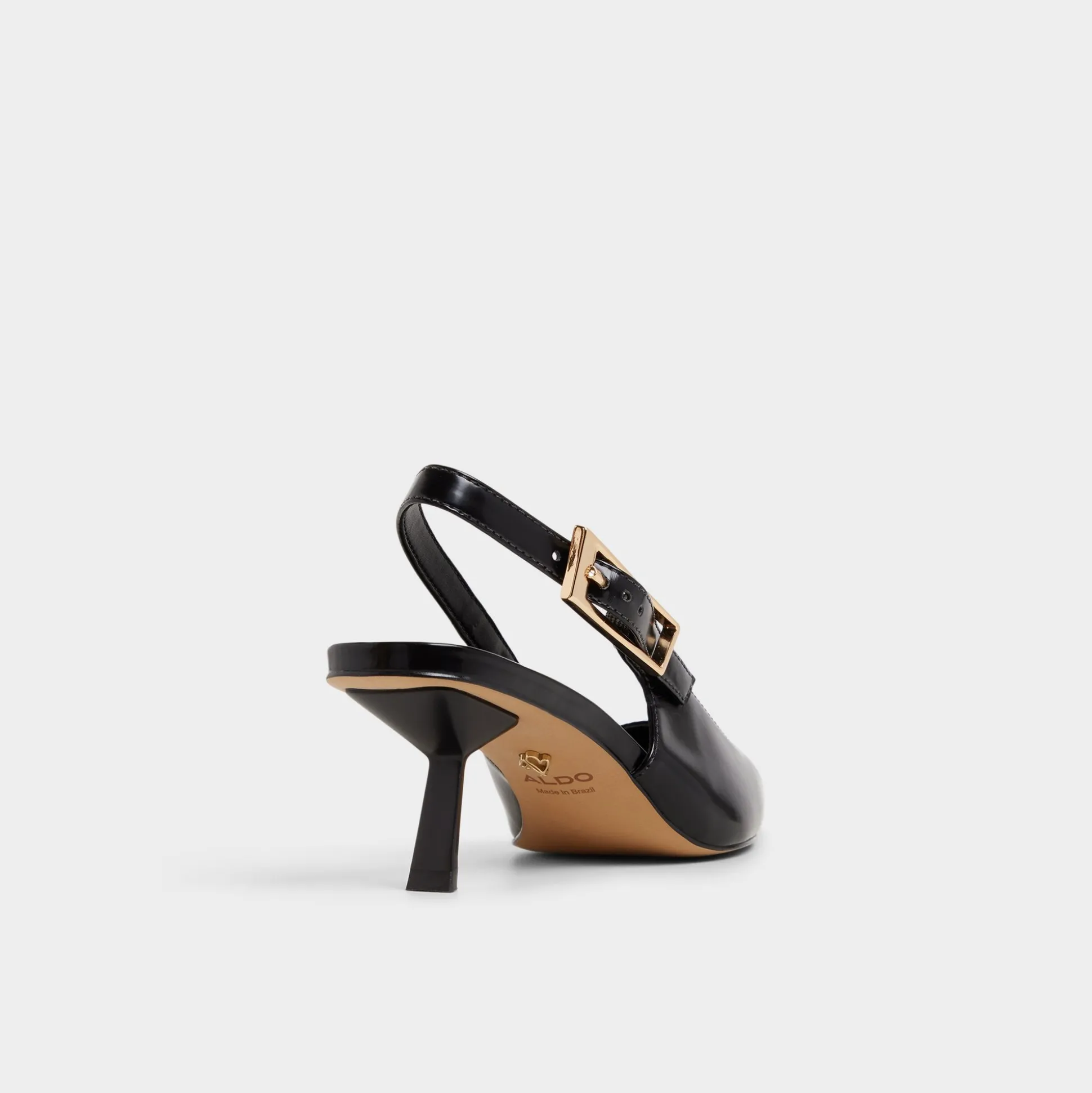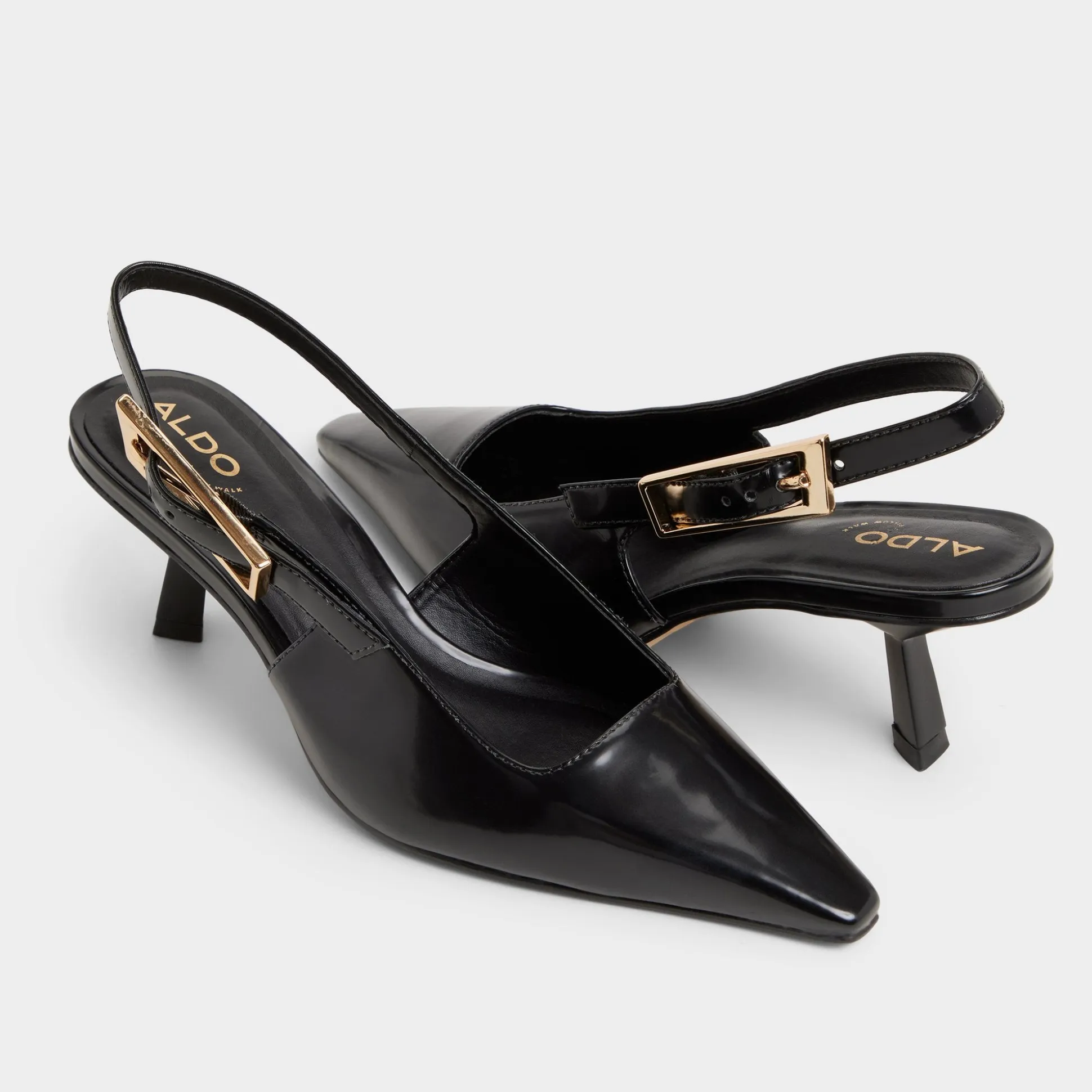 Midnight gloss leather sharpens the slingback silhouette, a gleaming gold buckle punctuating the strap as a low-set kitten heel keeps confidence effortless from desk to downtown through meetings, drinks, and quick city hops. Pair with tailored trousers for pitch meetings, or trade satin skirts for jazz-bar evenings when city lights glow.