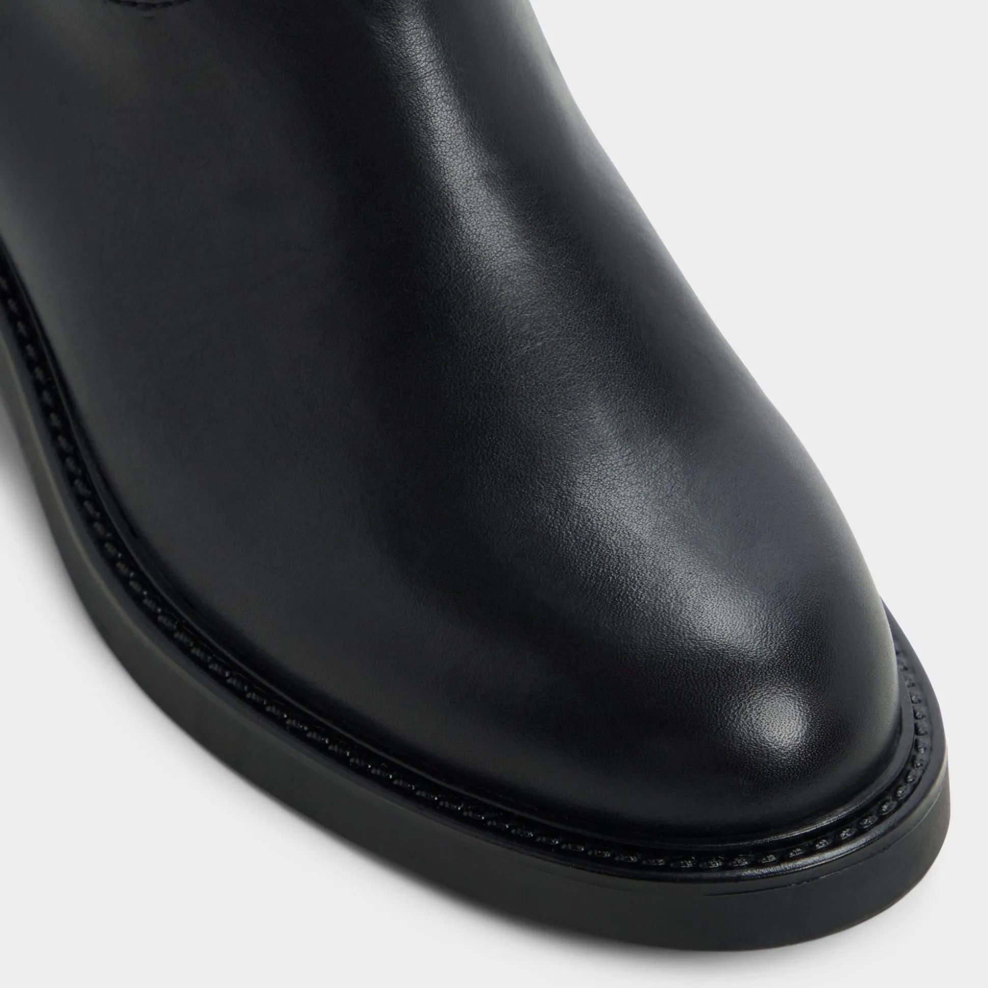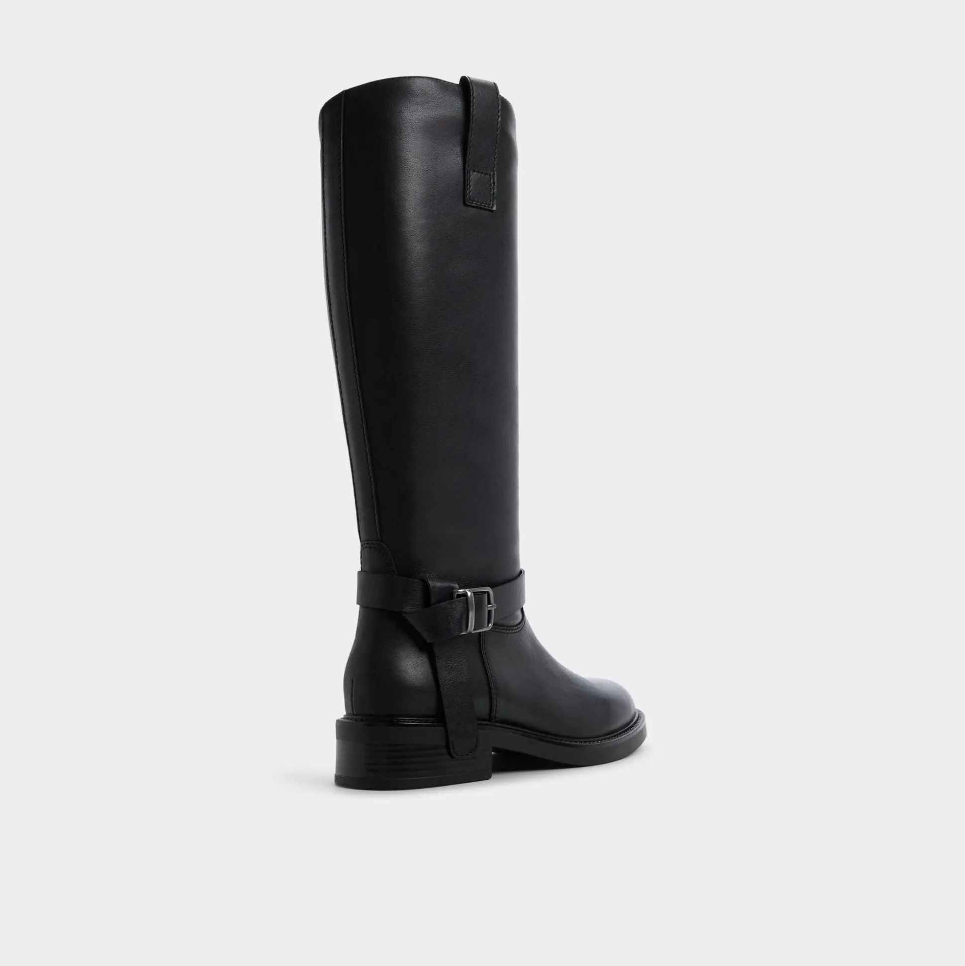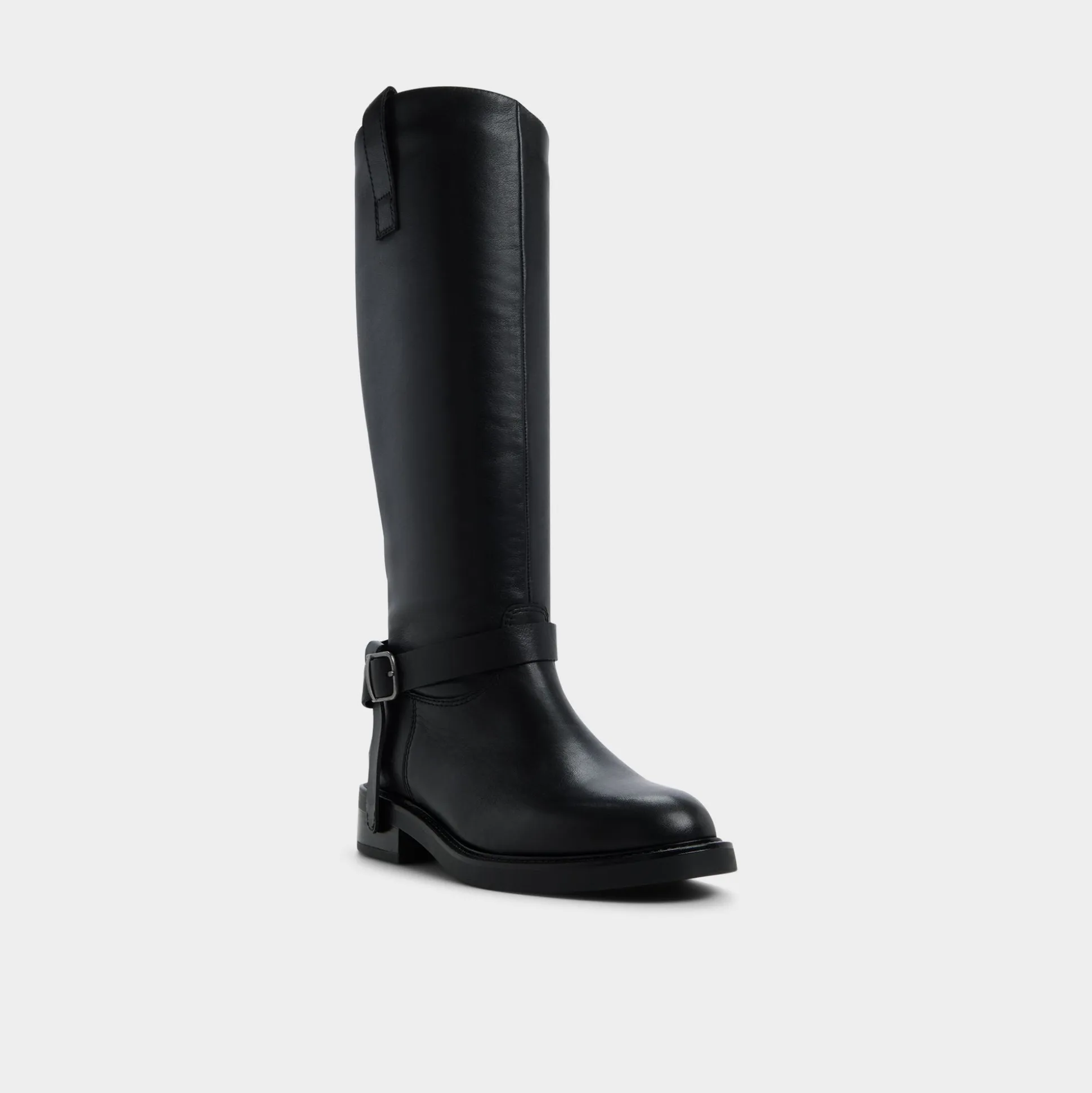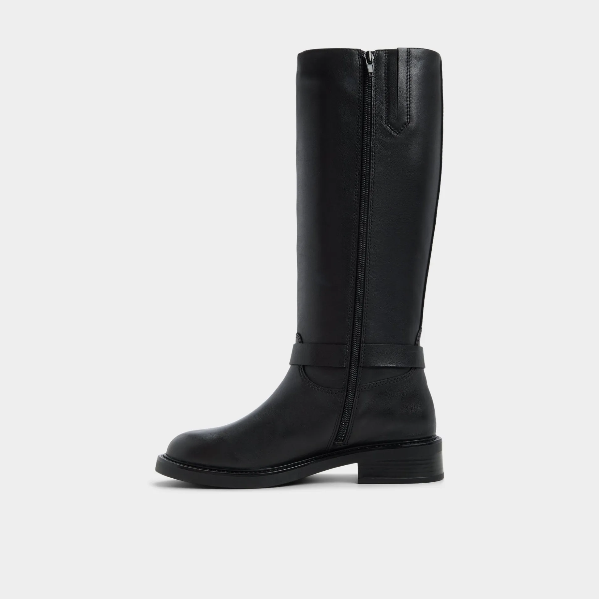 Supple black leather rises knee-high in a clean riding silhouette, with a harness-style buckle strap and a low block heel that lend subtle edge and all-day steadiness for city strolls, commutes, and evenings out. Pair with slim jeans for coffee-to-commute, or slip into a knit midi as museum afternoons melt into rooftop cocktails.