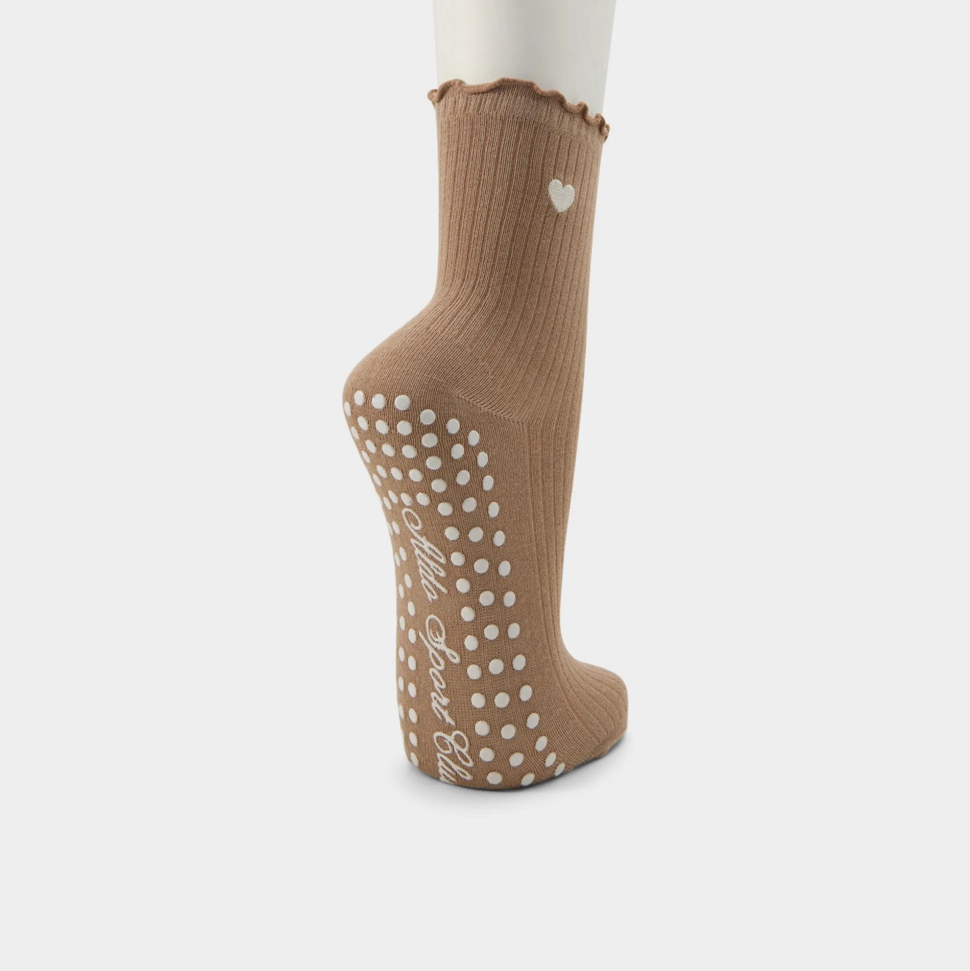 Ruffled lettuce cuffs frame playful embroidery of hearts and bows on a sport-ready silhouette, while silicone dot grips underfoot keep every plié steady. Layer them with a cropped hoodie for gym-to-street, or top with a denim jacket for weekend errands.
