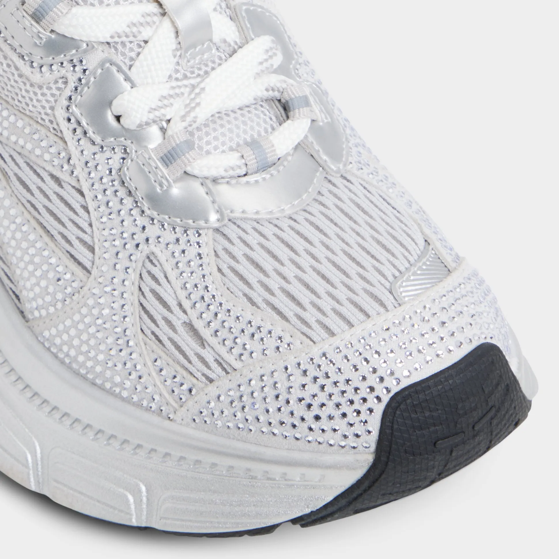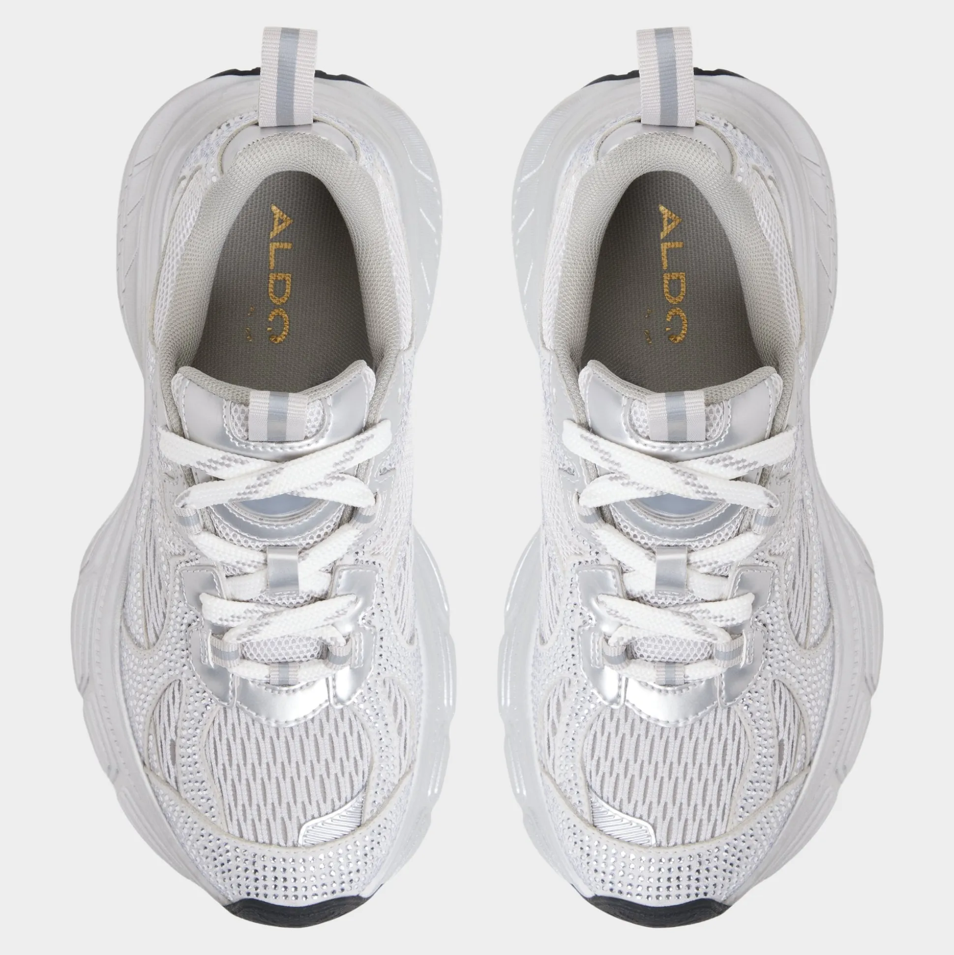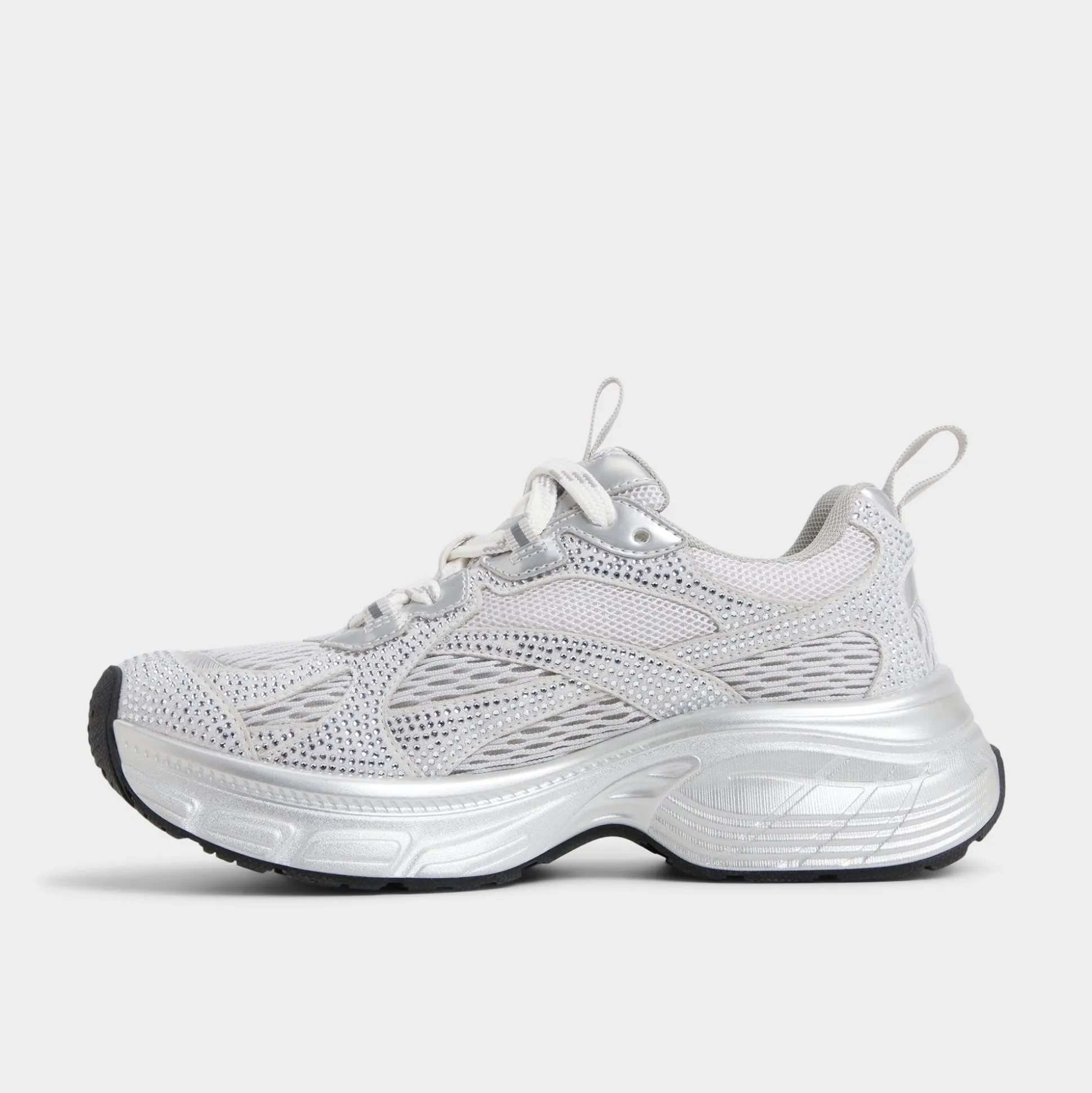 Shimmering silver mesh meets smooth overlays atop a lofty jogger sole, delivering cool, cloud-soft comfort that keeps every step light and awake as the world hums with possibilities. Pair with bike shorts for caffeine jaunts, or ground under a slip dress as festivals call carefree moves.
