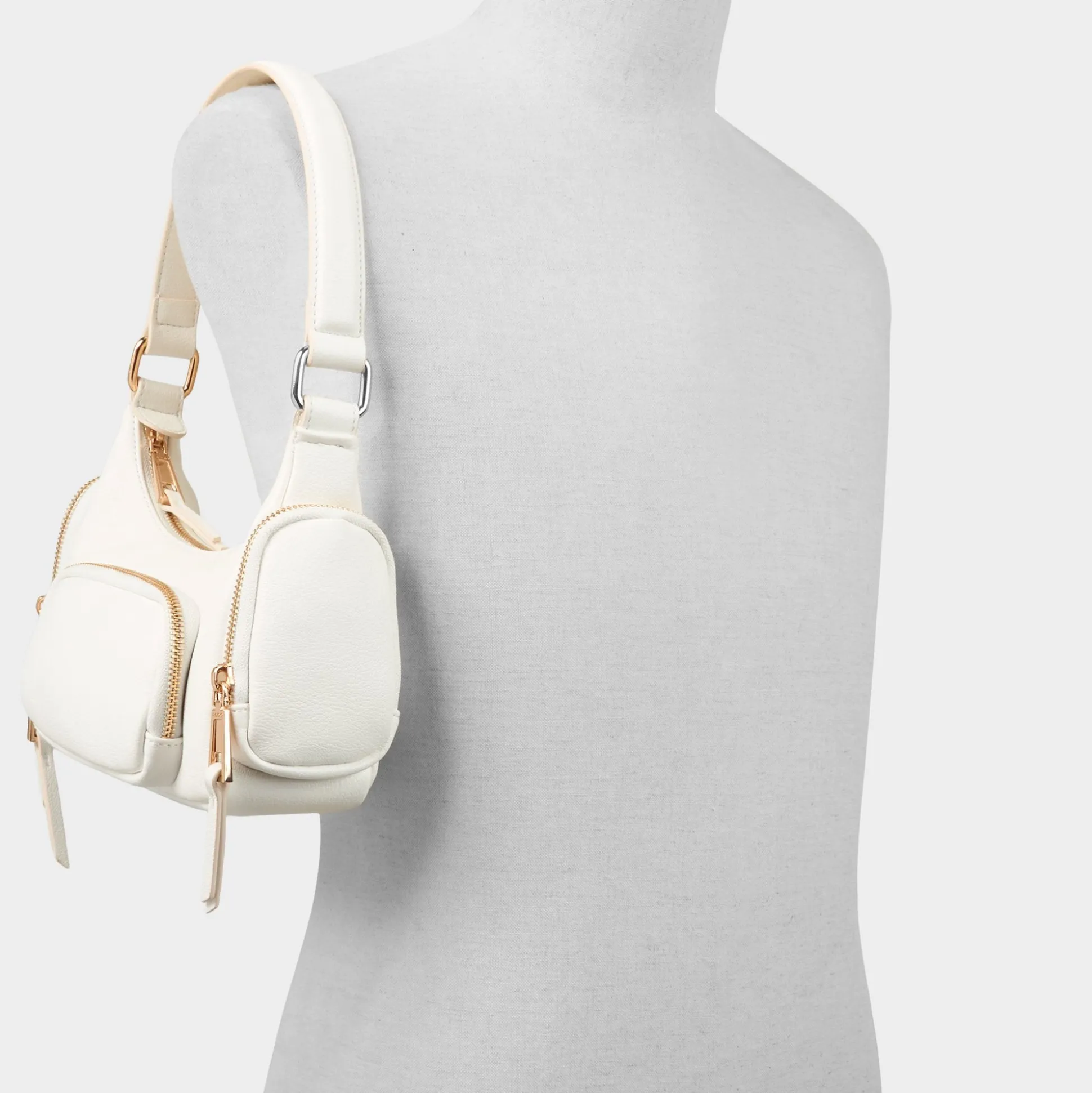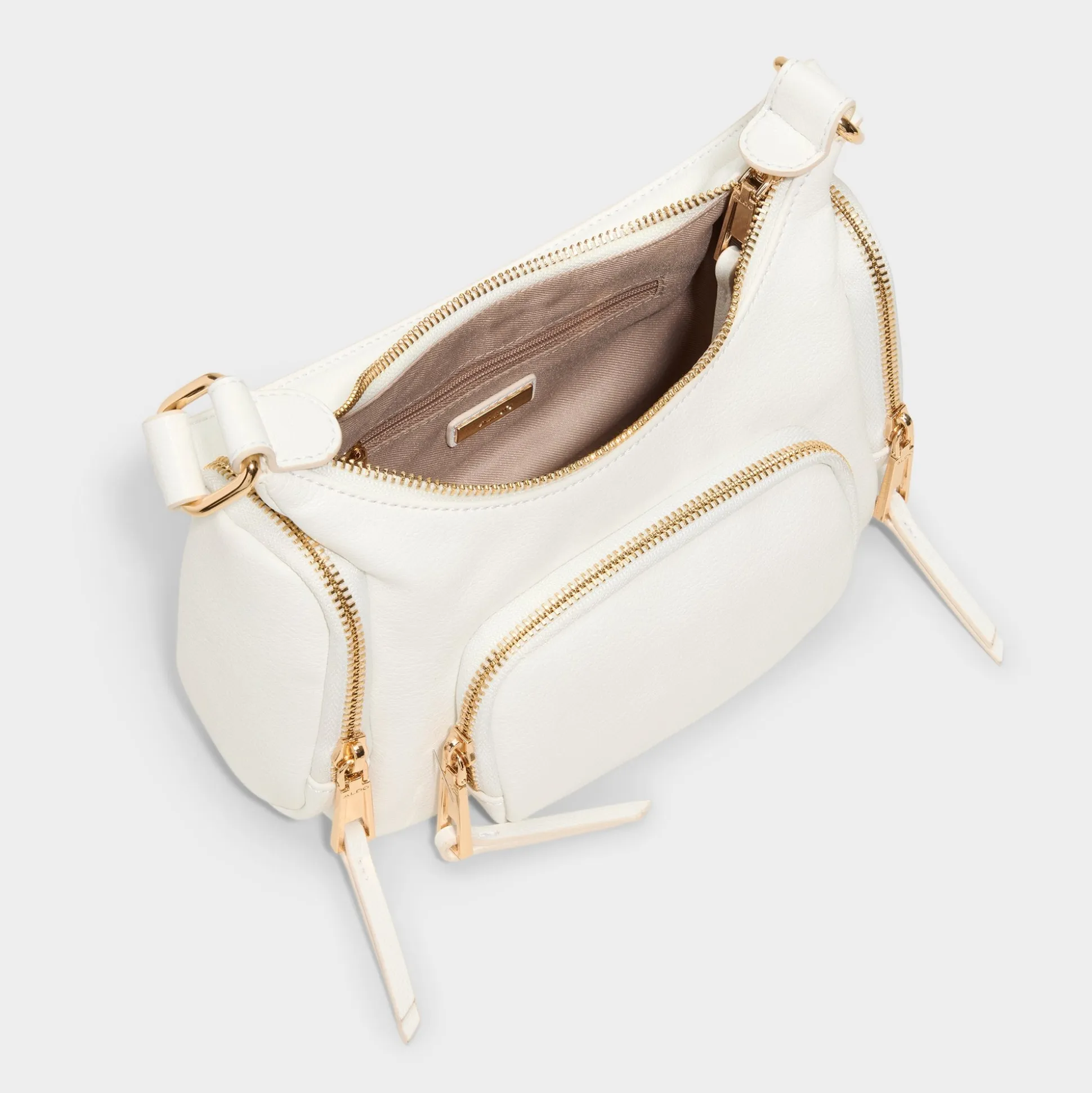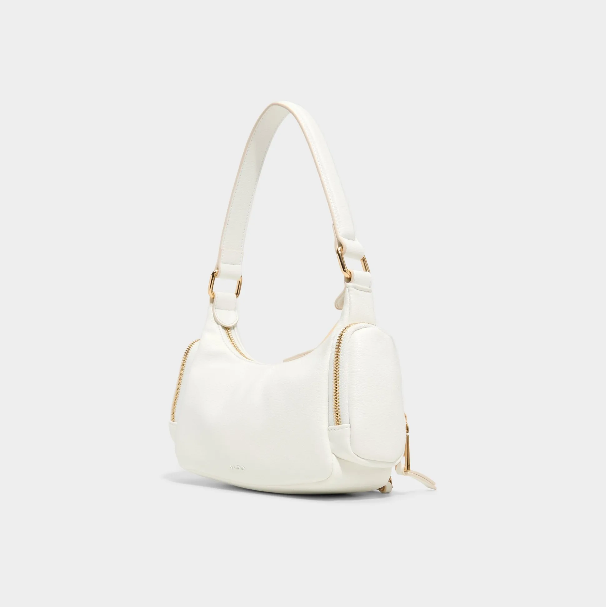 Soft white leather meets liquid-gold hardware in a curved hobo silhouette, with three exposed zippers and a front pouch plus twin side pockets that help sort cards, earbuds, and small essentials without digging. Carry it with a linen blazer for Monday meetings, or sling it with biker shorts for weekend coffee runs.