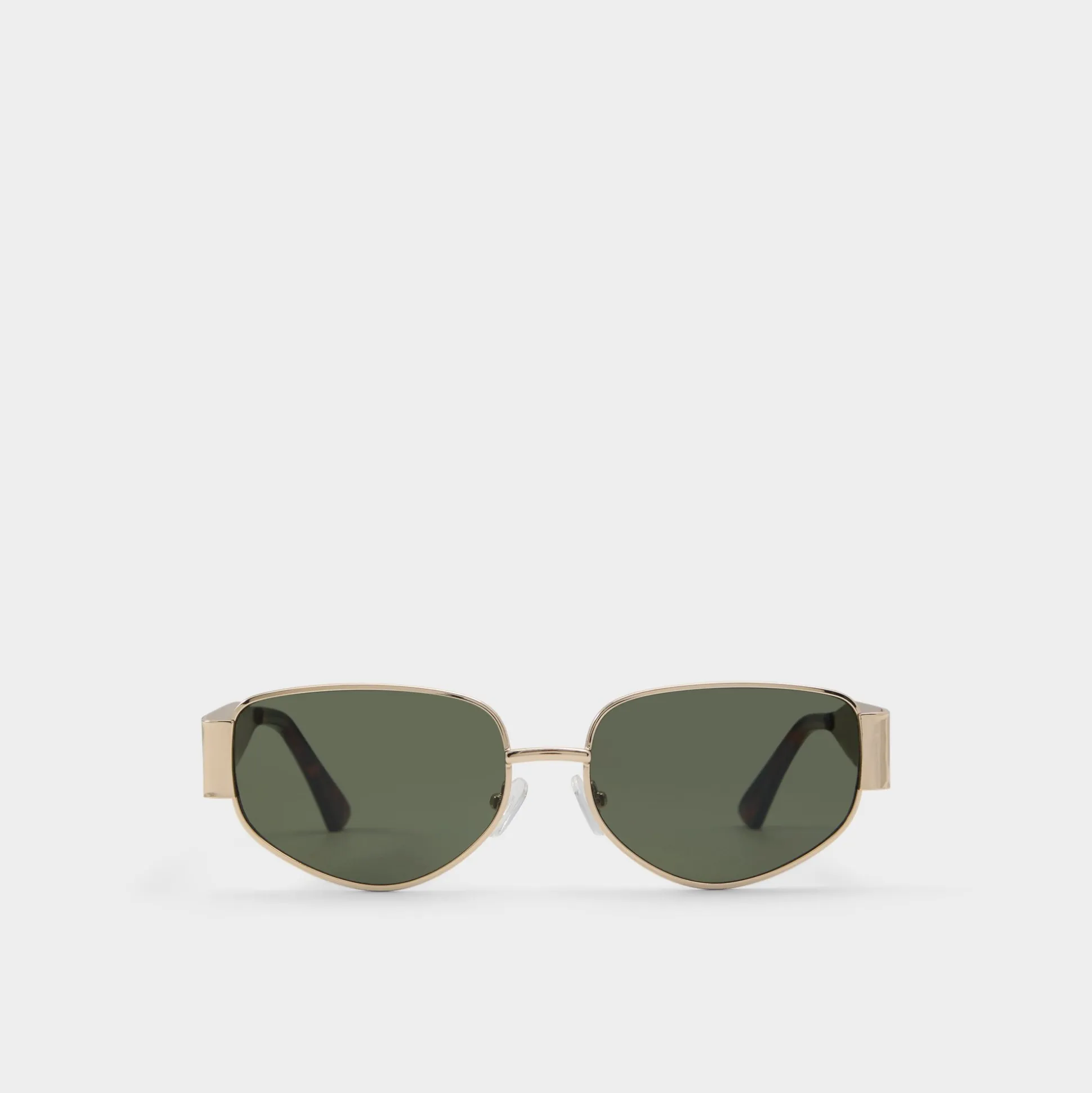 Gold-tone metal frame shapes these glasses into a square silhouette featuring a double bridge and rich olive lenses that catch light beautifully. Wear them with a slip dress for date-night glow or pair with denim and blazer for effortless city errands.