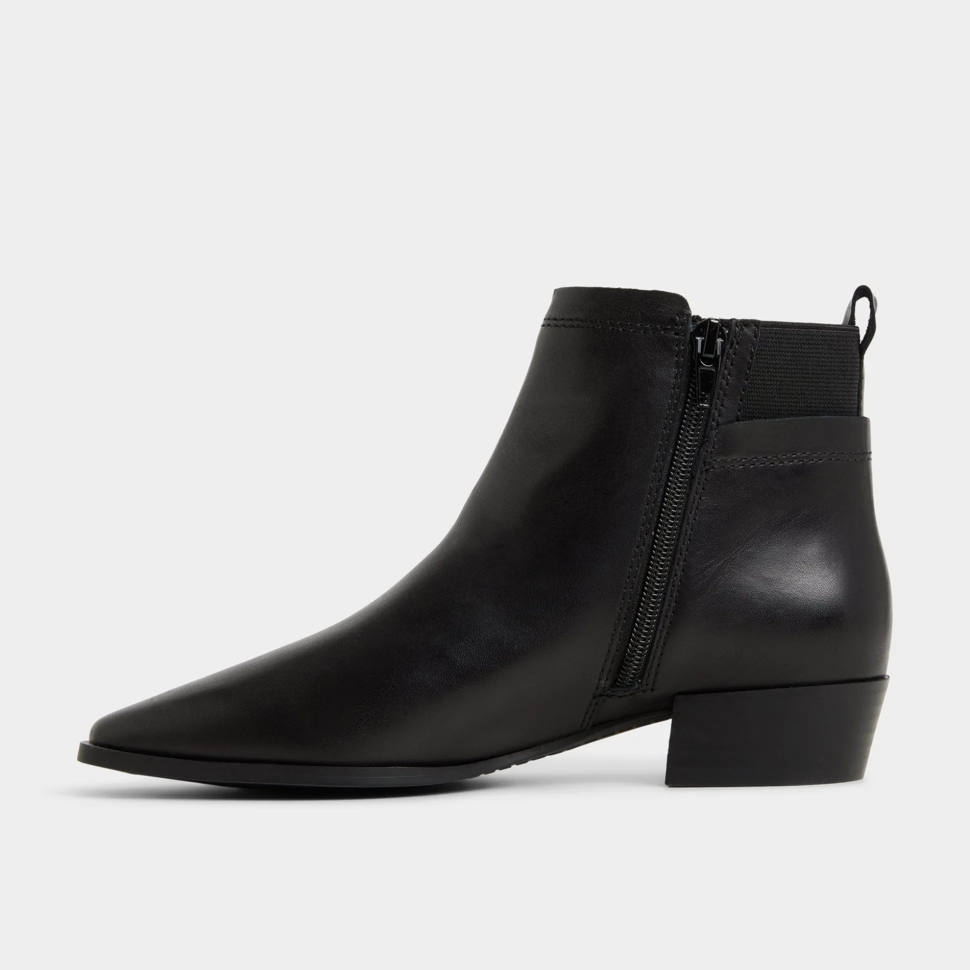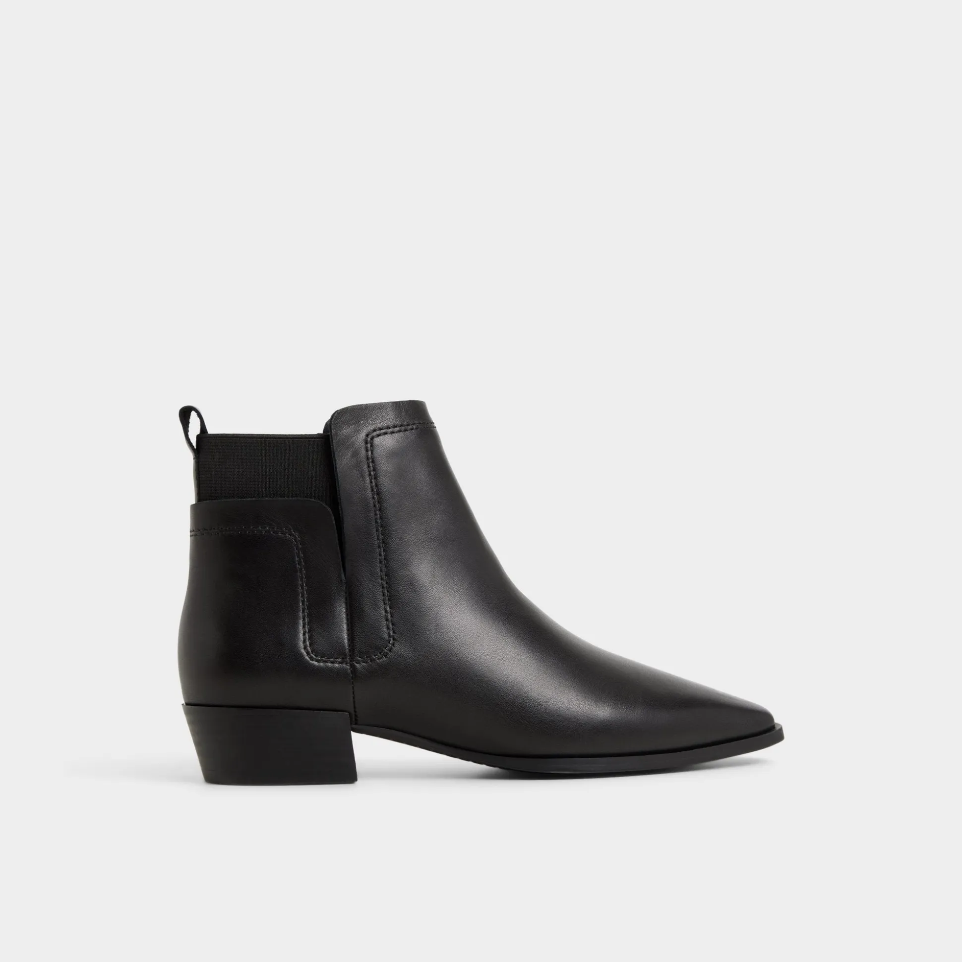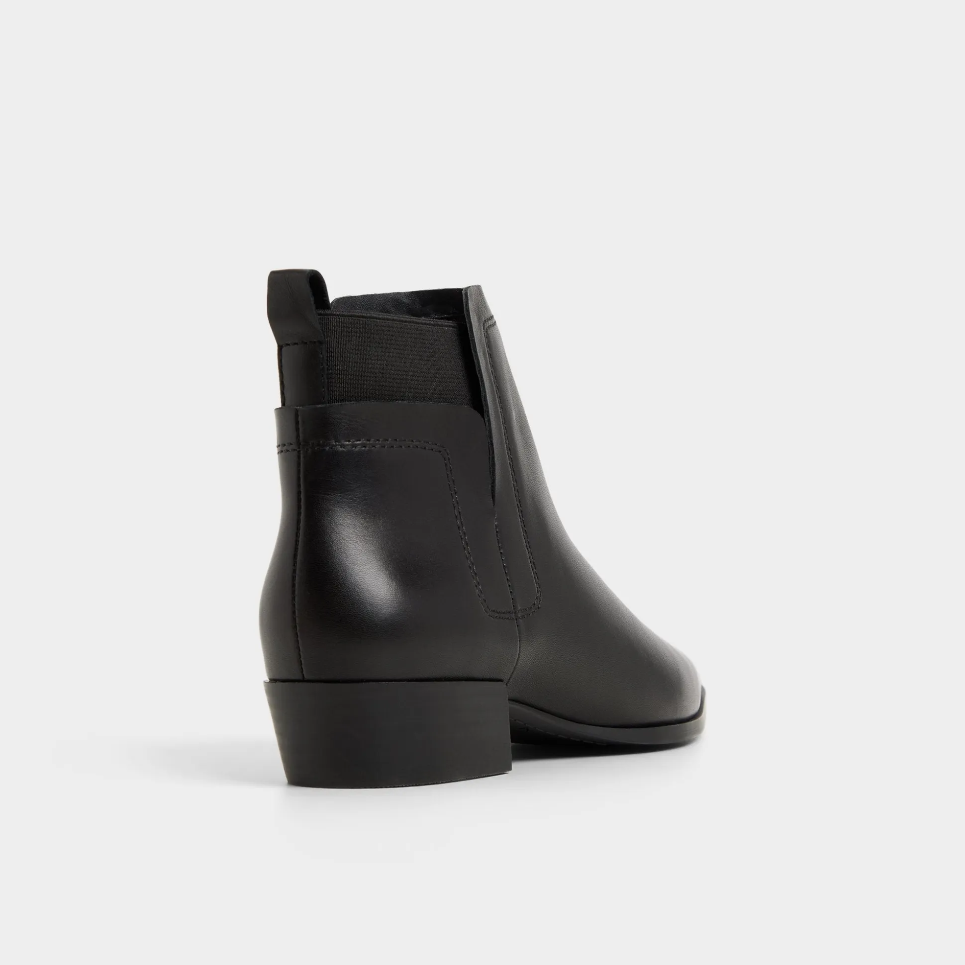Clean-cut leather wraps a Chelsea-inspired ankle boot, with a sharp pointy toe meeting a slim low block heel for quiet height and effortless stride that elevates every step from morning meetings to post-work plans. Pair with cropped trousers for presentation mornings, or swap in with a satin slip skirt when late-night gigs call.