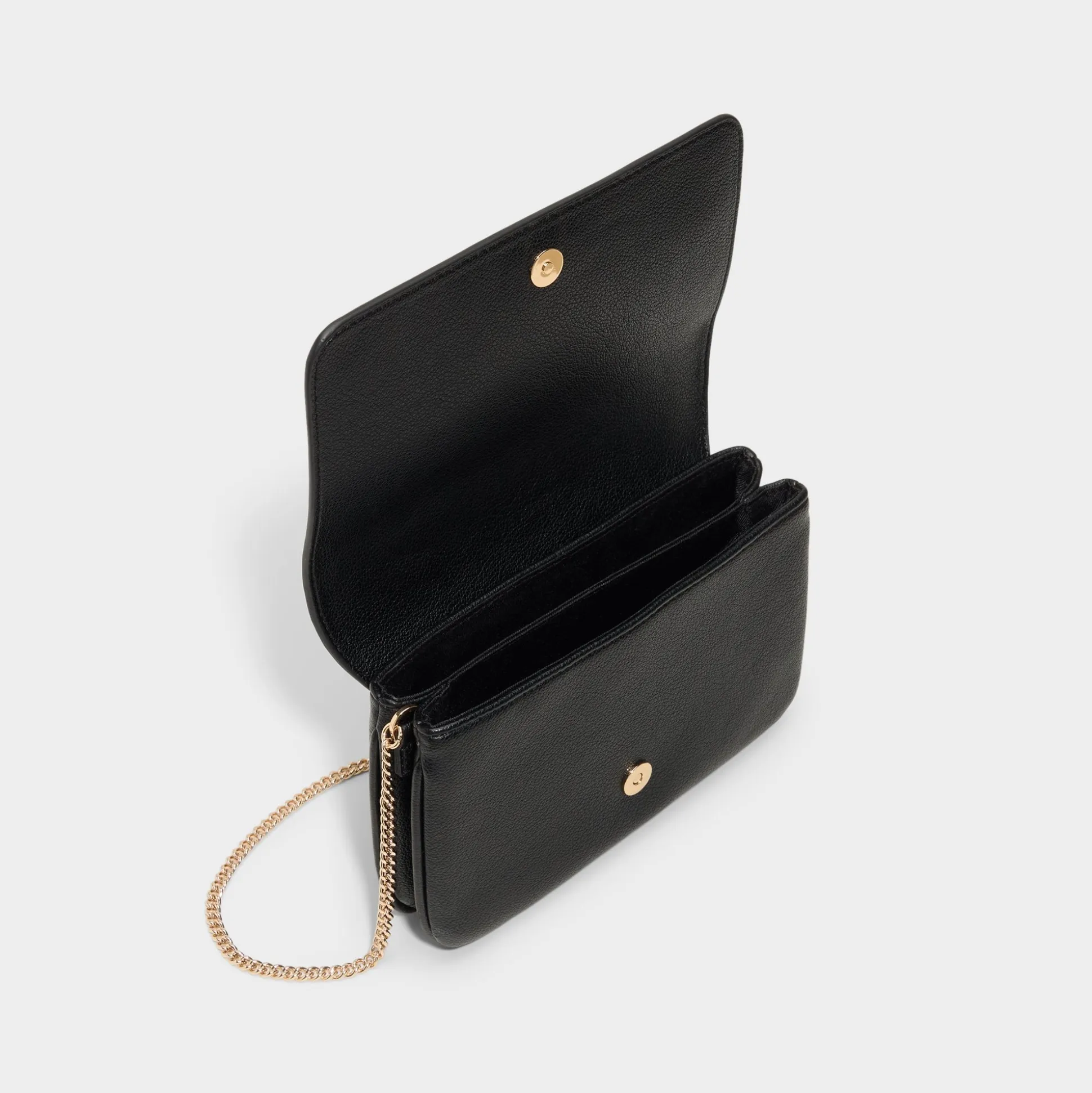 Micro-grain Saffiano texture meets a gleaming chain strap in a slim crossbody, while a structured flap and gold-tone hardware whisper quiet confidence and keep cards and phone neatly secured for everyday polish. Sling it for rooftop drinks or tuck it beneath a blazer with high-waist trousers for Monday meetings, finishing the look with effortless polish.