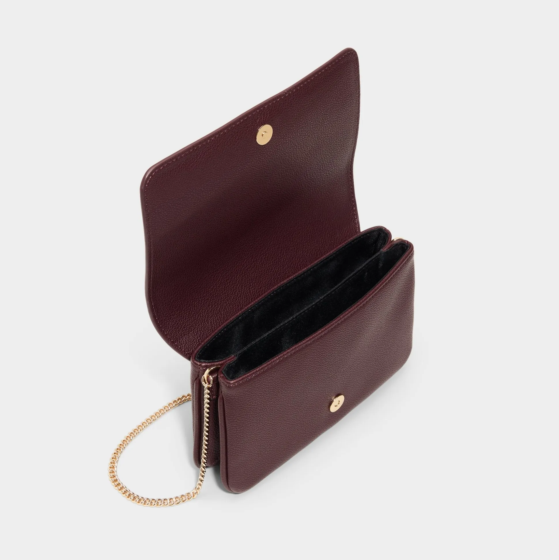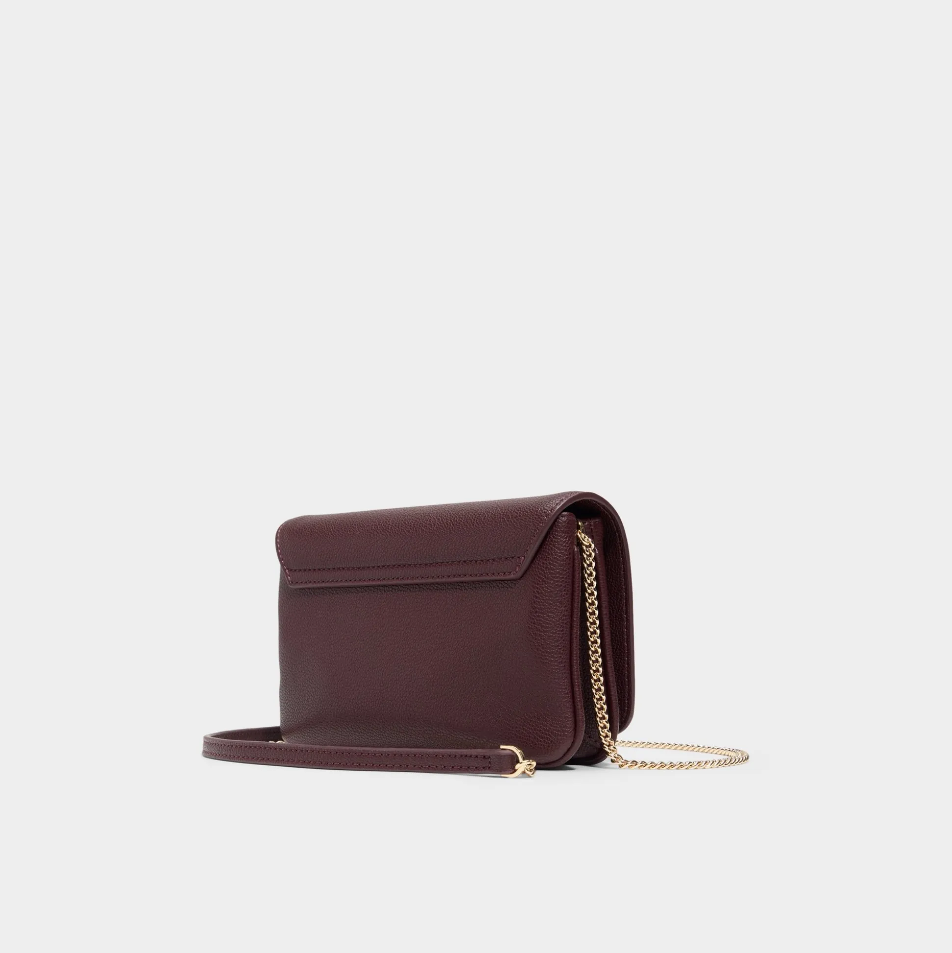 Deep burgundy pebble leather outlines clean lines, with a gold chain strap draping the flap silhouette like jewelry, closing with a hidden magnet to secure cards and gloss. Carry it with a satin midi for dinner reservations or sling it over boyfriend jeans on coffee runs to polish everything.