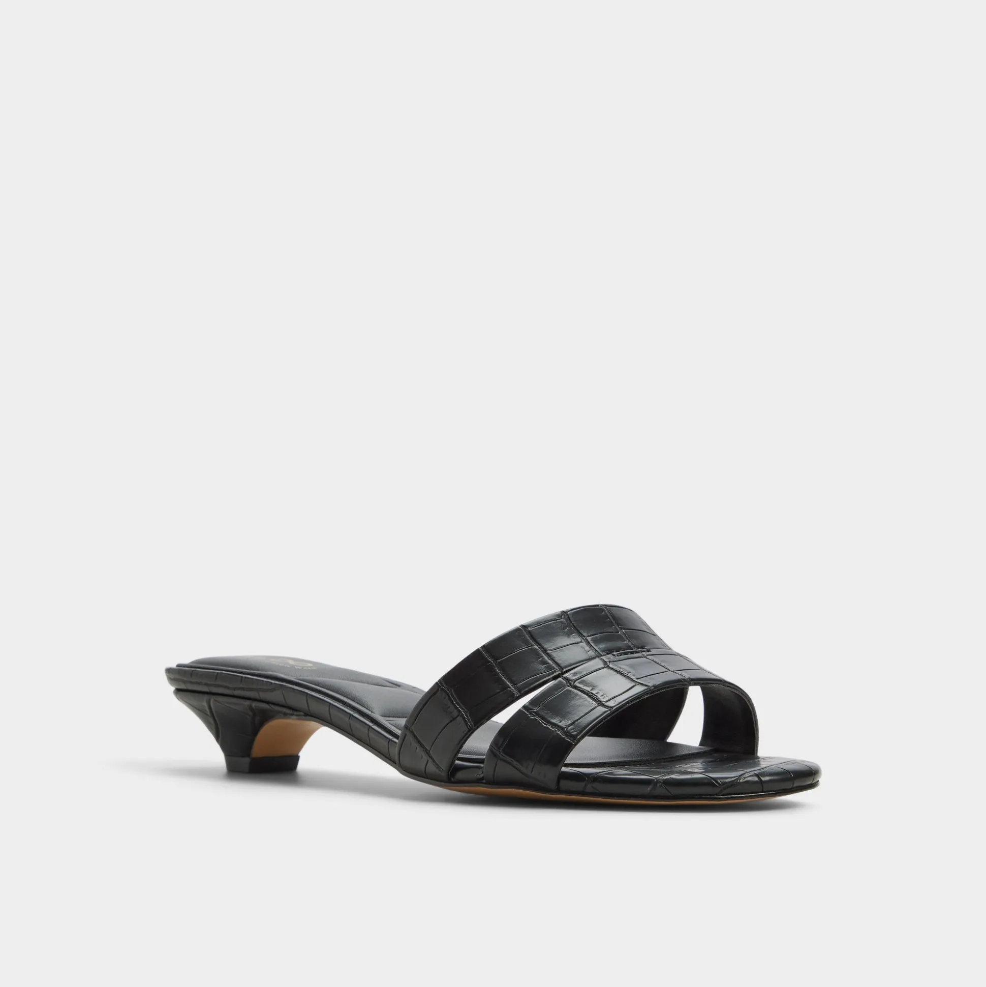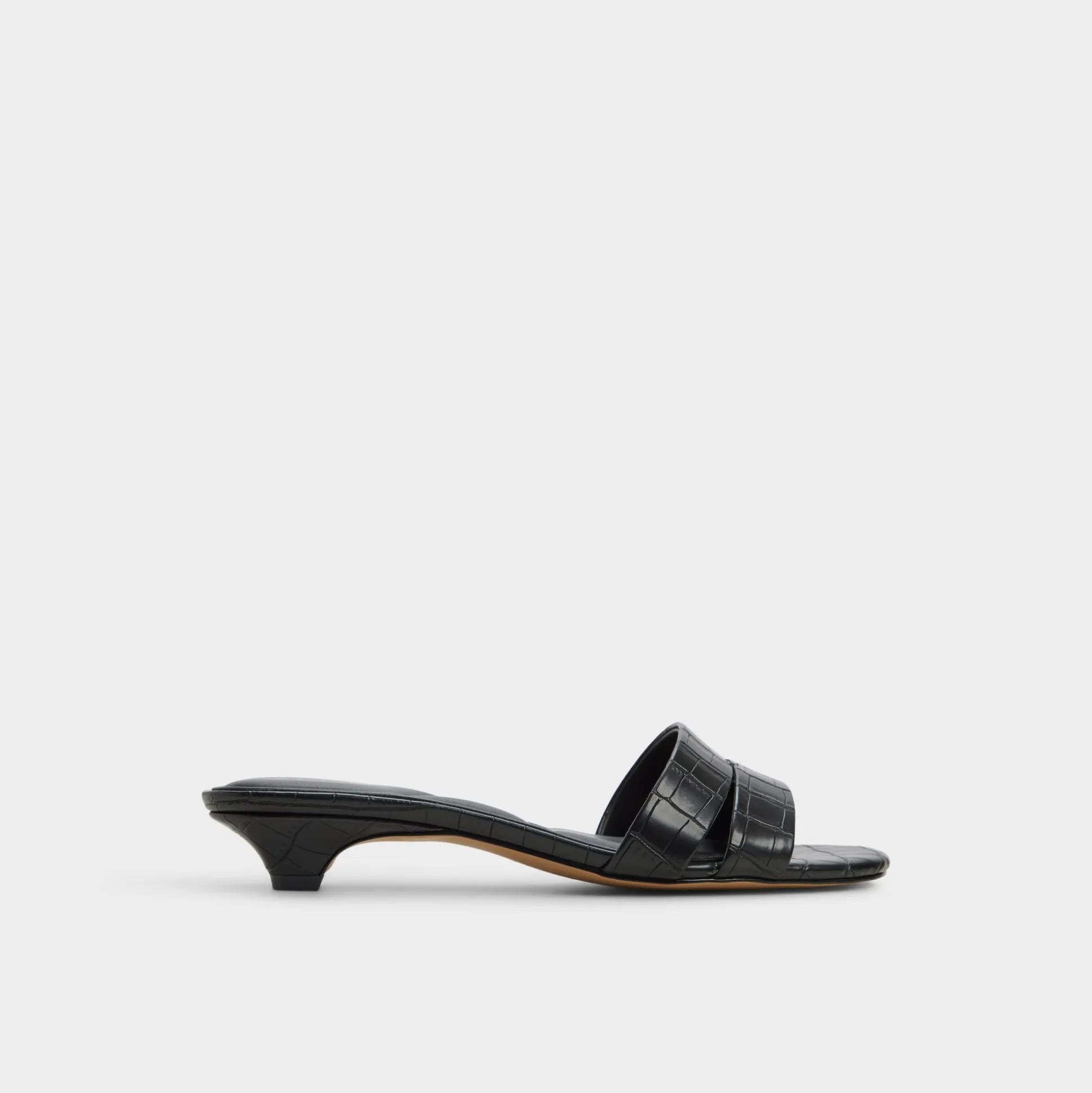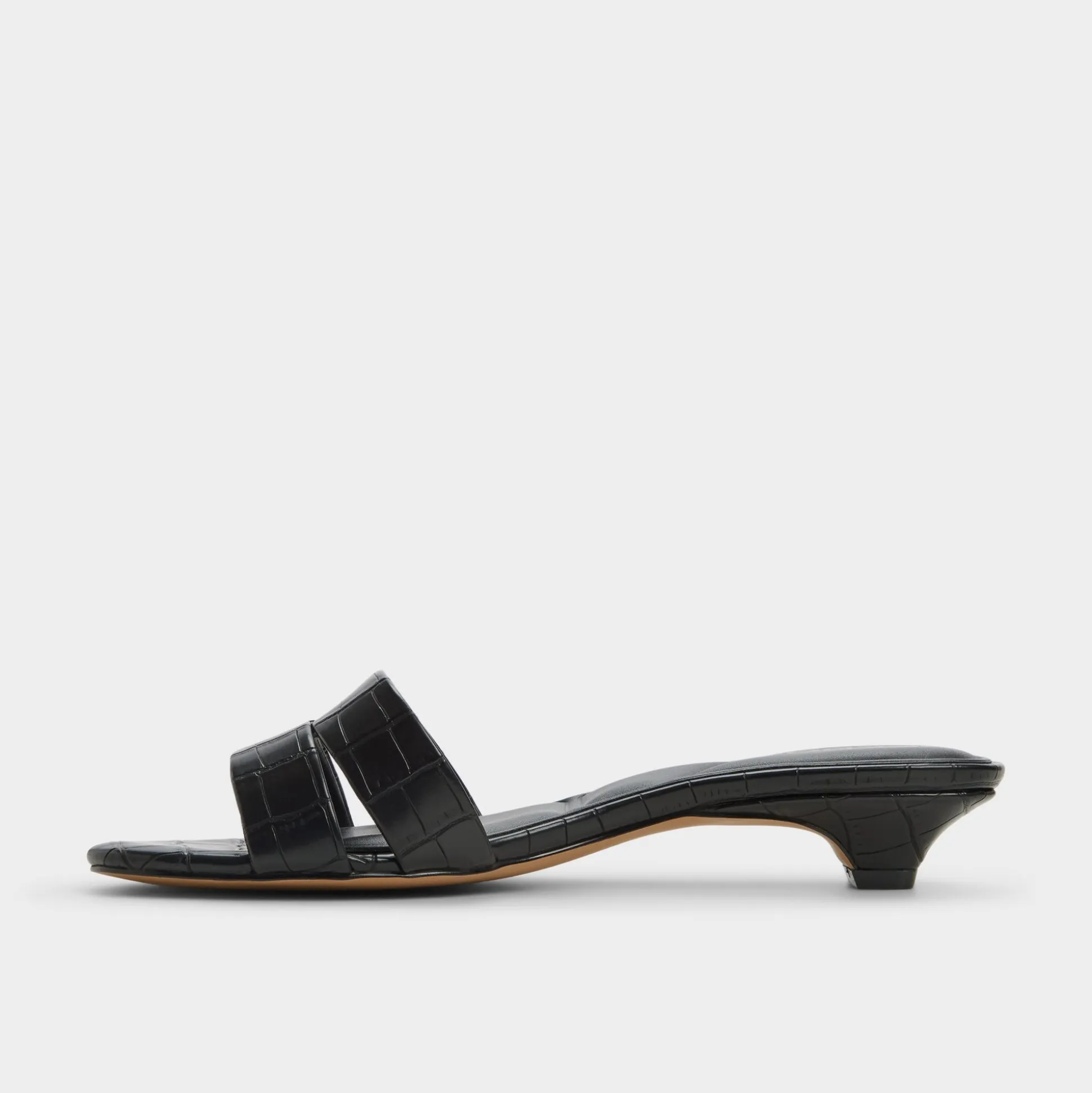 Glossy croc-embossed leather shapes this sleek slide, with a kitten heel and square footbed delivering discreet lift for city errands or poolside downtime, a touch of shine that stays refined. Pair with tailored shorts for gallery afternoons, or slide under a satin midi as rooftop cocktails melt into slow dancing.