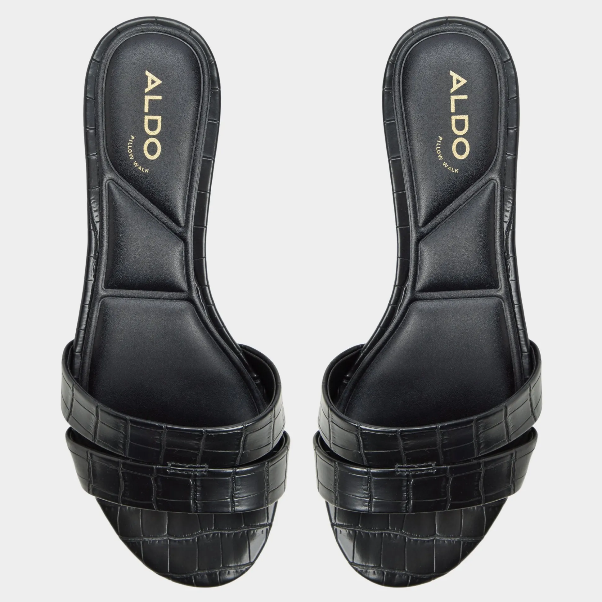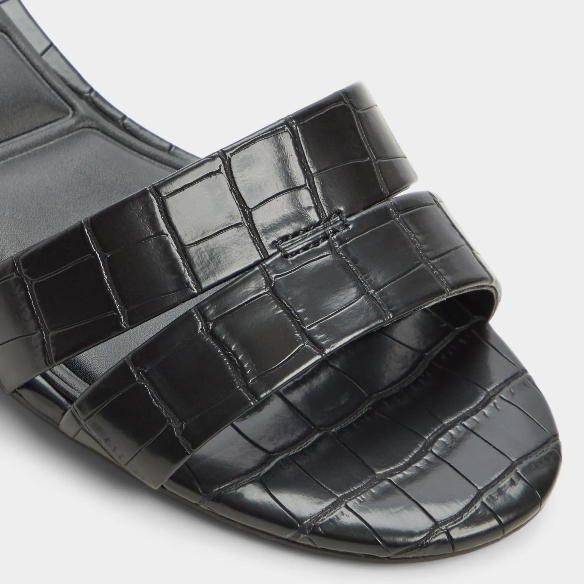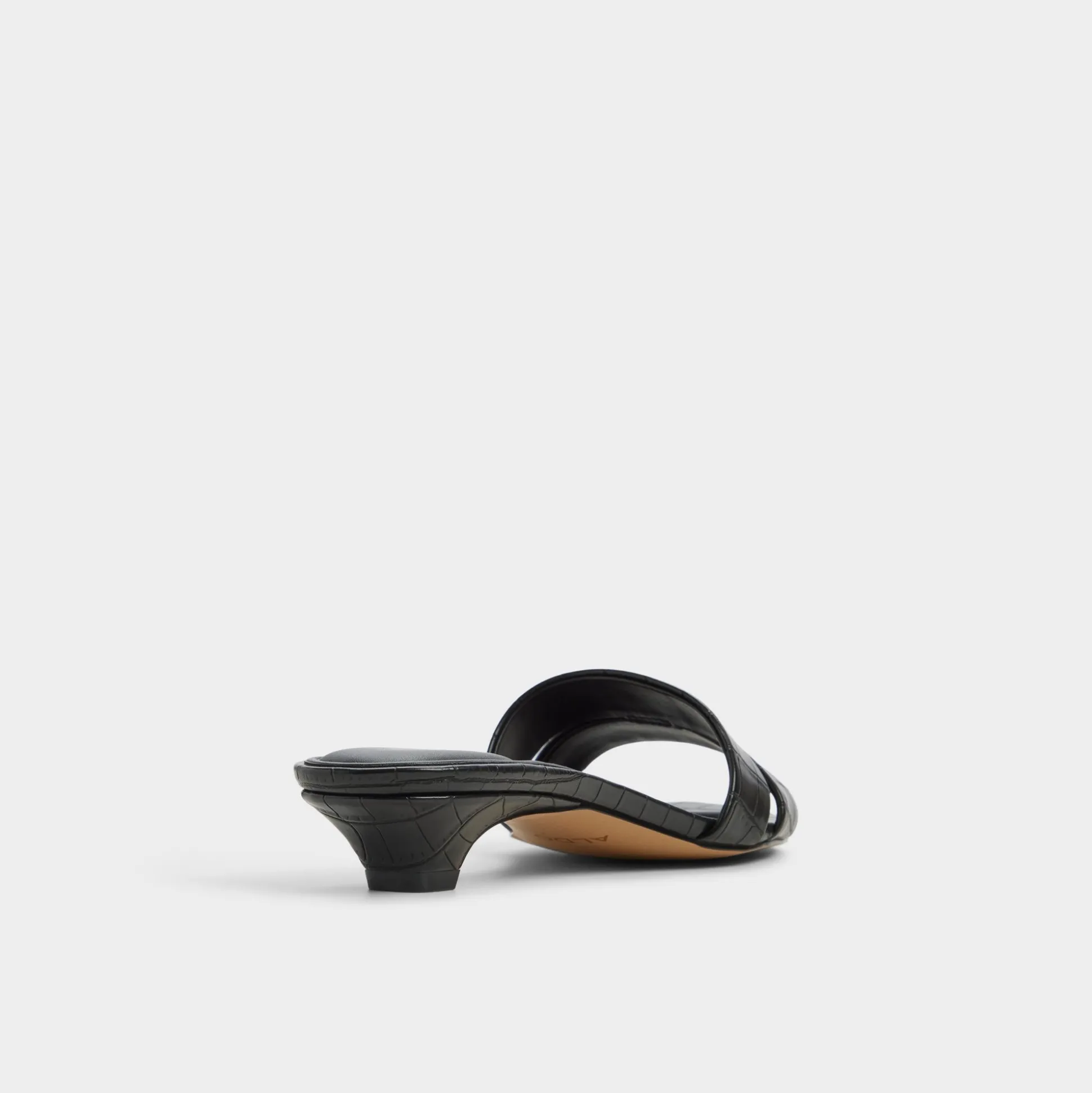 Glossy croc-embossed leather shapes this sleek slide, with a kitten heel and square footbed delivering discreet lift for city errands or poolside downtime, a touch of shine that stays refined. Pair with tailored shorts for gallery afternoons, or slide under a satin midi as rooftop cocktails melt into slow dancing.